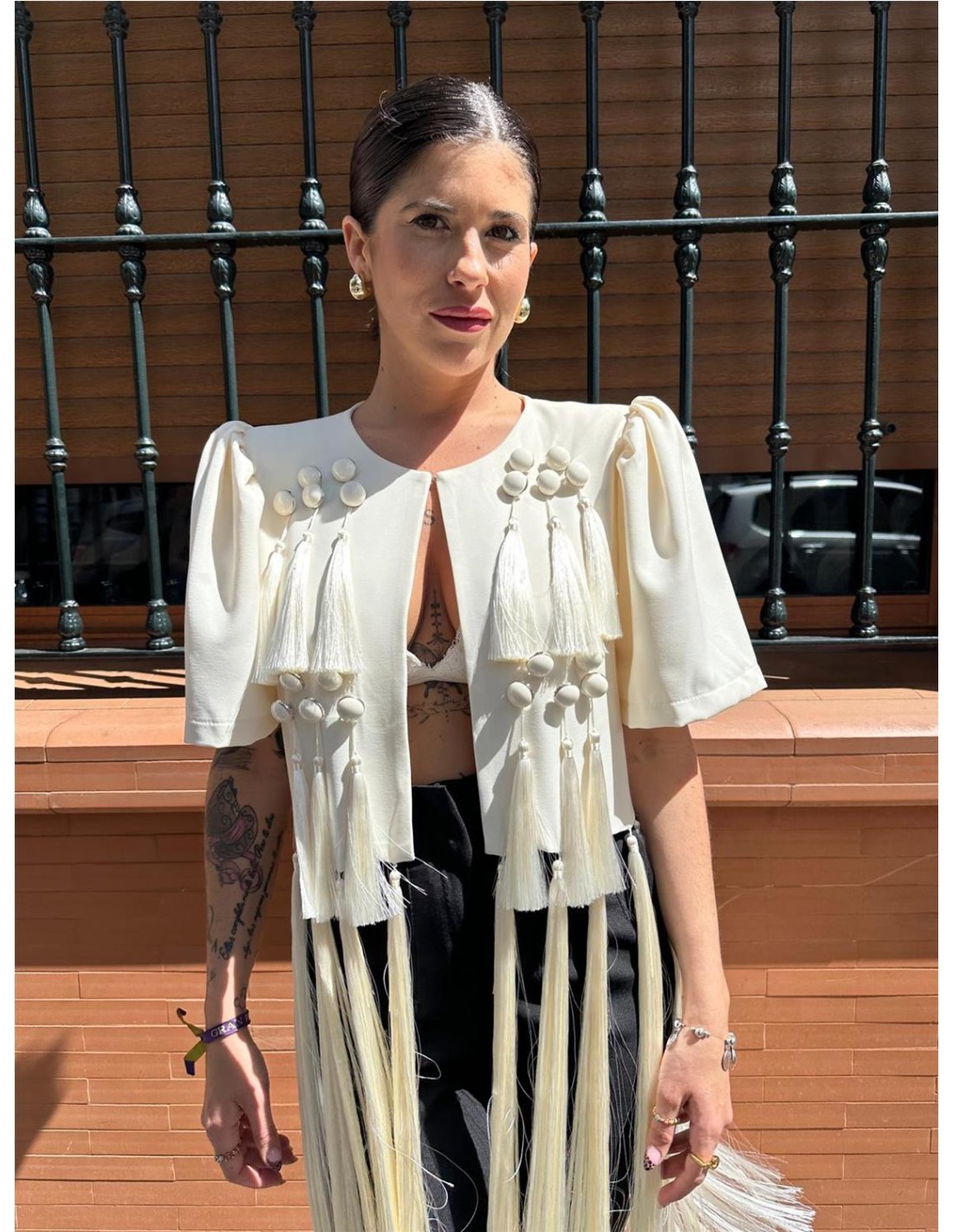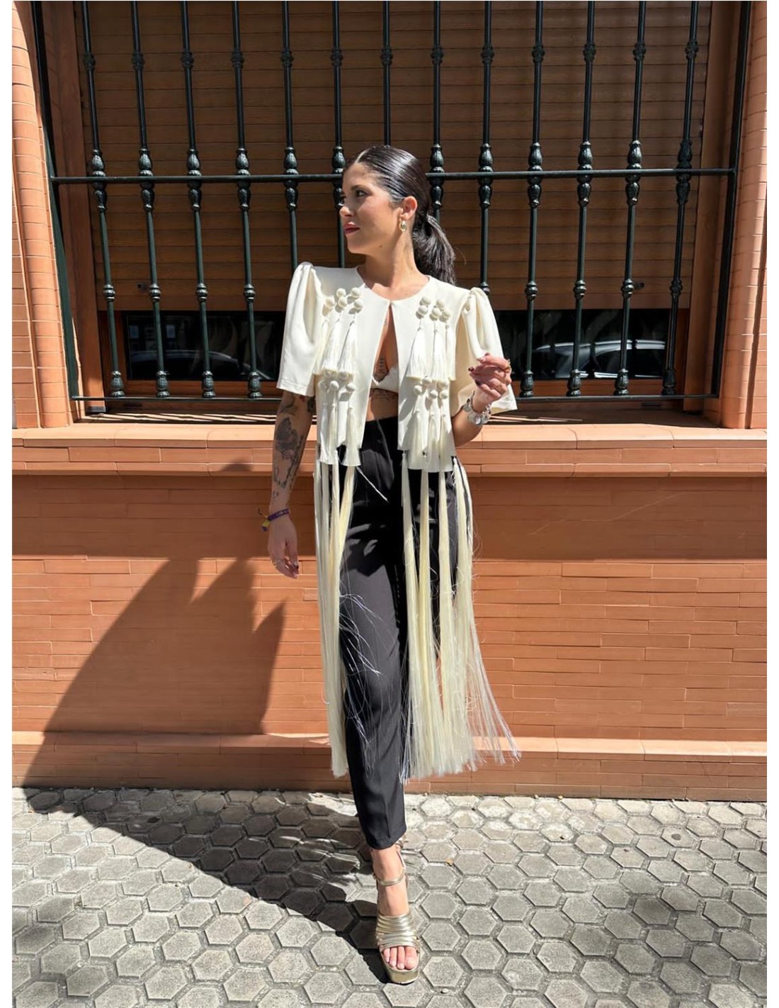Chaqueta de flecos, con adornos, estilo torera, mangas largas. Tallas S/M: (36/38) Y M/L (40/42) aproximadamente.