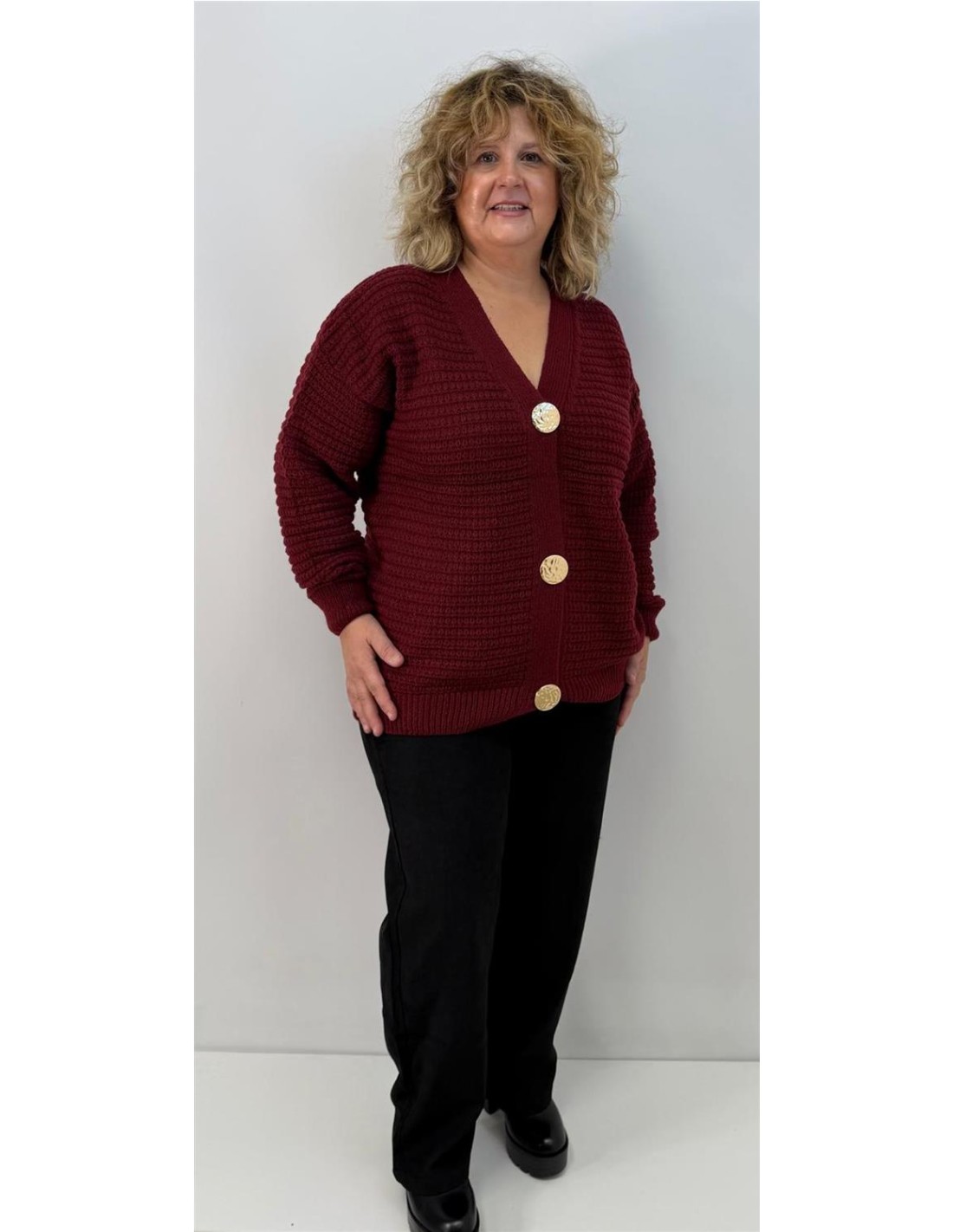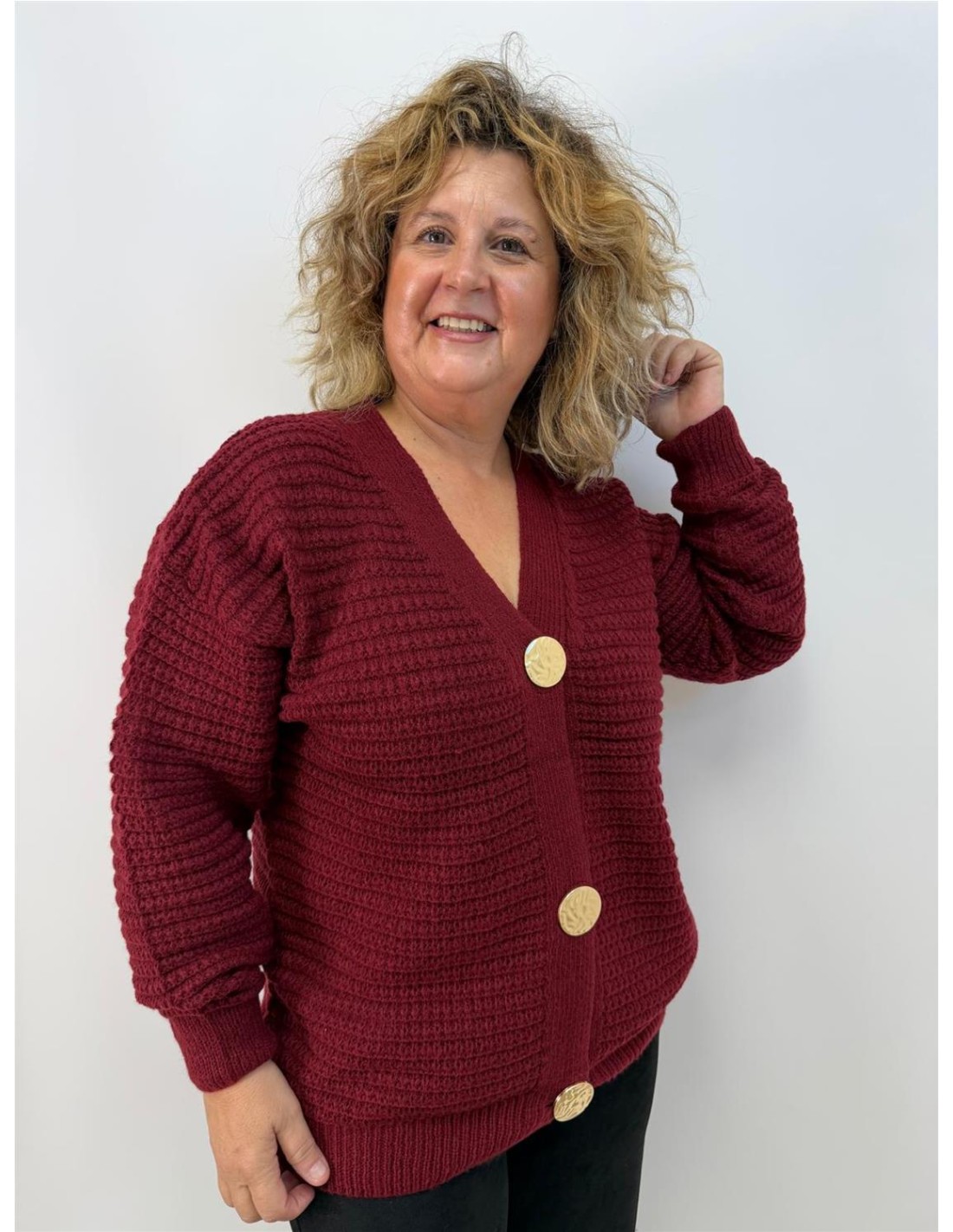 Rebeca lana con botones dorados con cinturiña. Su talla va desde una 36 hasta una 48 aproximadamente.
