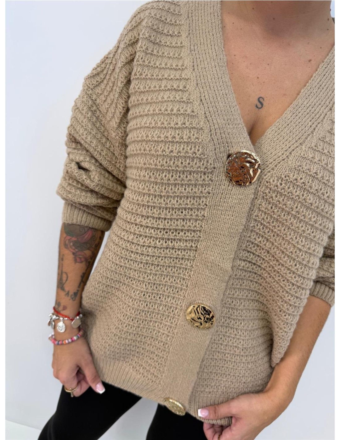 Rebeca lana con botones dorados con cinturiña. Su talla va desde una 36 hasta una 48 aproximadamente.