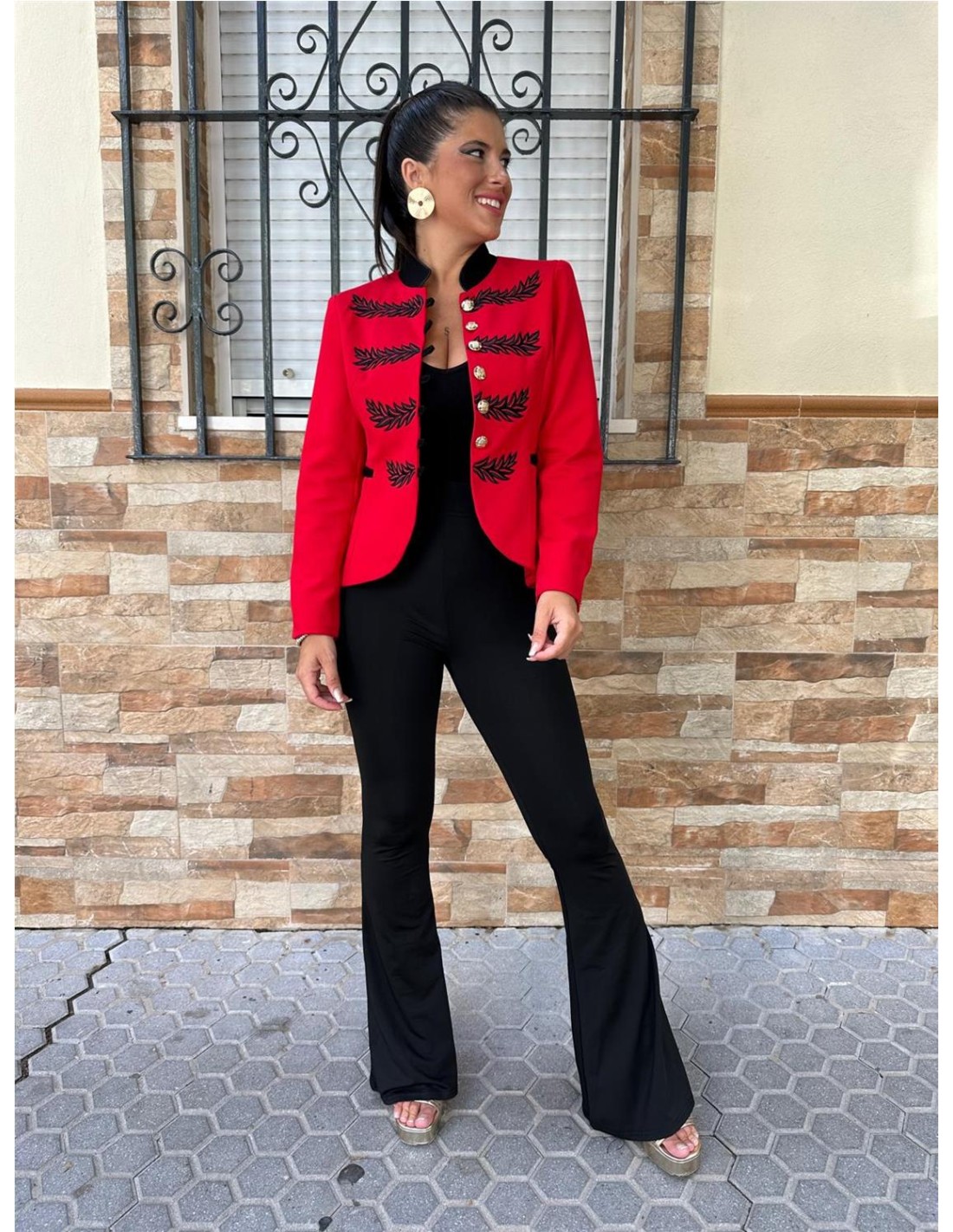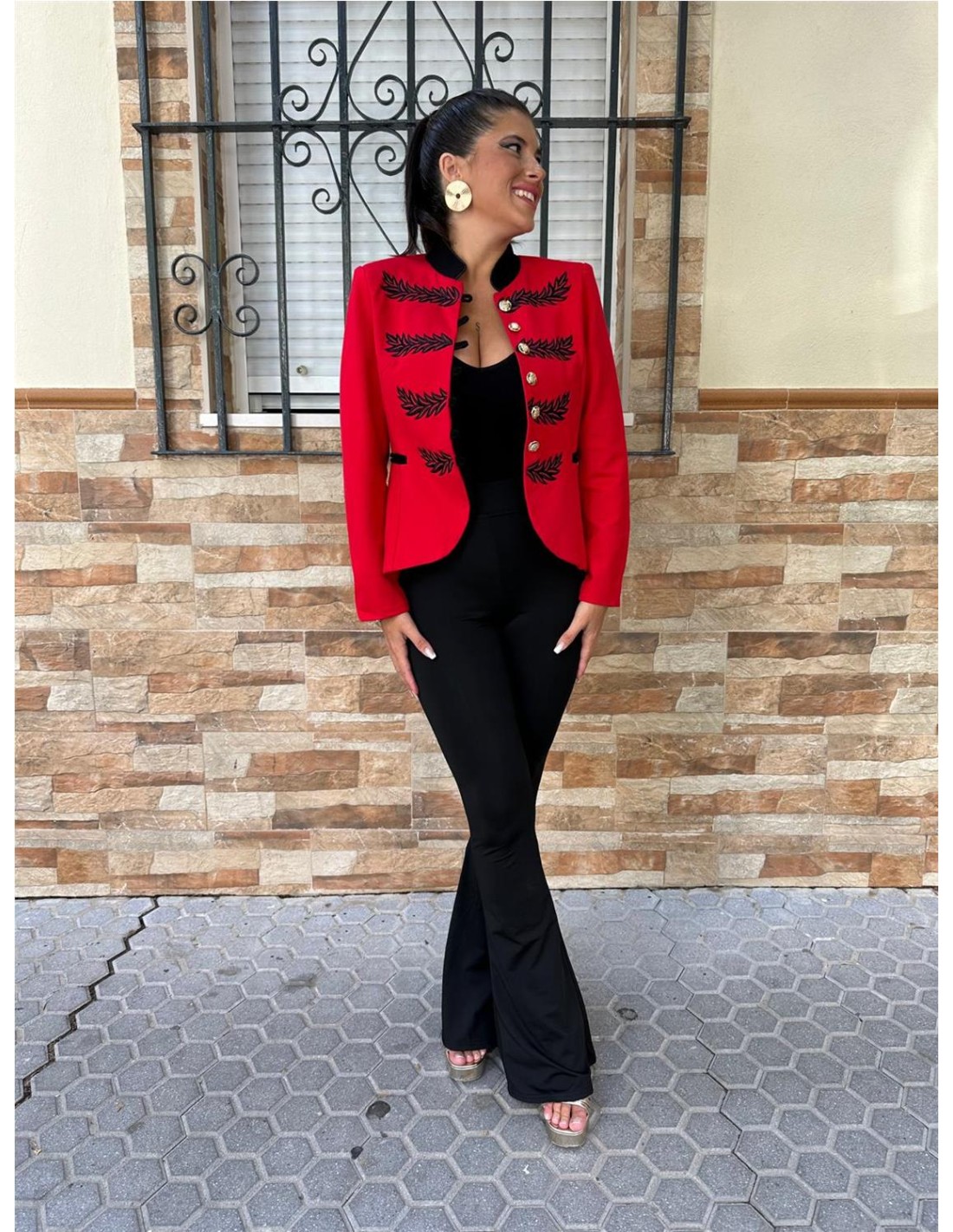 Chaqueta abotonada, mangas largas, con cuello. Sus tallas son S (36), M (38), L (40-42).