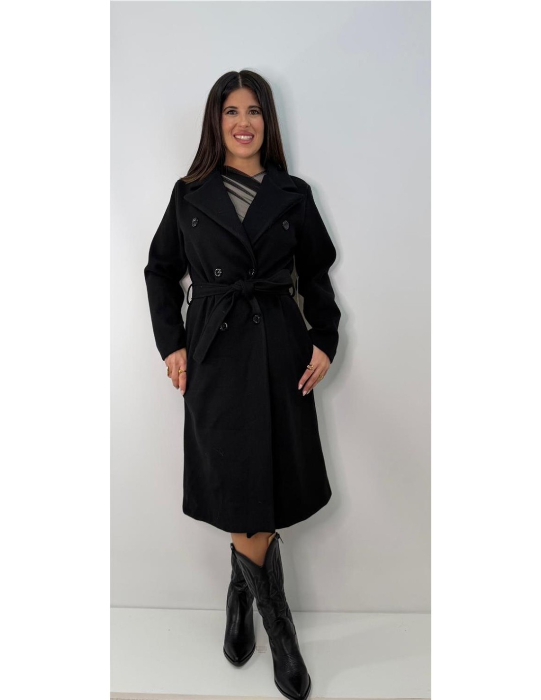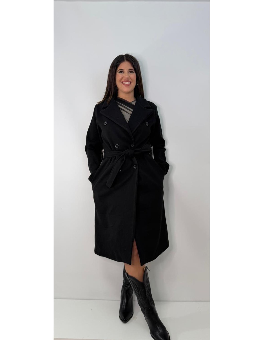 Abrigo de paño y botones en color negro, bolsillos y cinturon de paño, no inclulle cuello de pelos. Talla unica 34 a 42 aprox