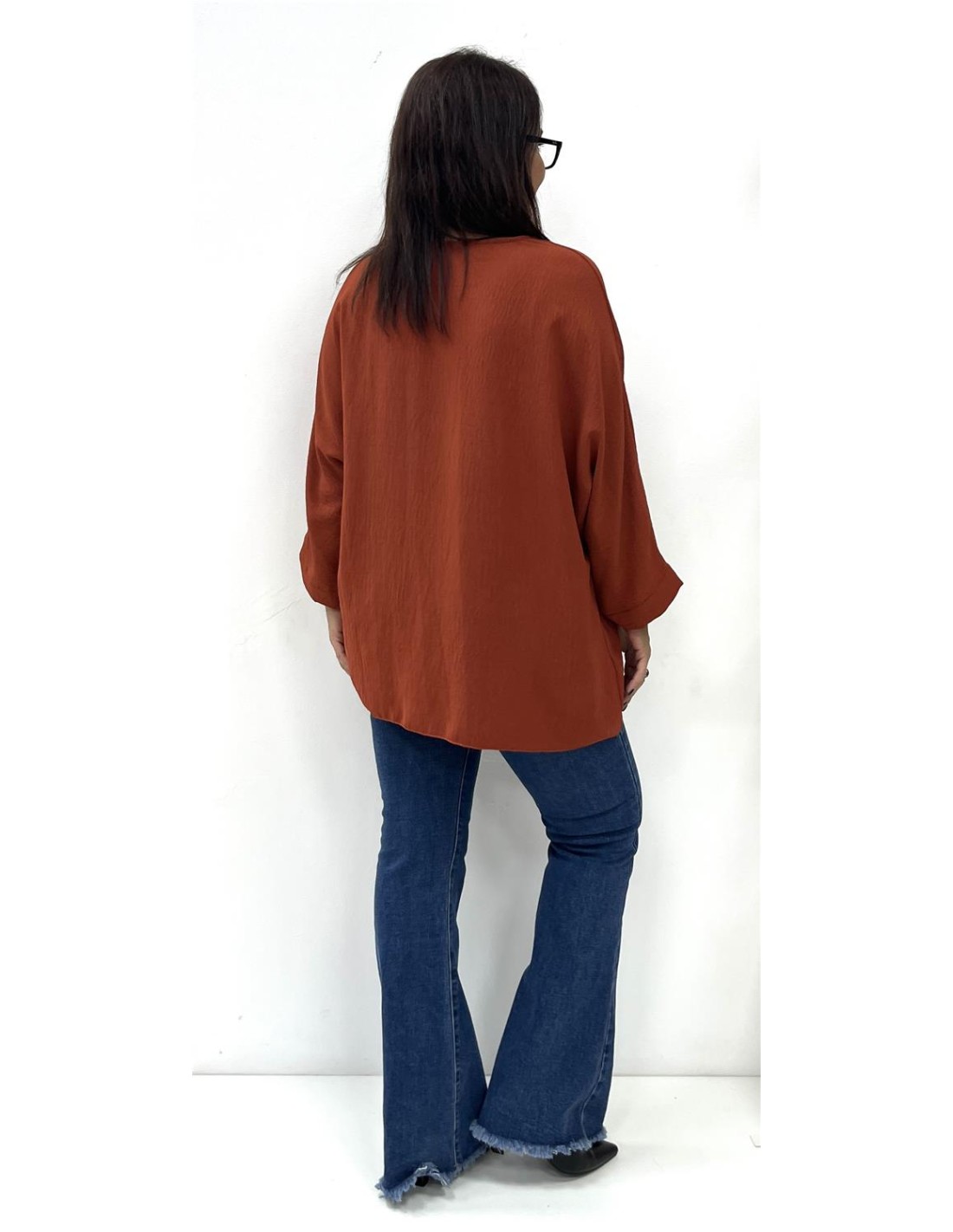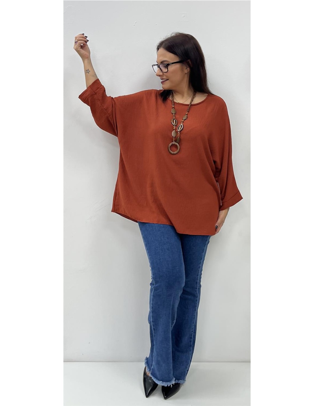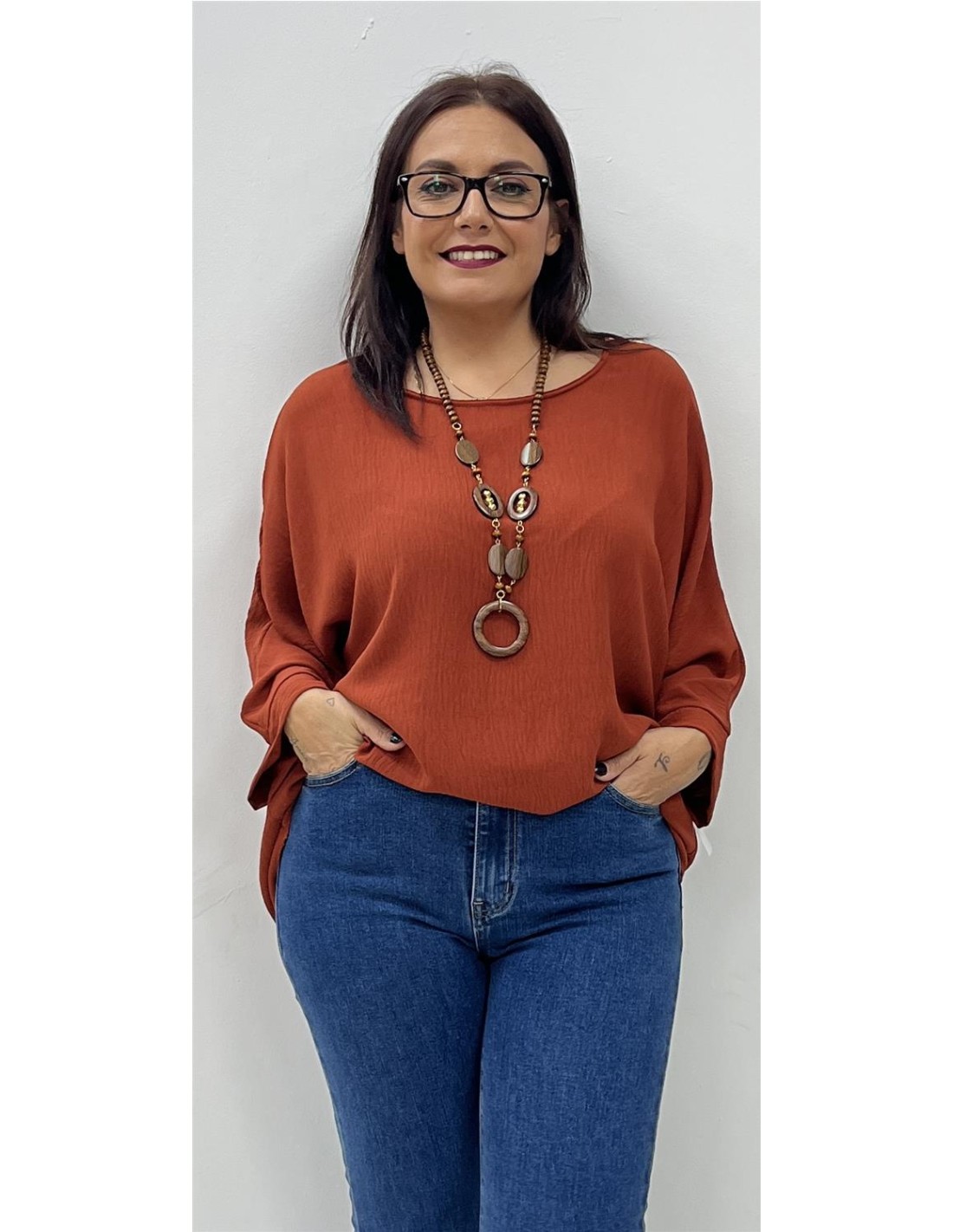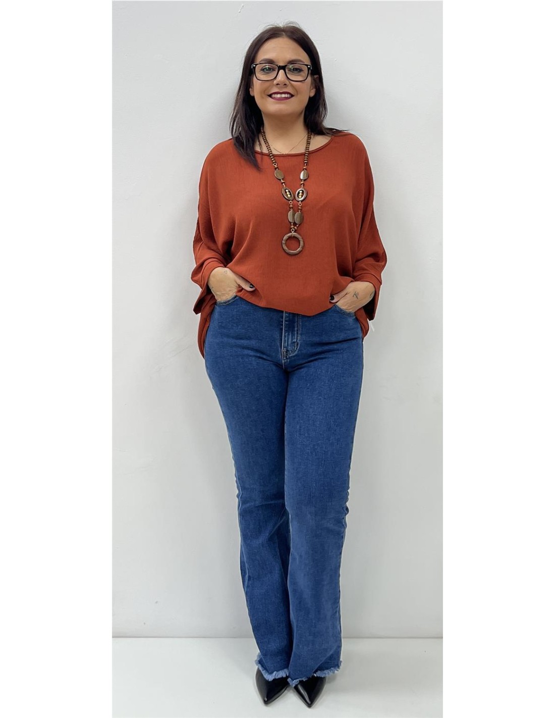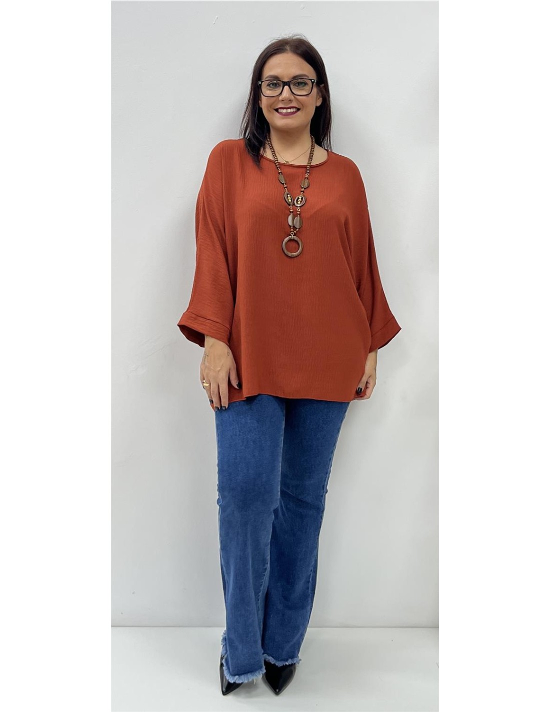 Cuerpo de media manga y cuello redondo. Su talla puede dar desde una 40 hasta una 46. Combinado con el pantalón ZAIRA