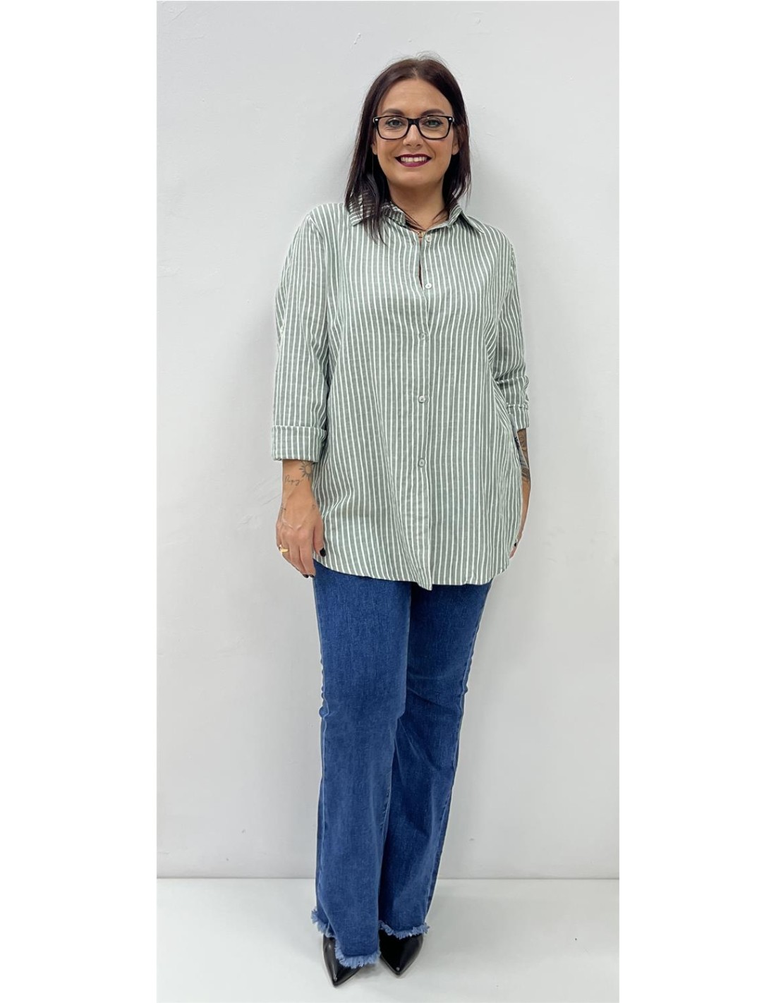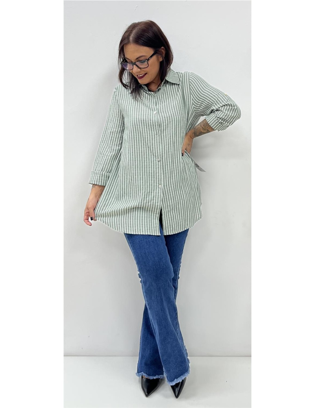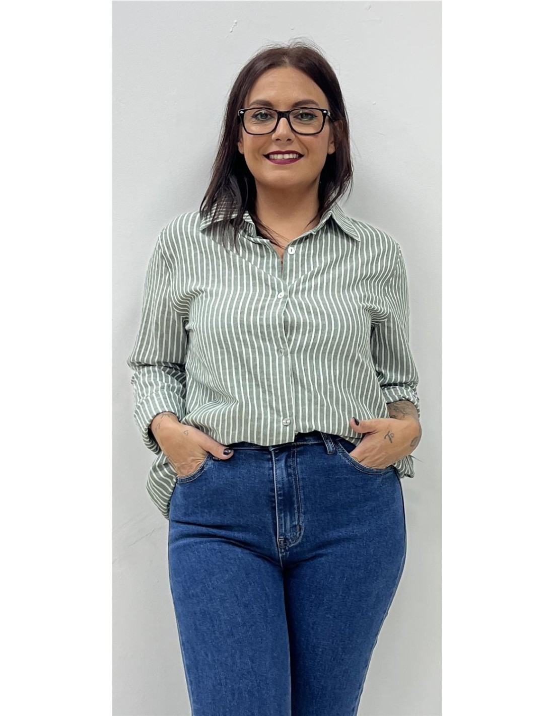 Camisa abotonada de rayas y manga larga. Sus tallas son: S-M(36-40) y L-XL(40-44). Combinada con el pantalón ZOE