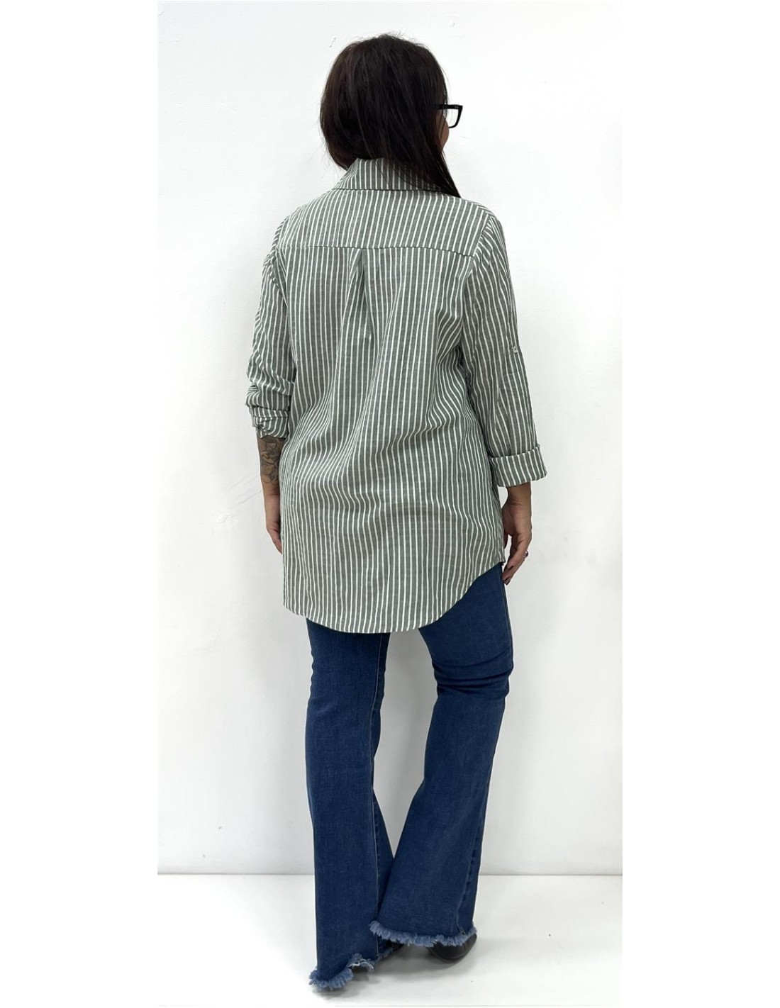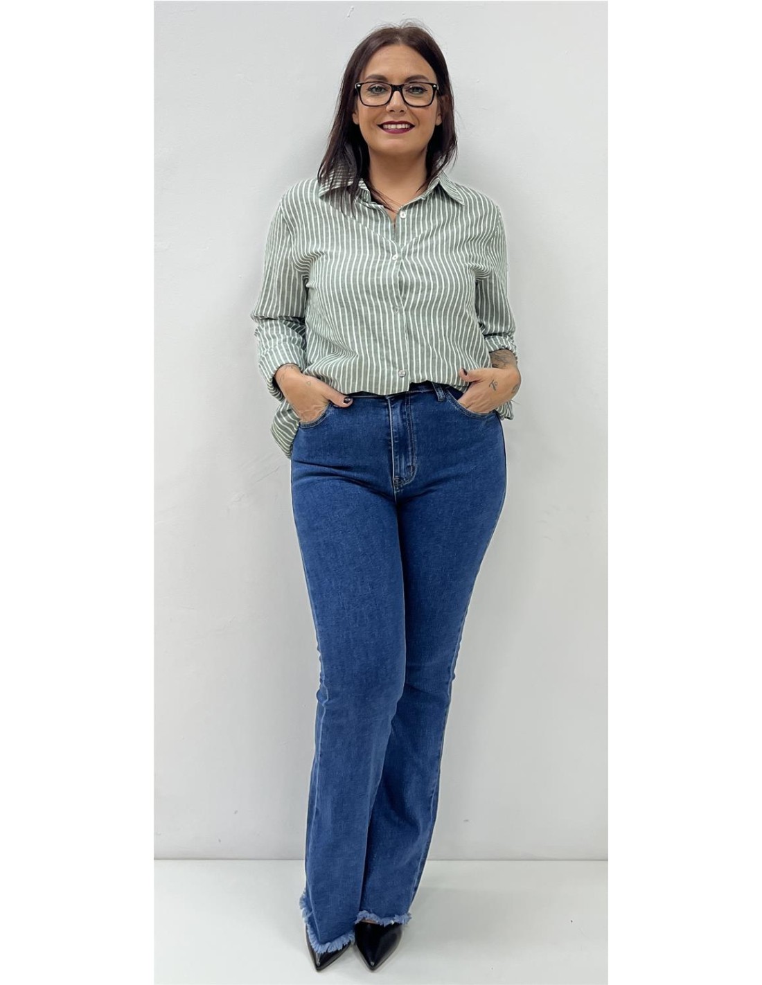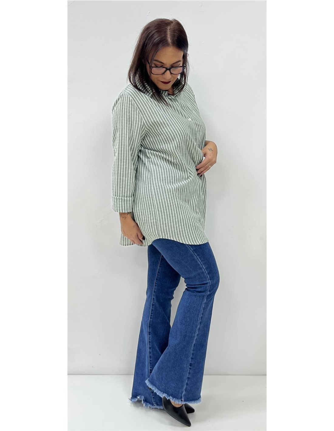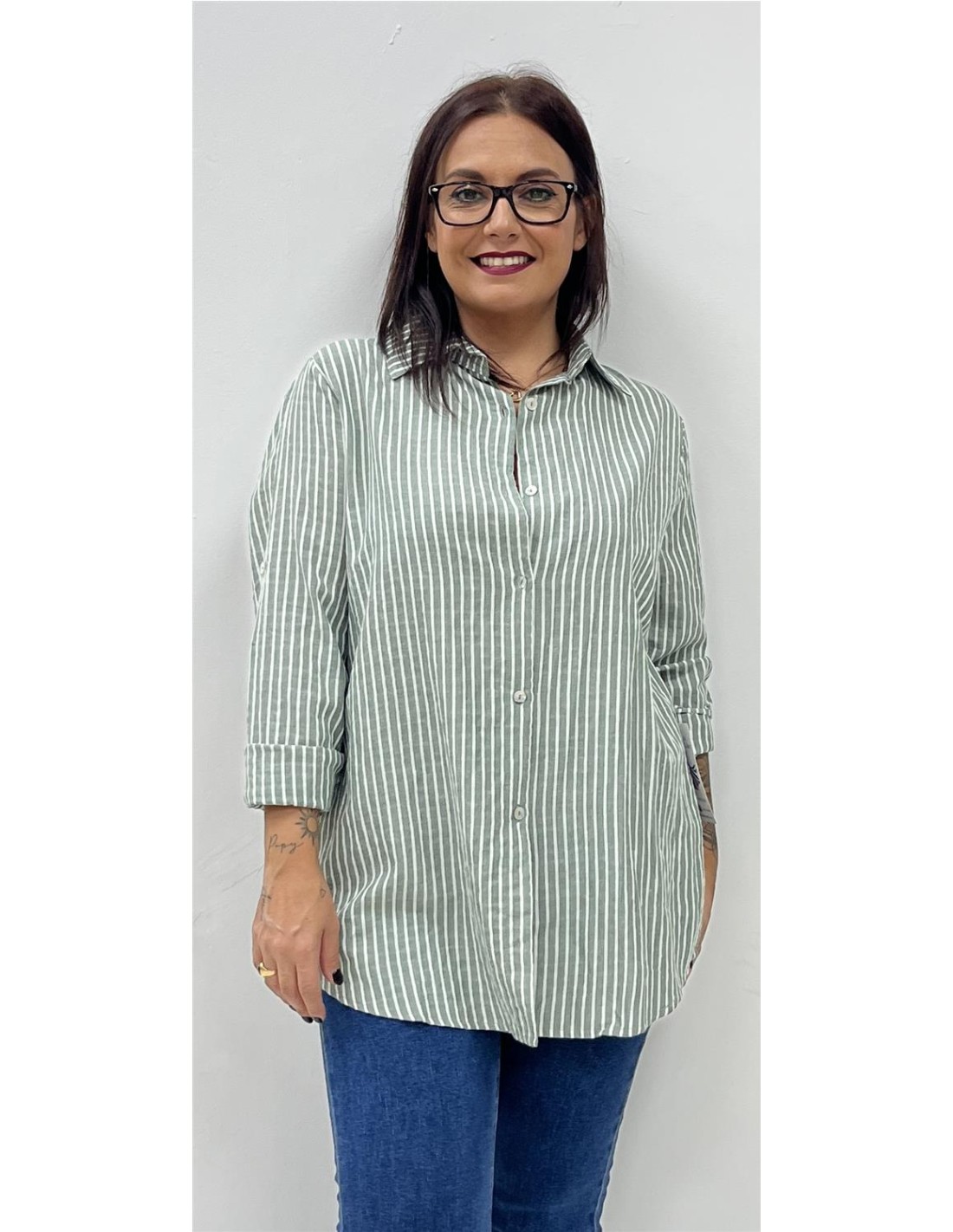 Camisa abotonada de rayas y manga larga. Sus tallas son: S-M(36-40) y L-XL(40-44). Combinada con el pantalón ZOE