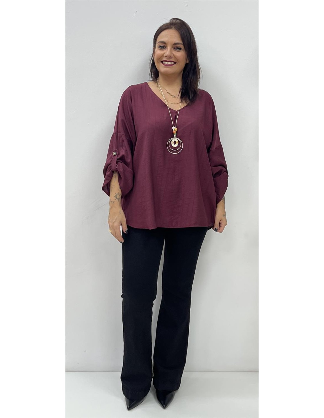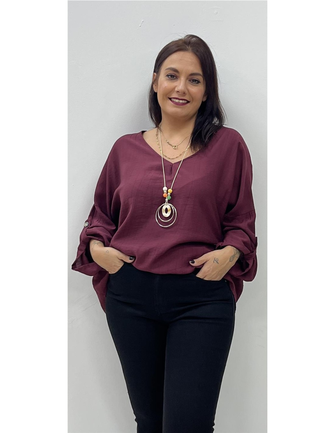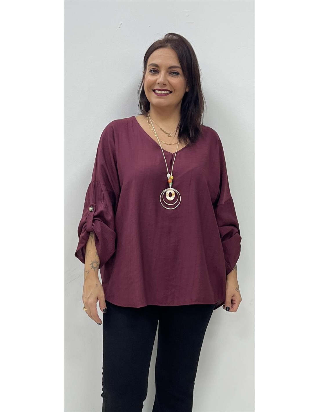 Camisa con cuello pico y botón en la manga. Su talla puede dar desde una 38 hasta una 46. Combinada con el bolso BL45-706