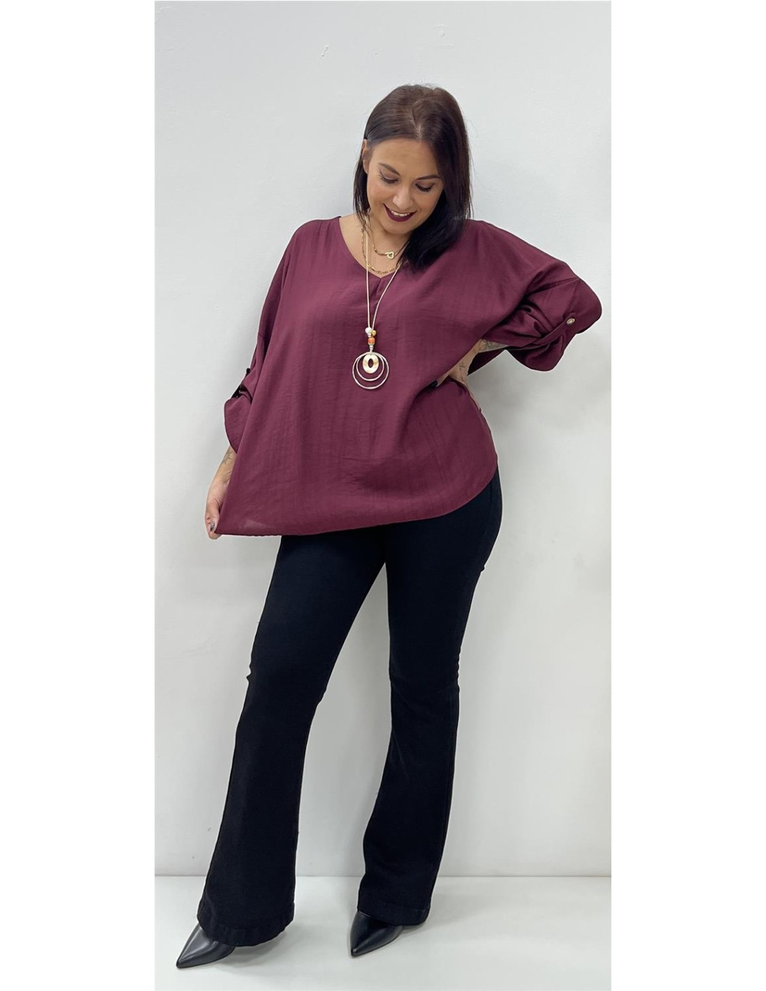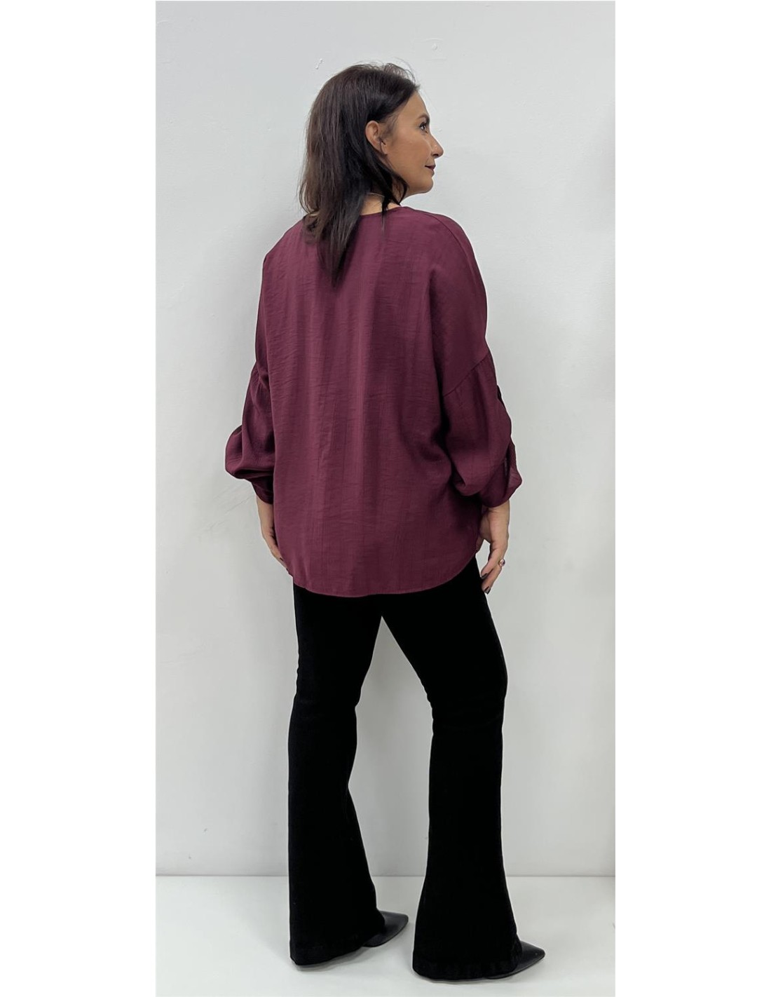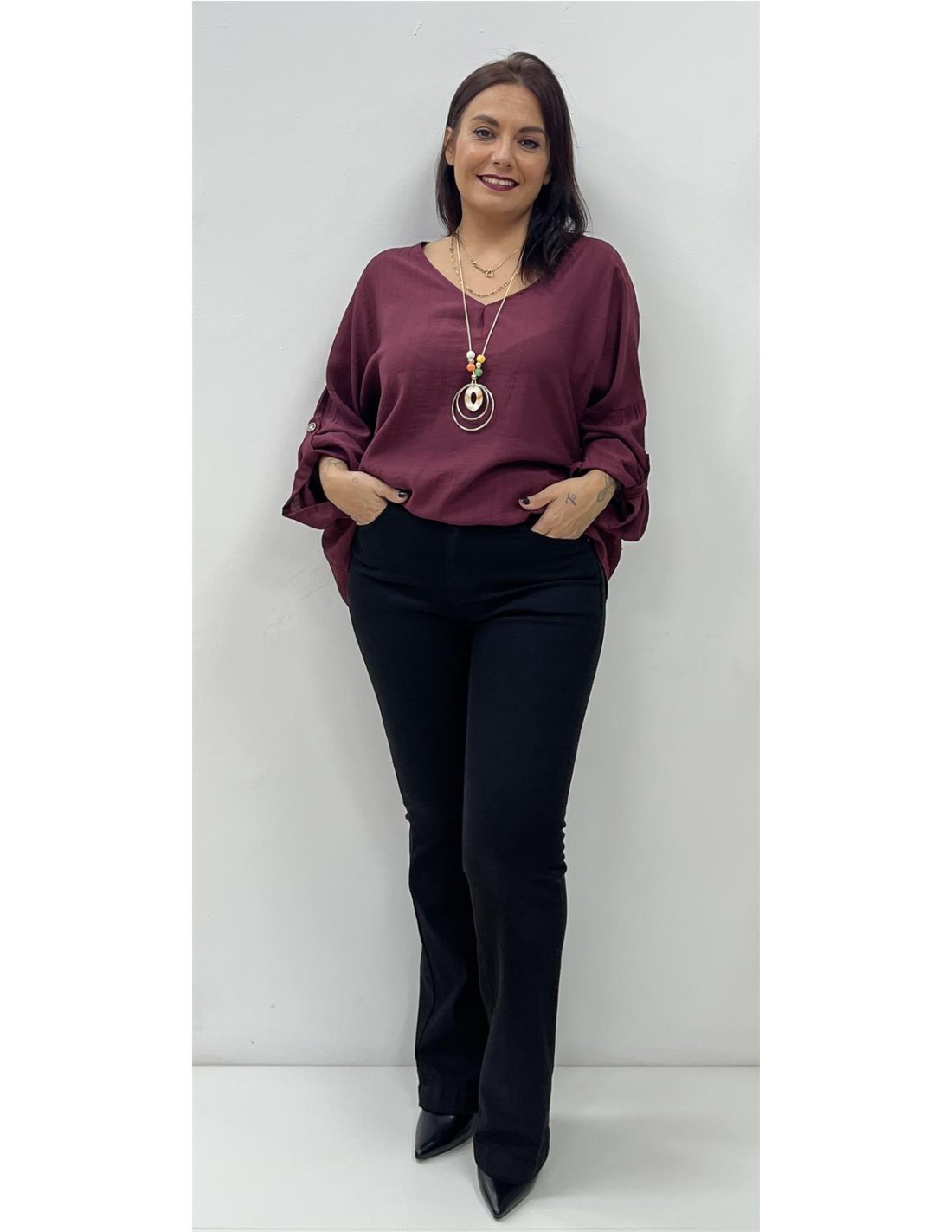 Camisa con cuello pico y botón en la manga. Su talla puede dar desde una 38 hasta una 46. Combinada con el bolso BL45-706