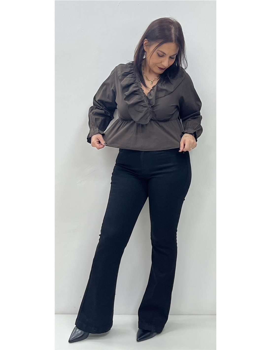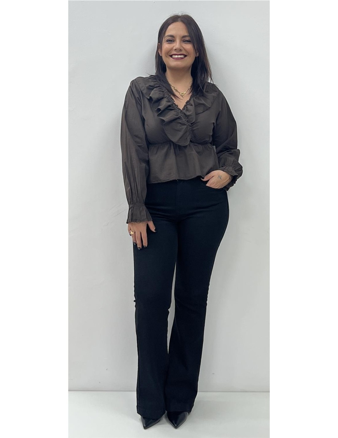 Escote cruzado con volante. Su talla va desde 34 hasta 38. Combinado con el pantalon zafira.