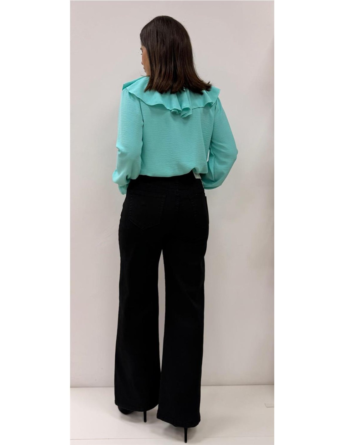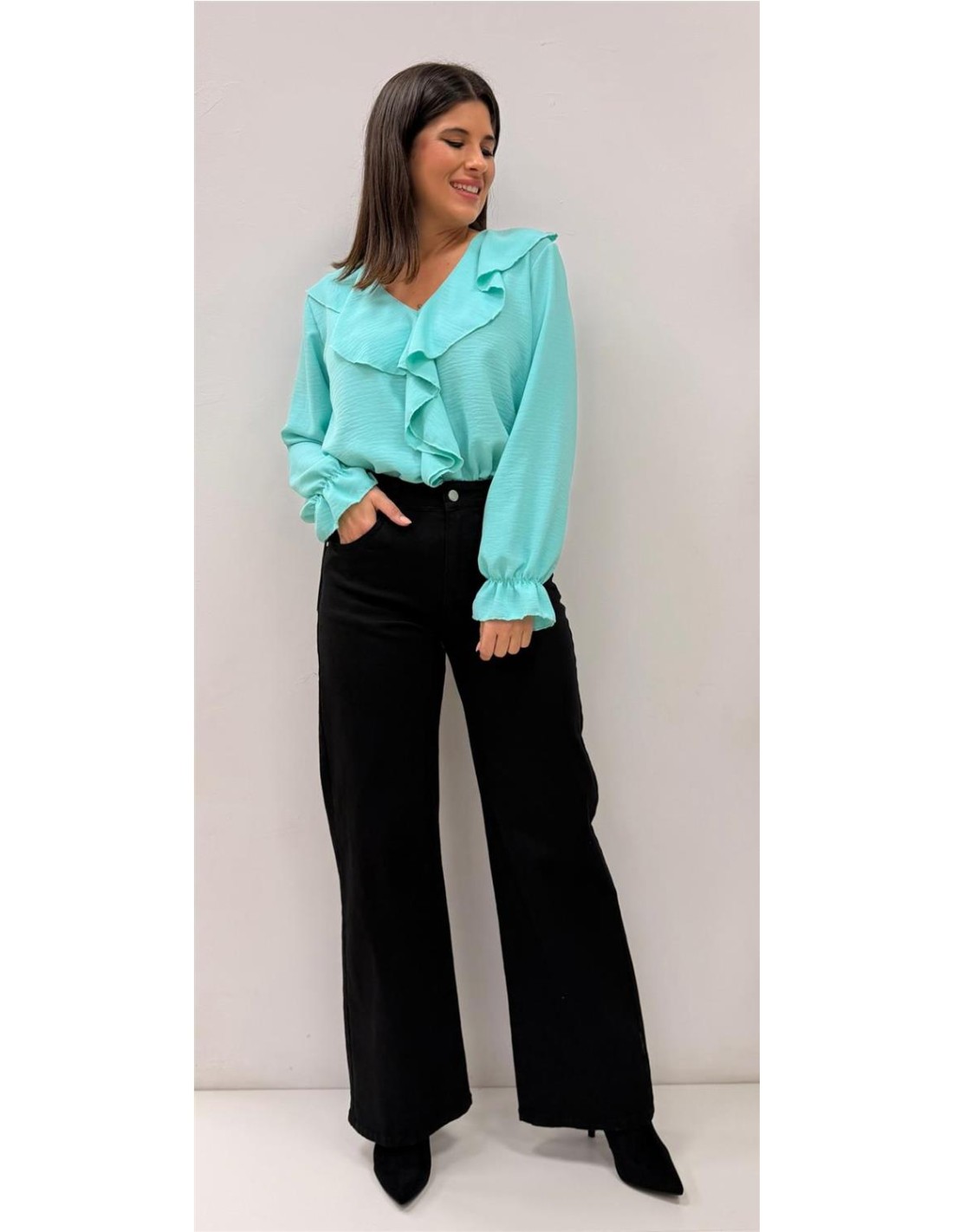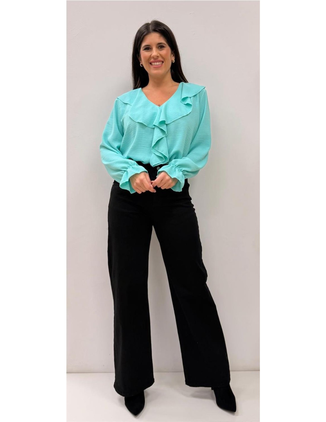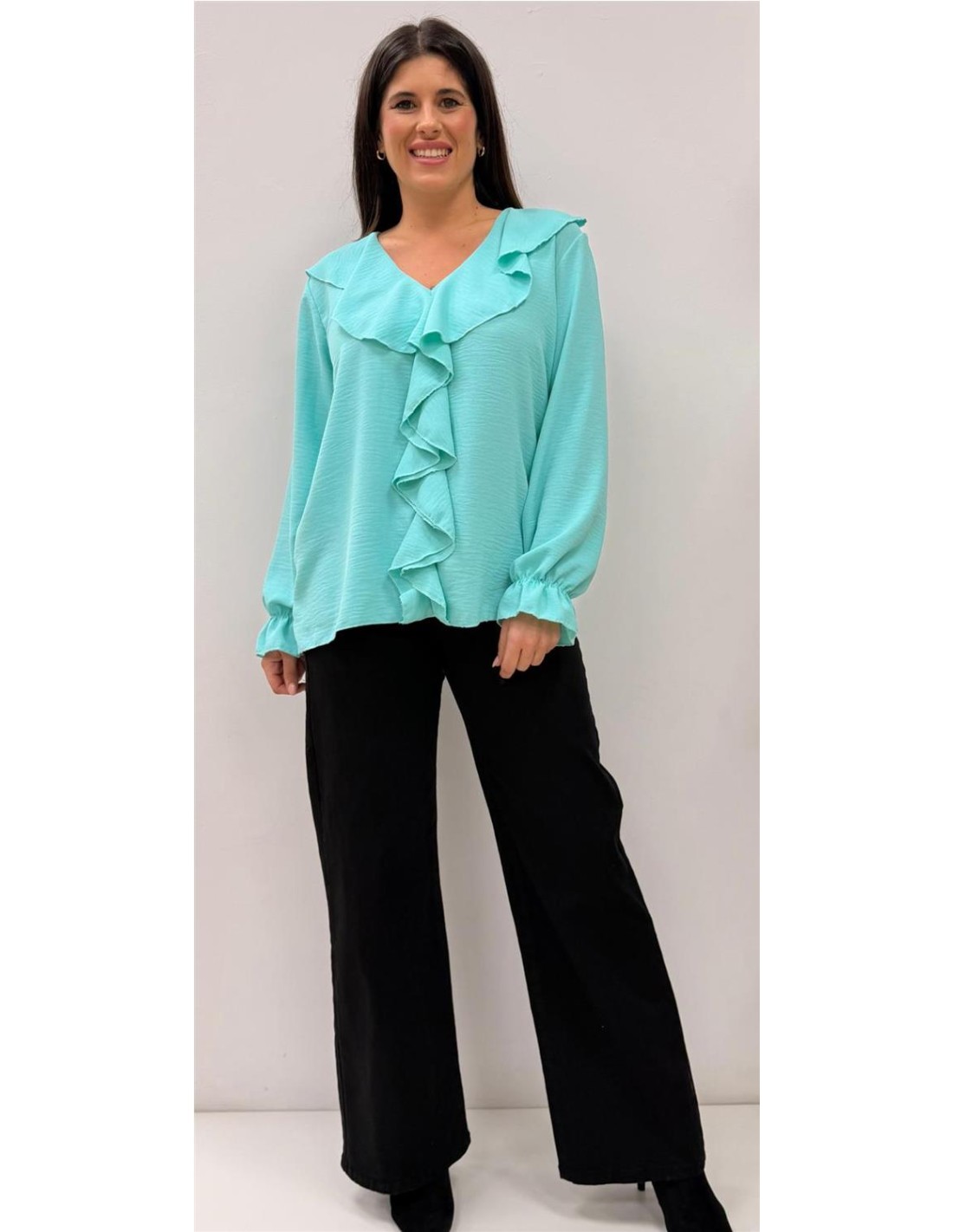 Camisa de mangas largas con volantes en el medio con mangas largas. Talla única da desde una 36 hasta una 42 aproximadamente.