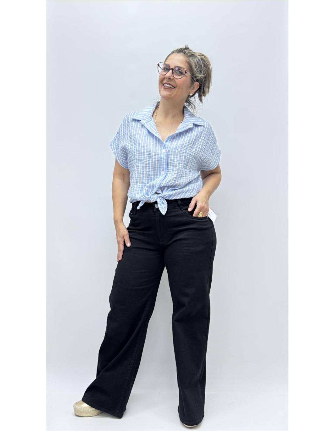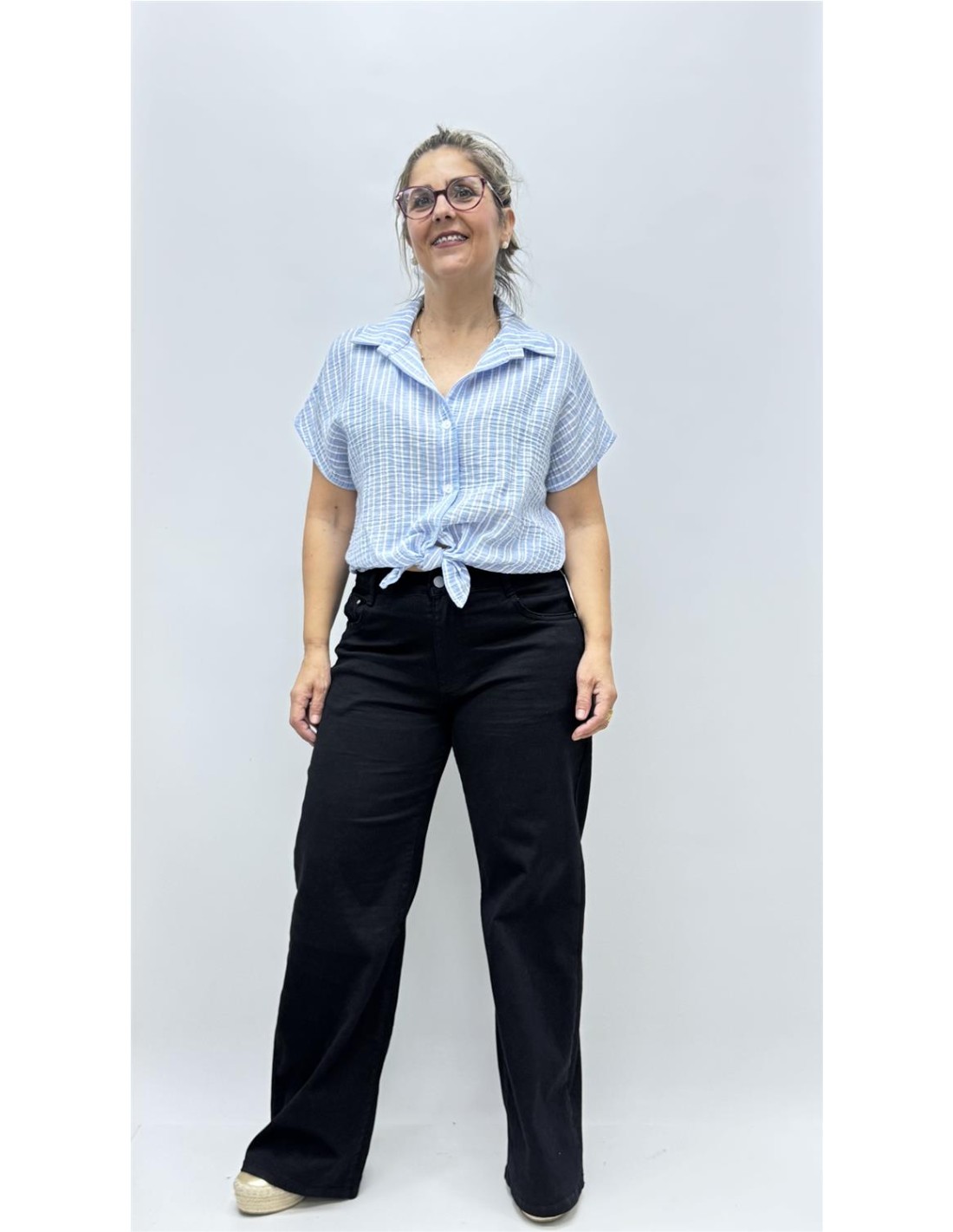 Camisa corta con efecto de bambula de rayas, es talla unica y da desde la 34 hasta la 40.