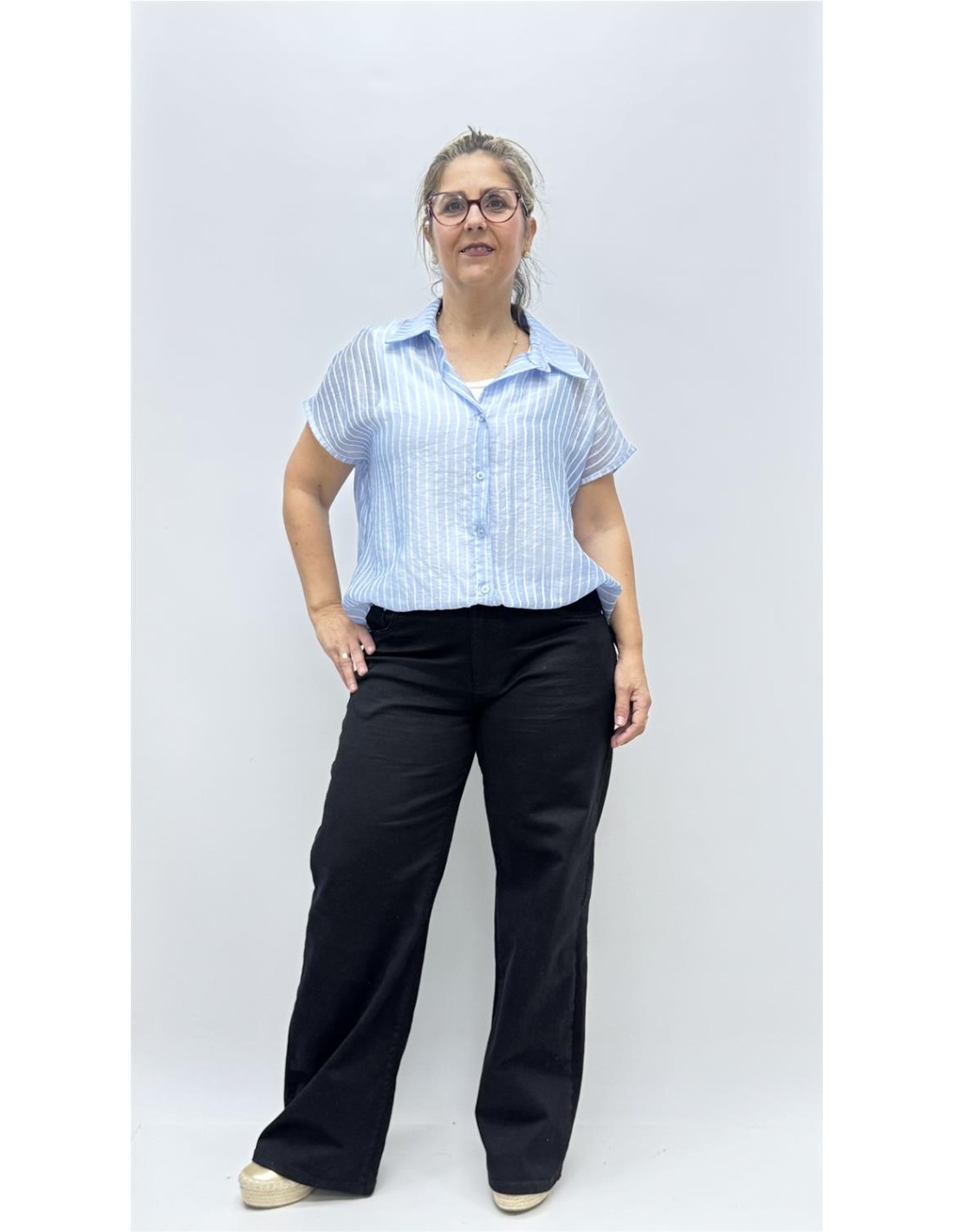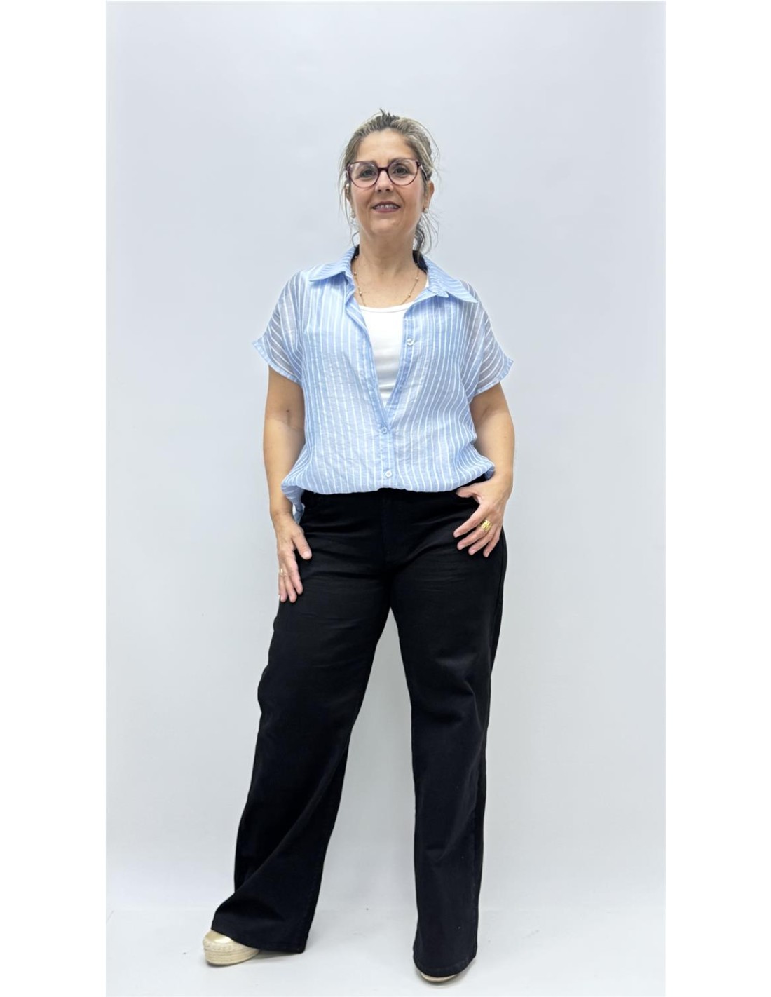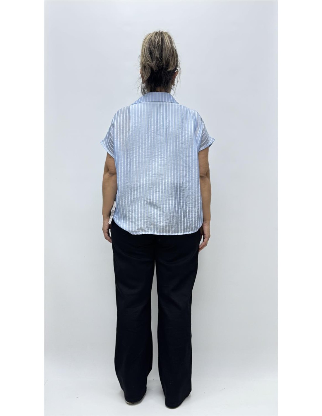 Camisa de gasa de rayas transparente con camiseta interior para que no se vea lo que tu quieras, es de talla unica dando aprox desde la 34 hasta la 40.