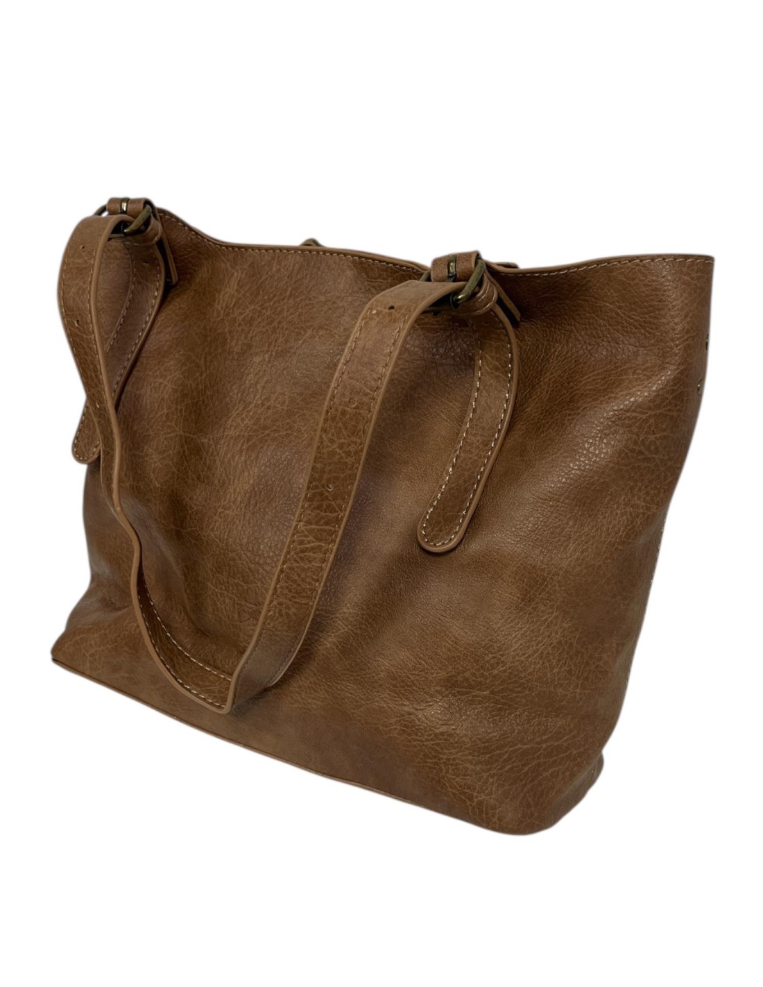 Bolso de cuero, con neceser interior y asa lara y ancha.