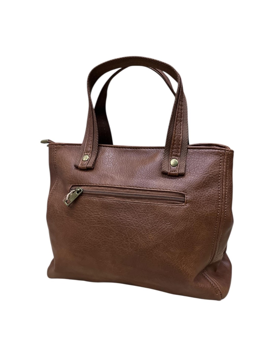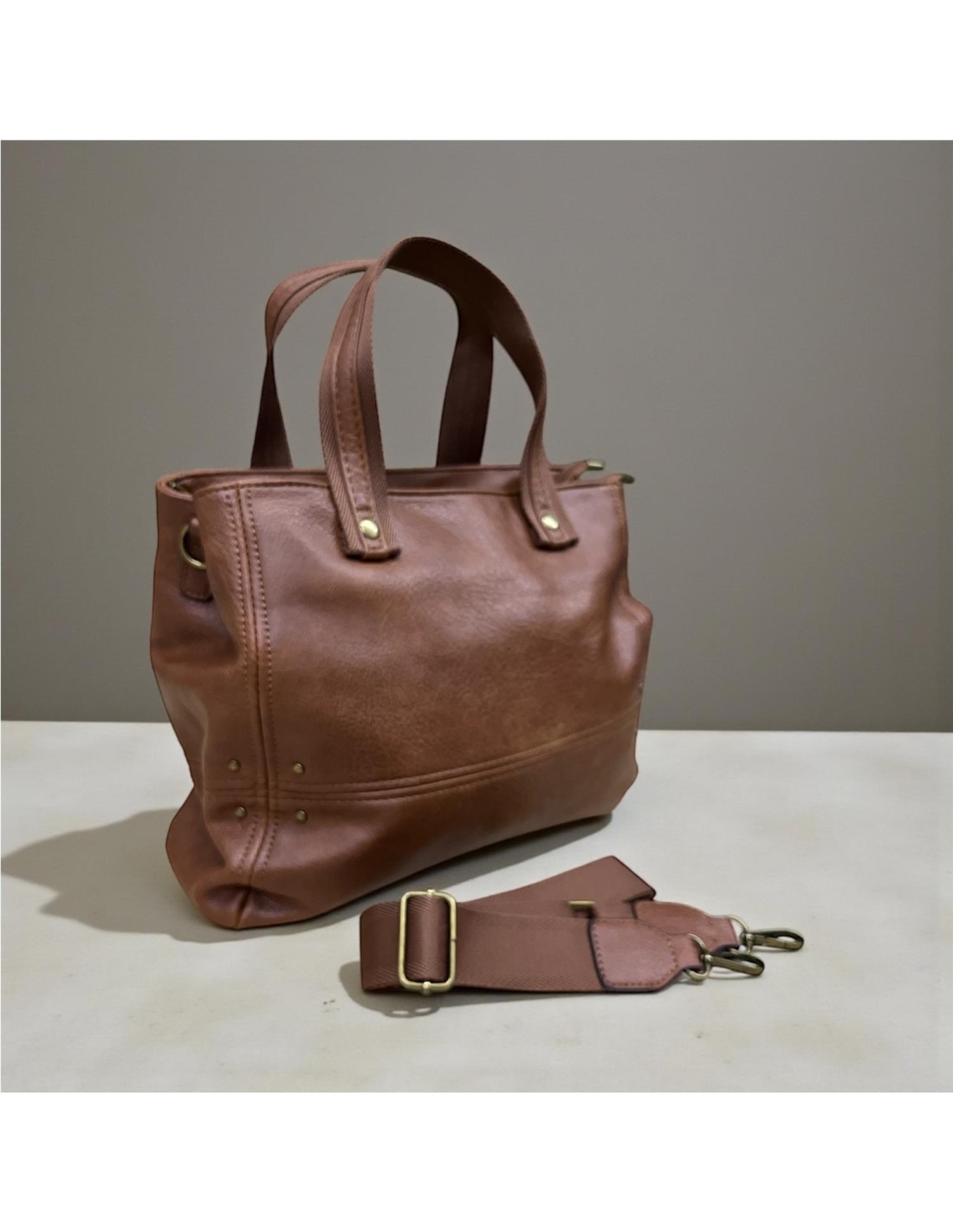 Bolso de cuero, con asa larga y ancha, con tachuelas.
