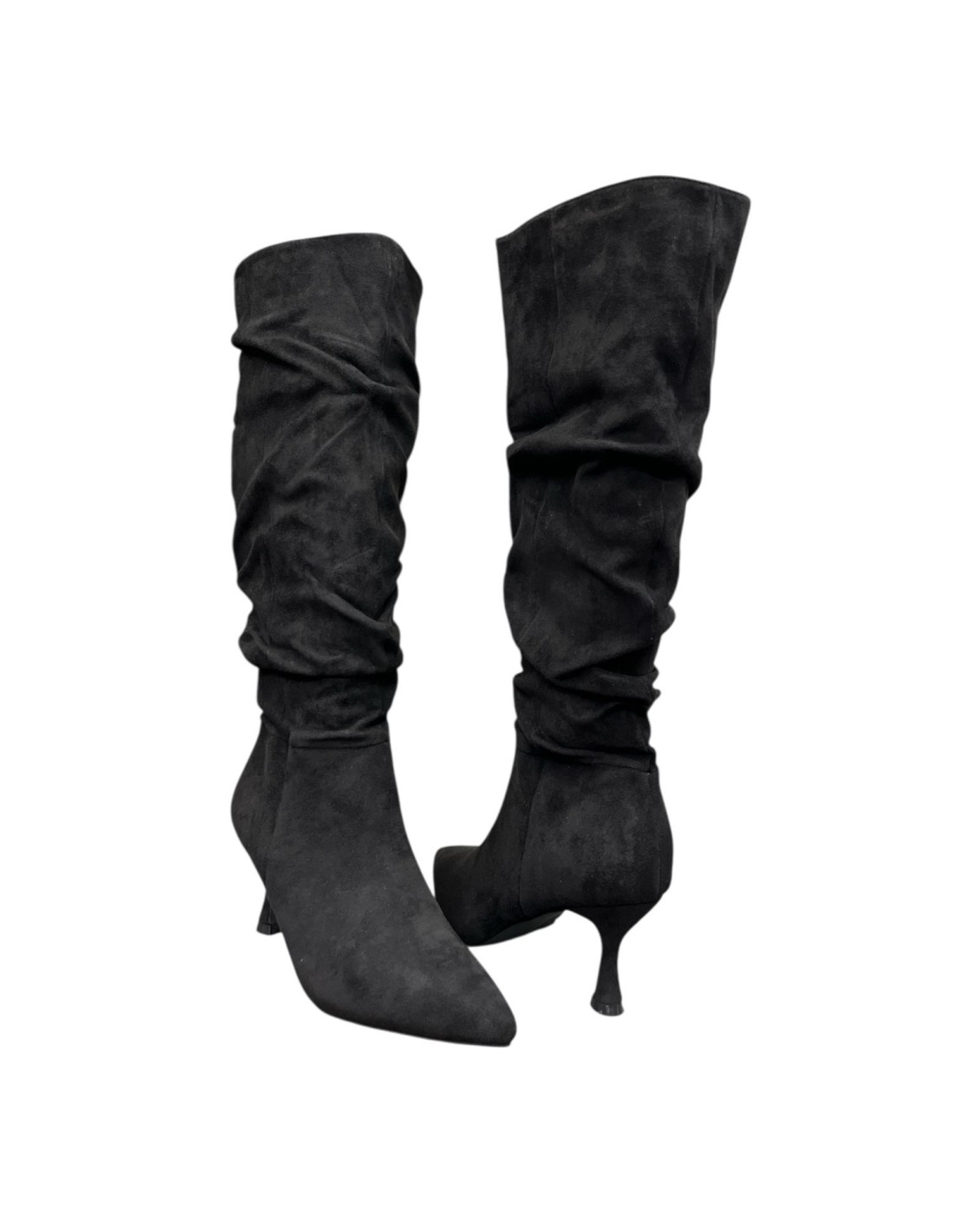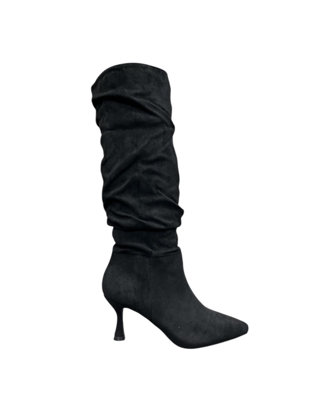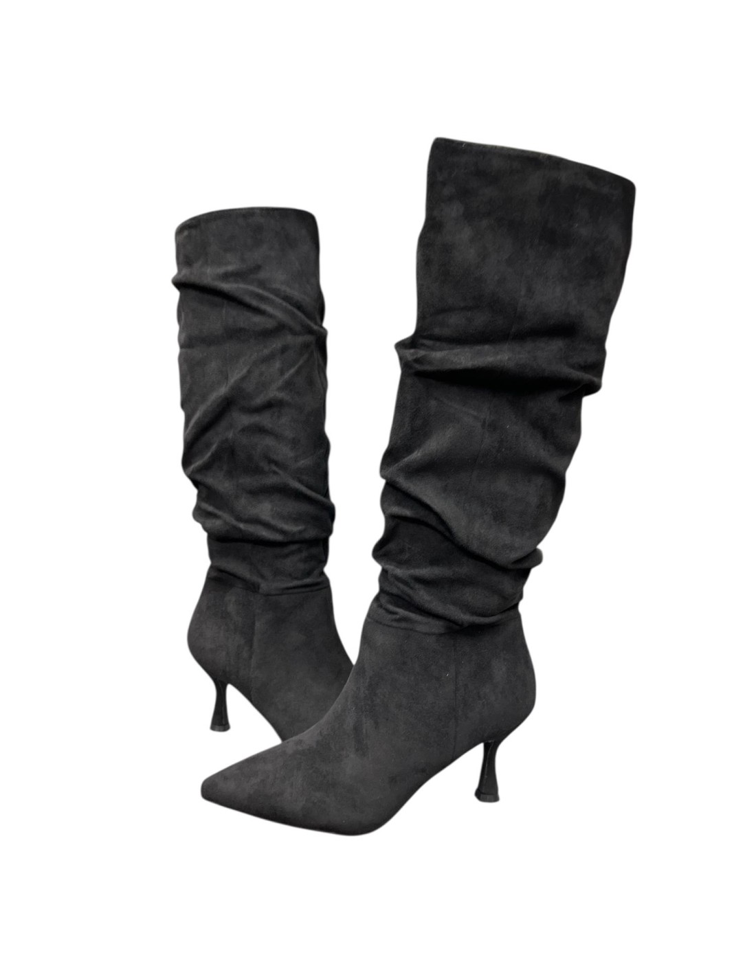 Bota alta arrugada de serraje con tacón fino de 7 cm y altura de 42 cm