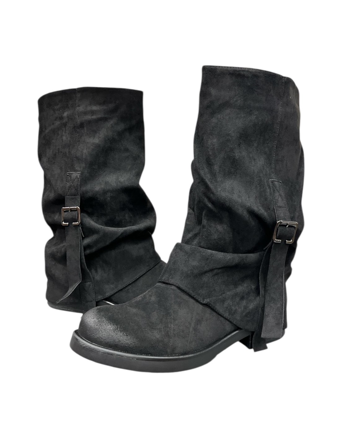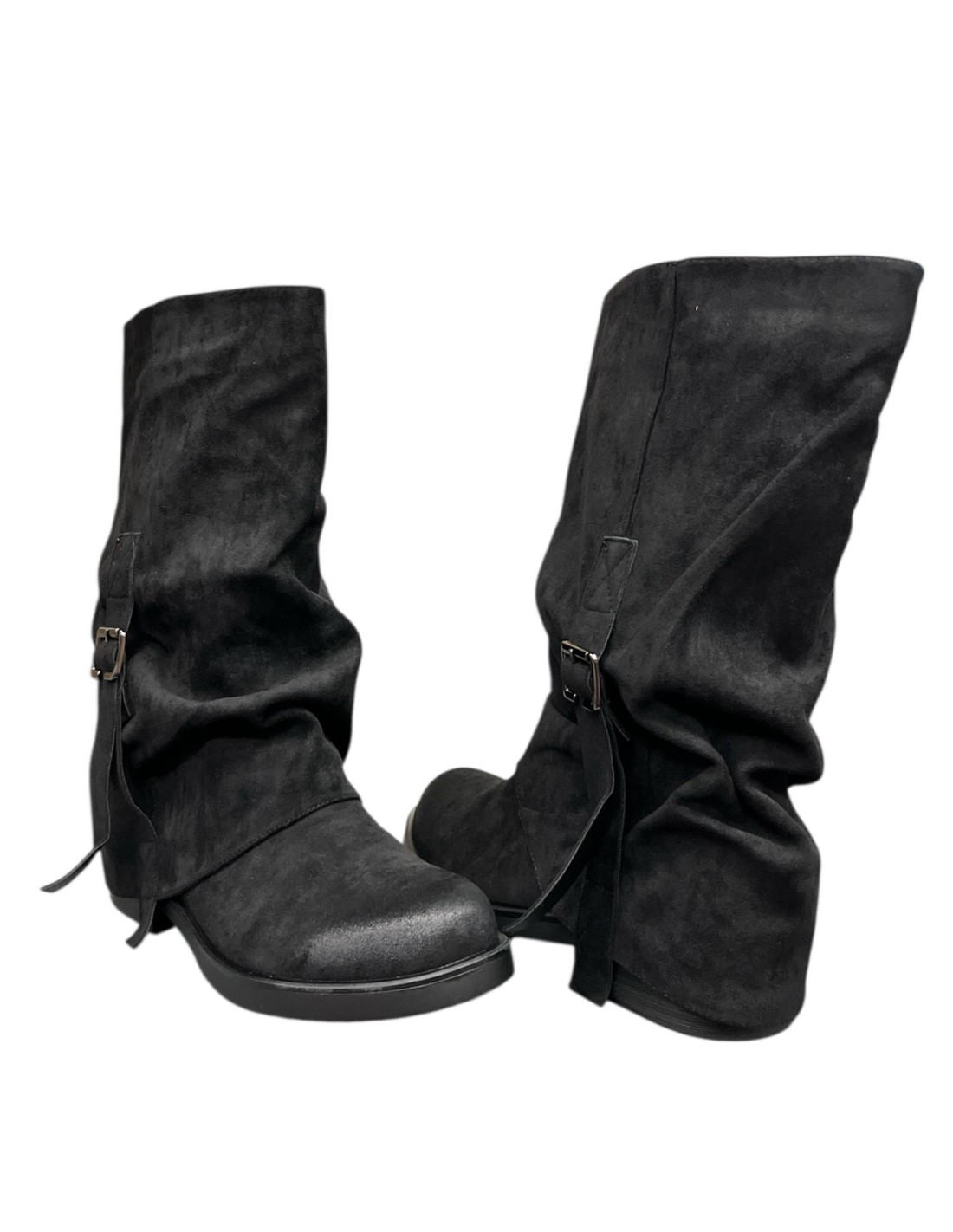 Bota con hebilla lateral y puntera desgastada. Tacón de 4 cm y altura de 27 cm