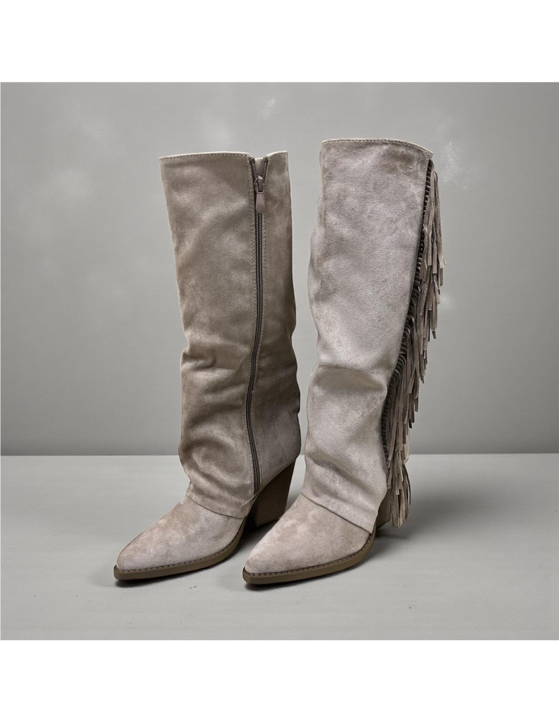 Bota alta, con flecos, cremallera interna, tacon ancho.