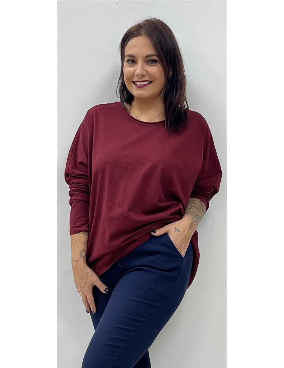 Camiseta básica de algodón con manga murciélago. Su talla puede dar desde una 38 hasta una 46. Combinada con la deportiva DX233