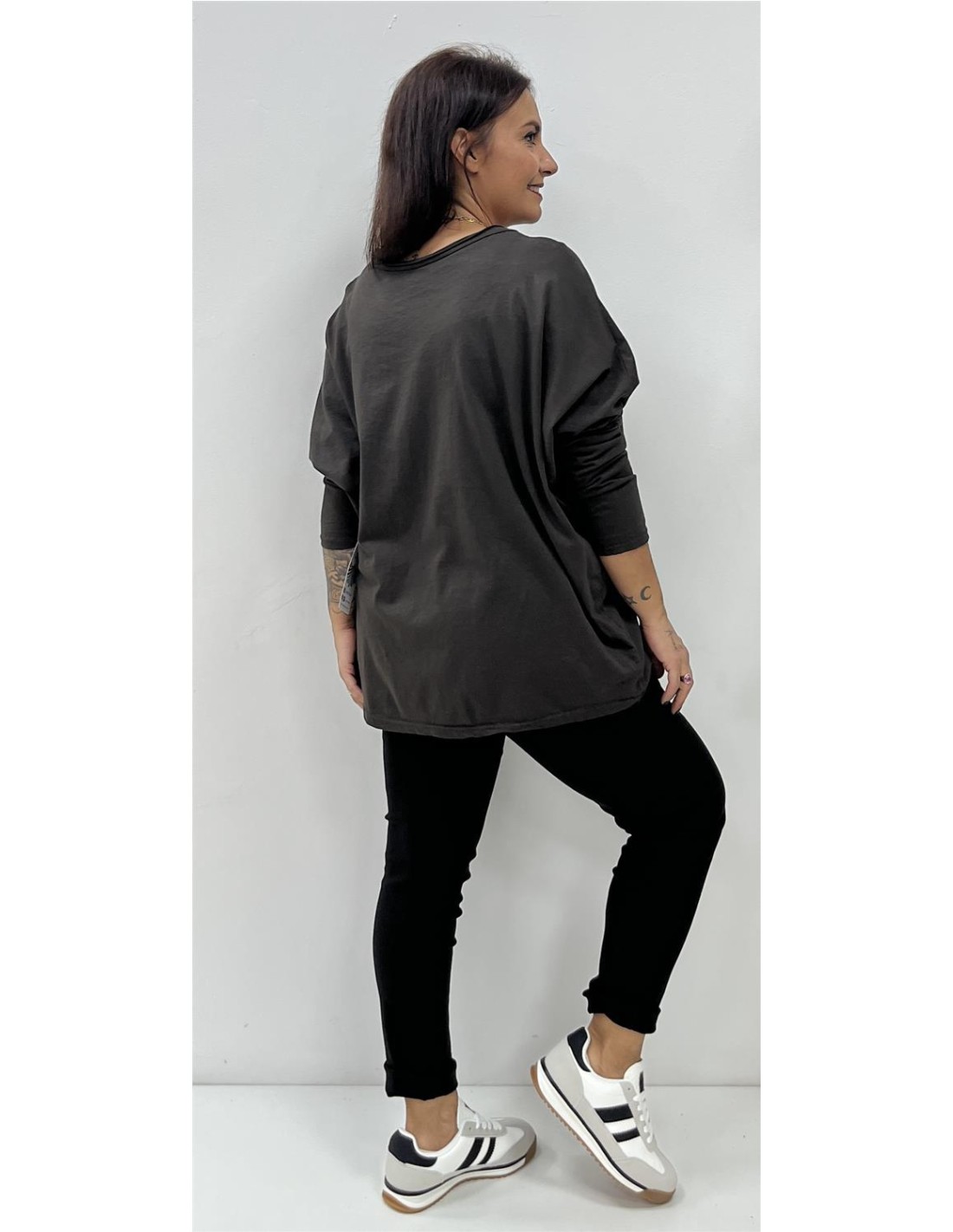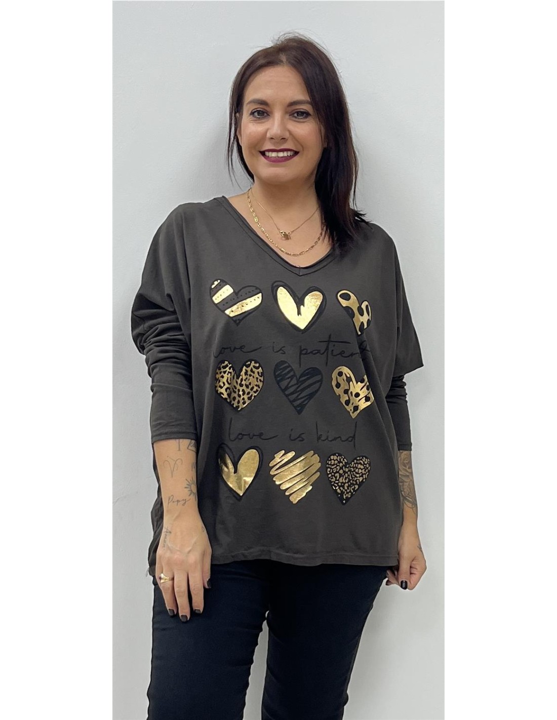 Camiseta estampada corazones. Su talla puede dar desde una 40 hasta una 48. Combinada con la deportiva DX227 y el bolso BL41-037