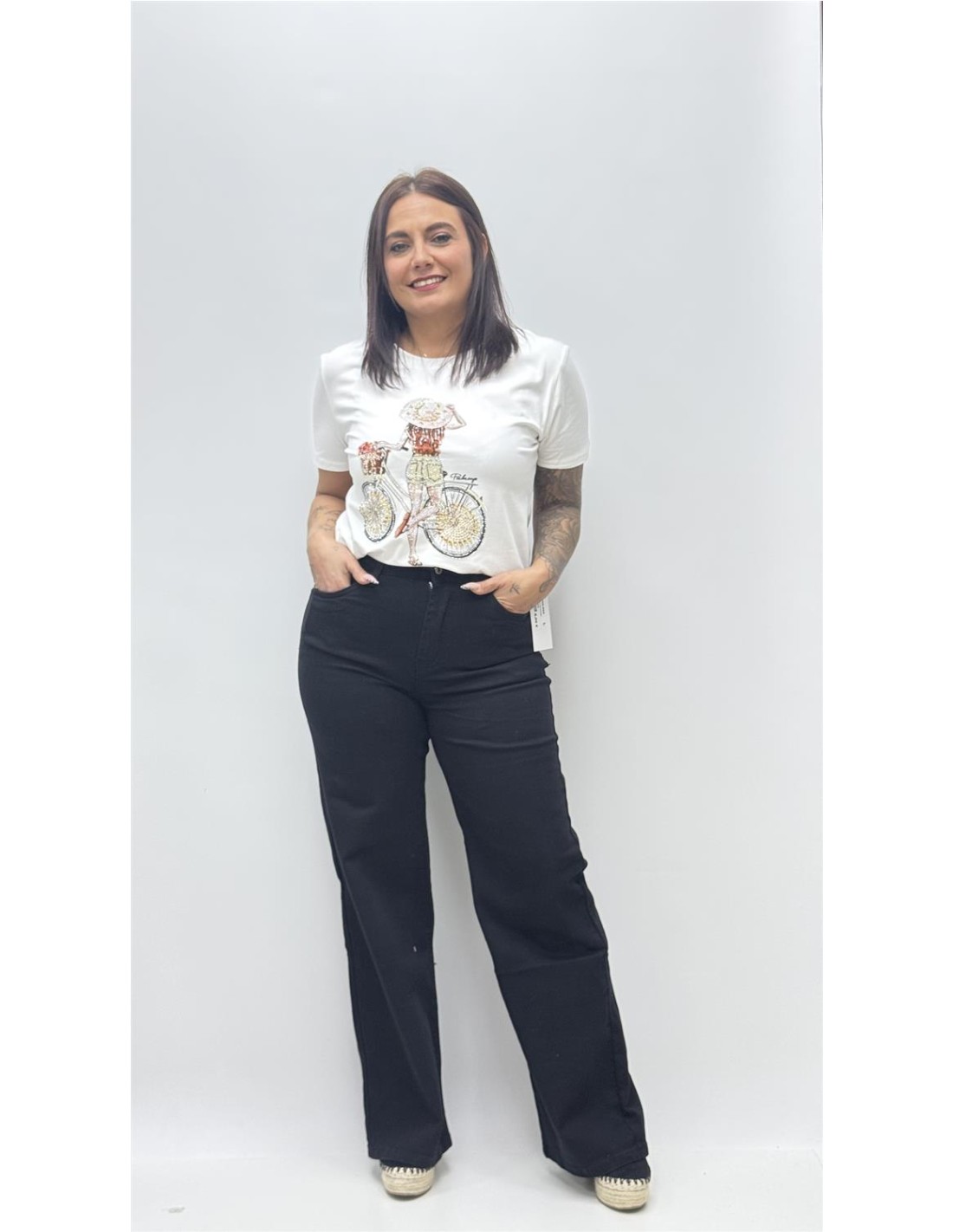 Nuesta camiseta viene con un dibujo conmpleto en pedreria fina, lo que hace un efecto bastante fino. Va por talla te recomendamos una mas a la que utilices la M, (36-38), L (38-40), XL (40-42) Y 2XL (42-44)