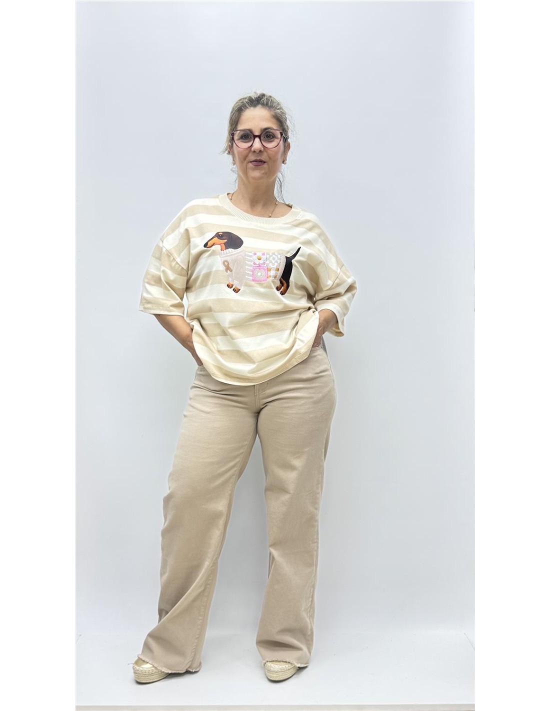 Nuestra camiseta de manga corta oversice, tiene un estampado de perro salchicha al tono. Es de talla unica y da desde la 38 hasta la 44.