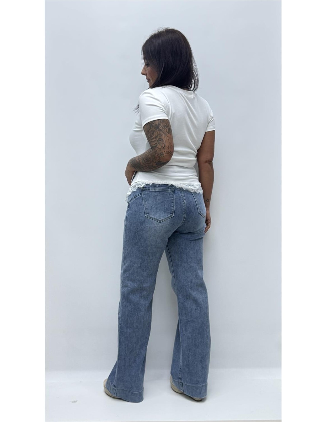 Camiseta de canale de licra con corte asimetrico, tiene detalle de encaje en la parte baja. Es de talla unica dando aprox desde la 34 hasta la 40.