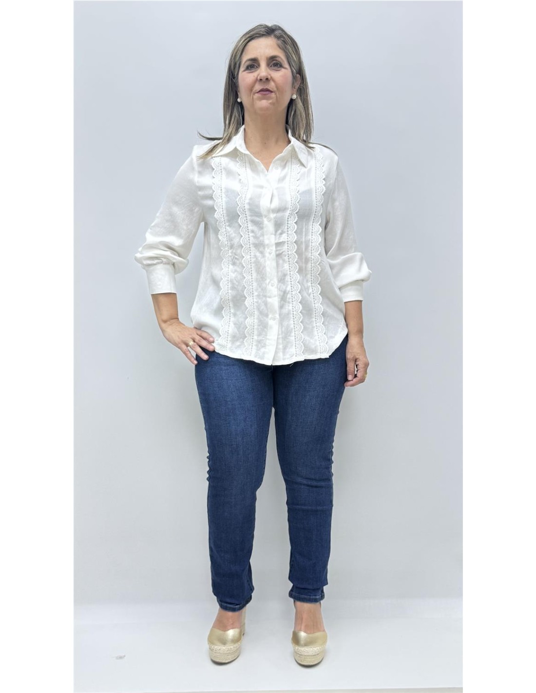 Camisa encaje efecto lino con pasamaneria, van por talla y vienen bien.