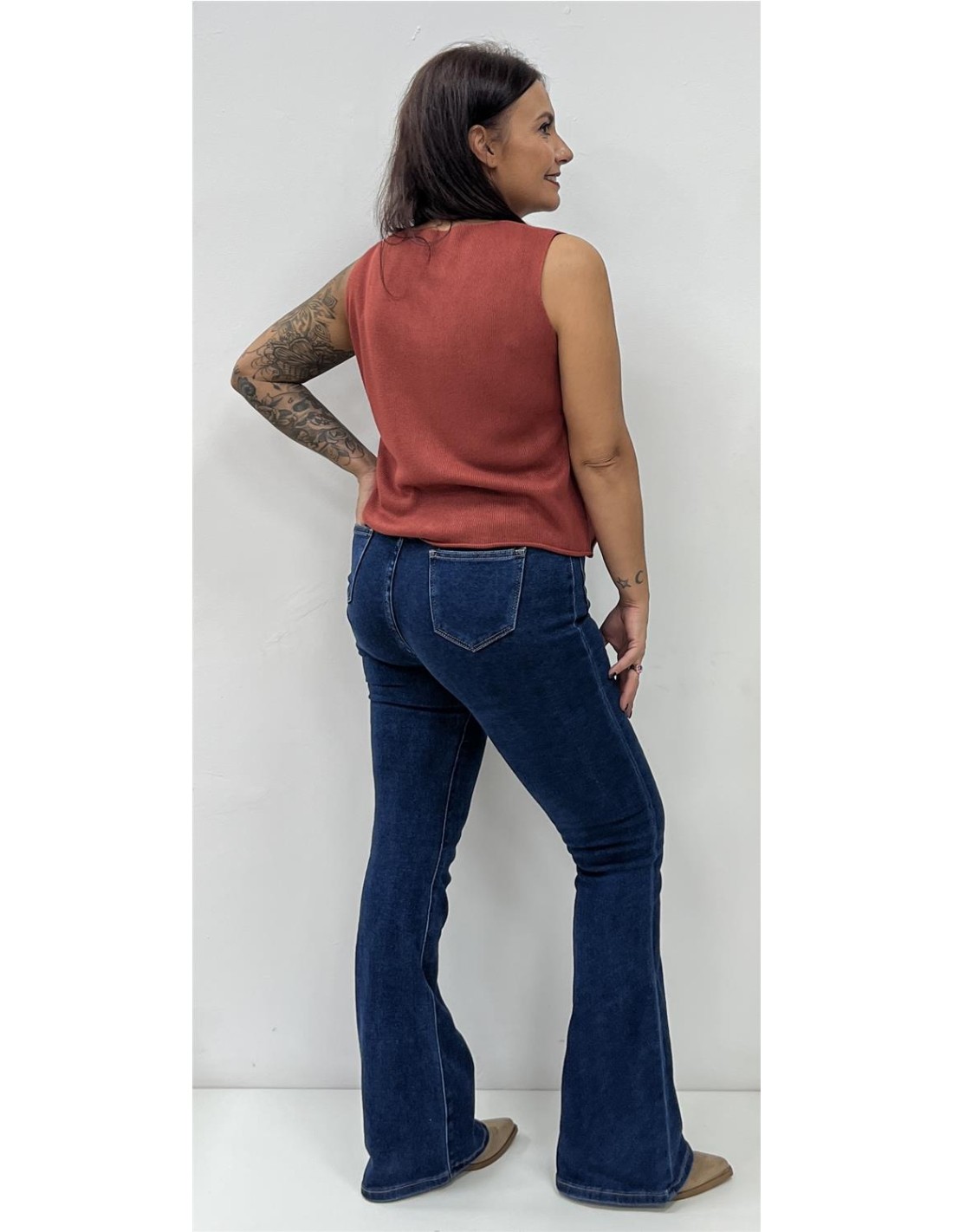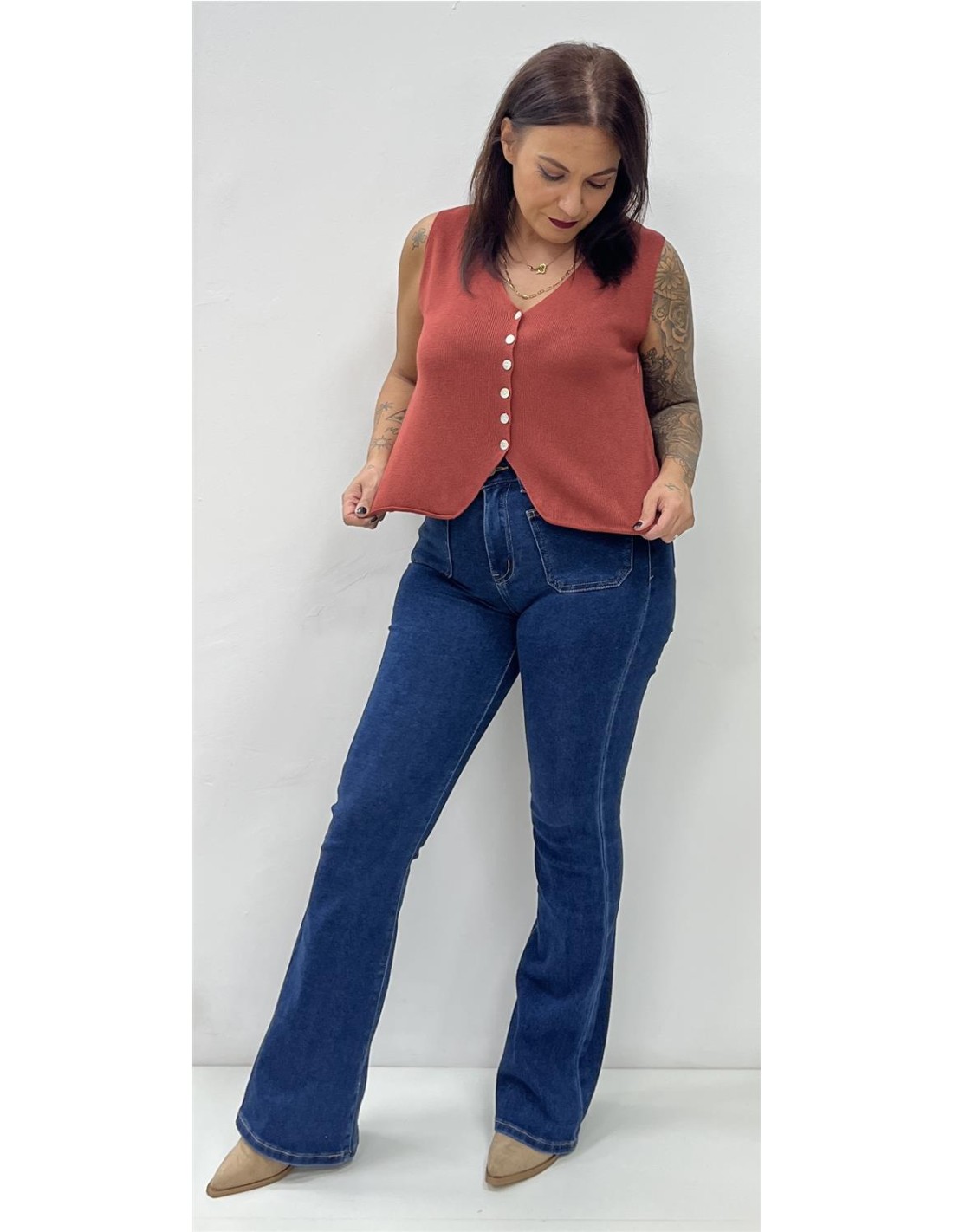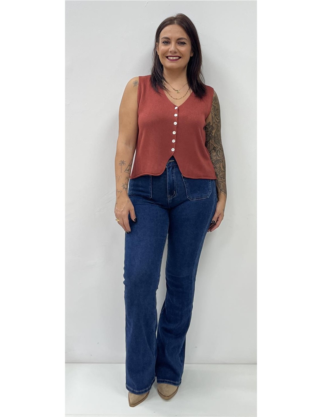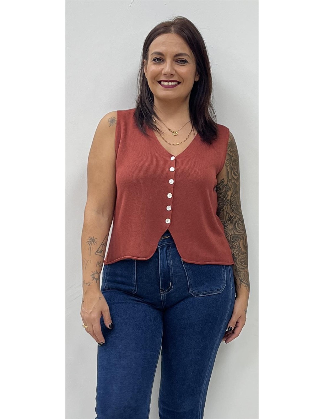 Chalequillo de punto con botones. Su talla puede dar desde una 36 hasta una 42. Combinado con el pantalón ZOE y el bolso CR45-101