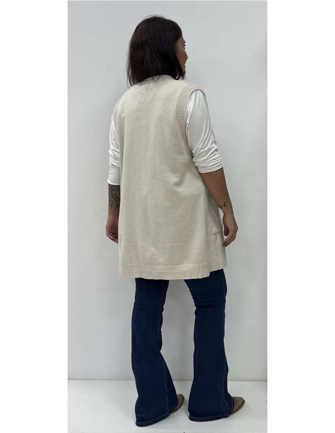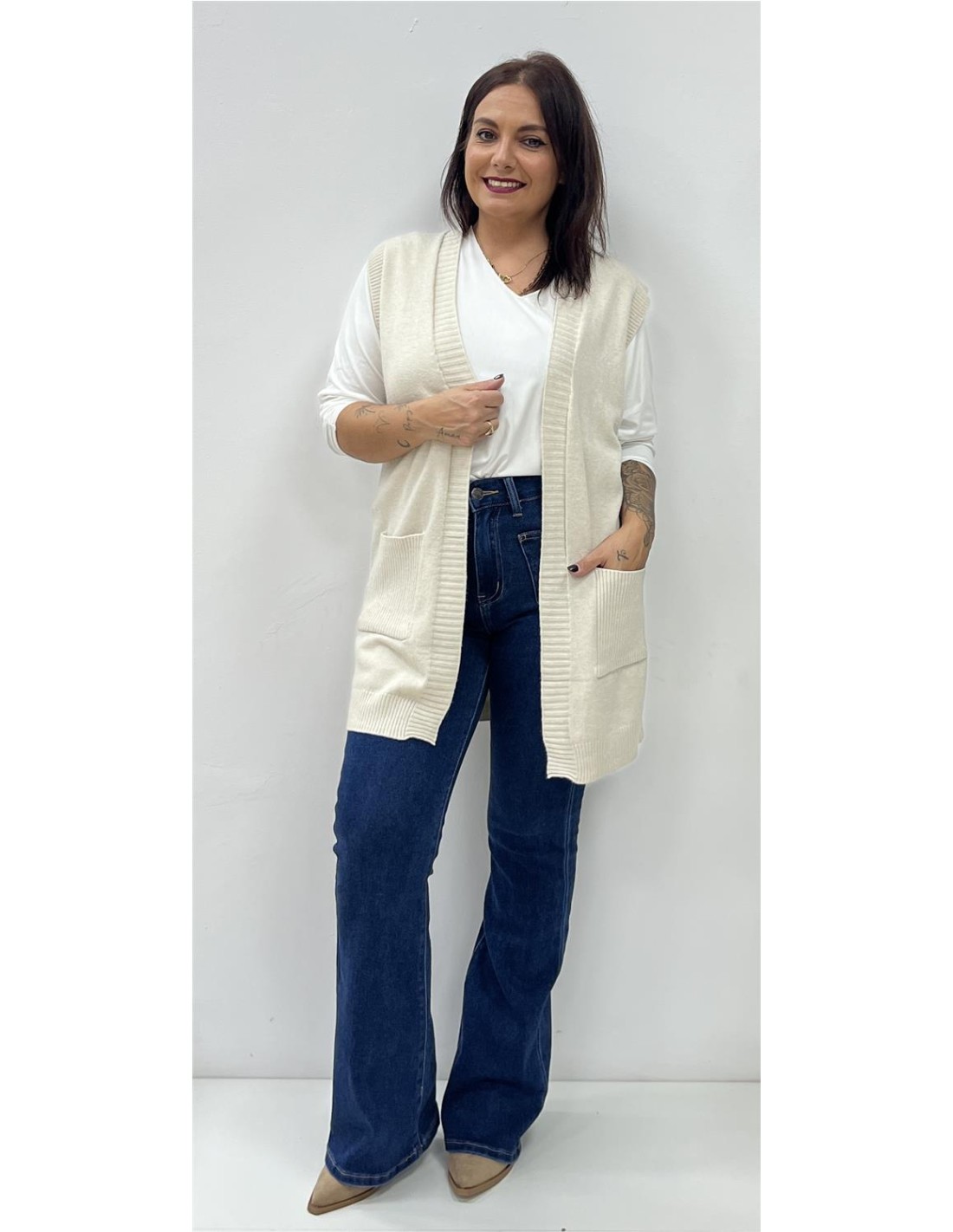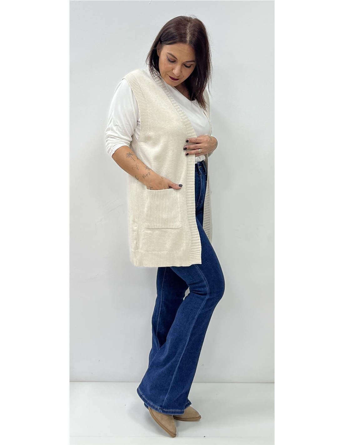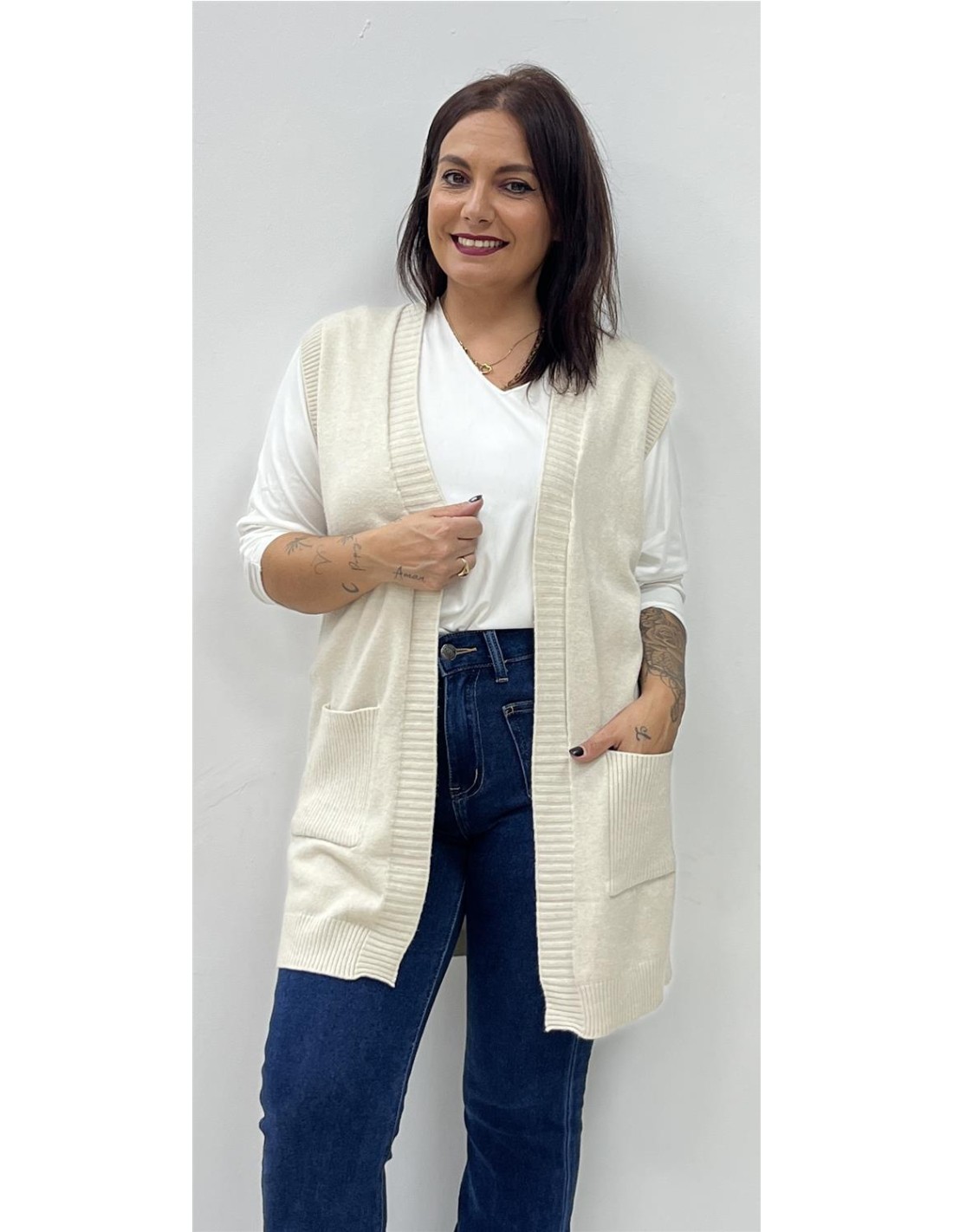 Chalequillo largo con bolsillos. Su talla puede dar desde una 36 hasta una 44. Combinado con el pantalón ZOE y la camiseta VIDA