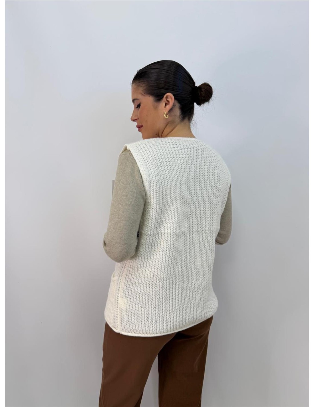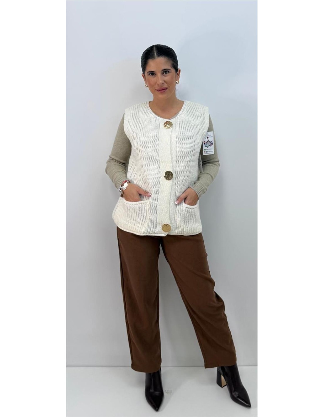 Chalequillo sin mangas, lana abotonada, dorados. Su talla va desde 36 hasta 46 aproximadamente.