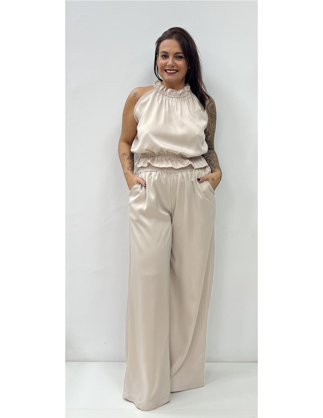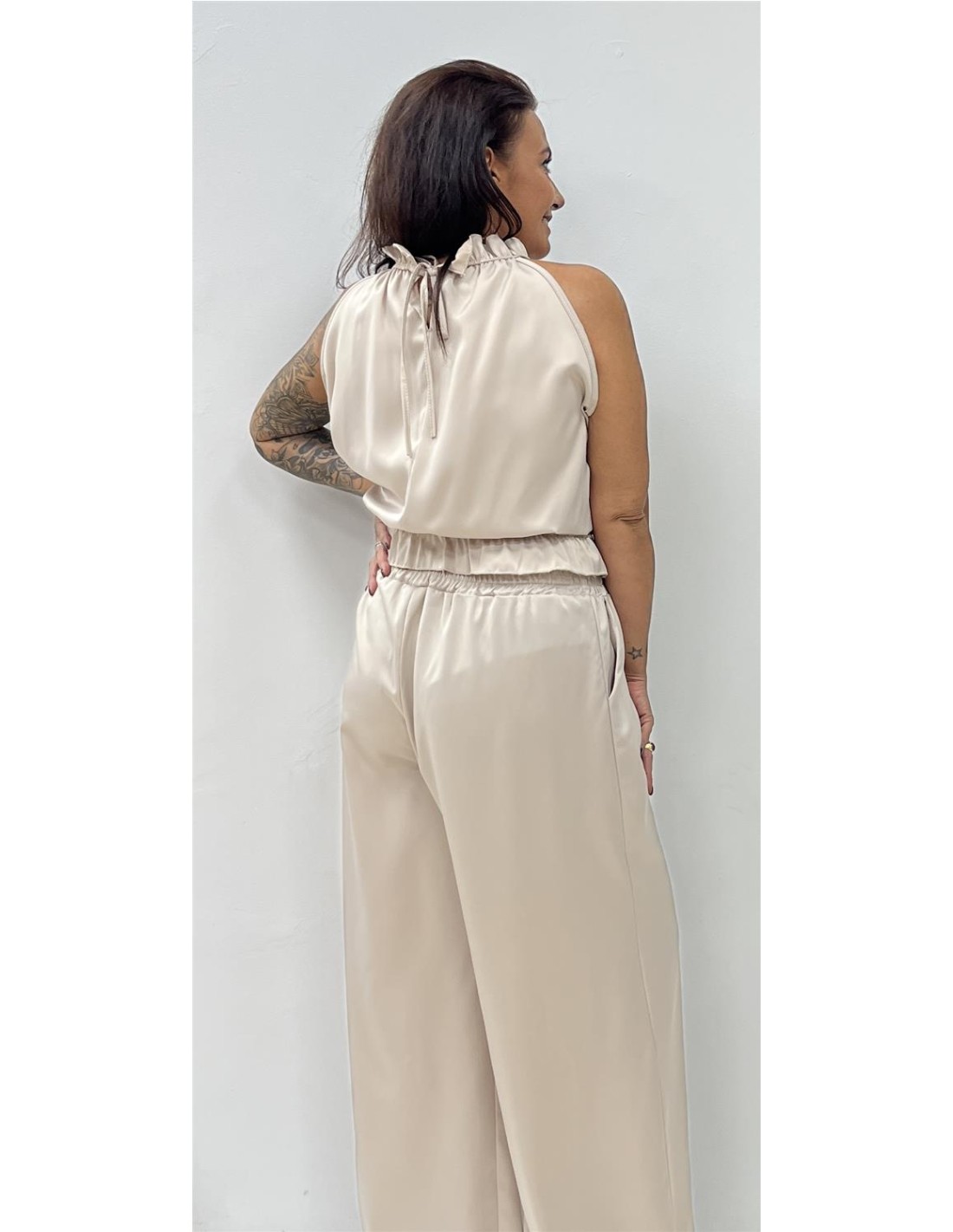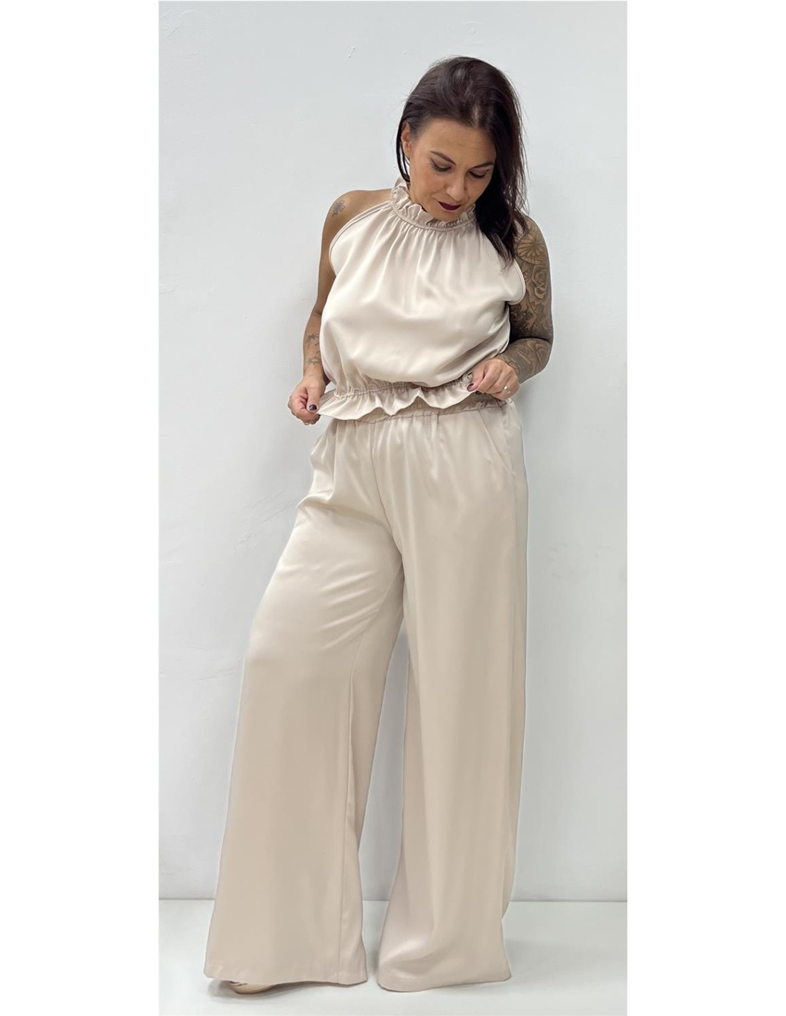Conjunto satinado de dos piezas de top con cuello cisne y pantalón recto. Su talla puede dar desde una 36 hasta una 42