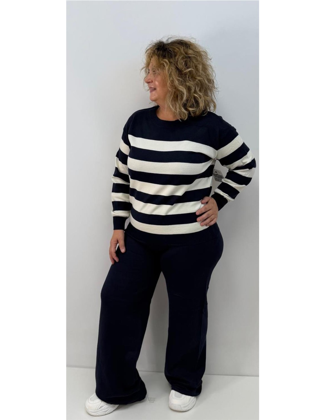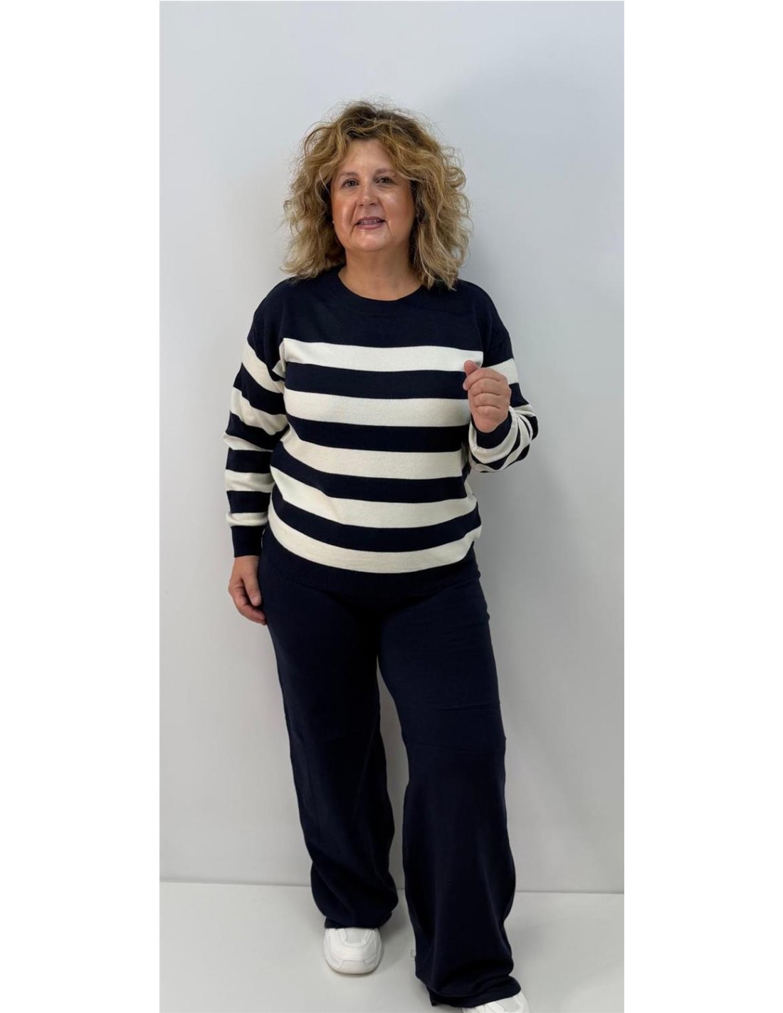 Conjunto de punto, cintura elástica, cuello redondo. Su talla va desde una 34 hasta una 42 aproximadamente.