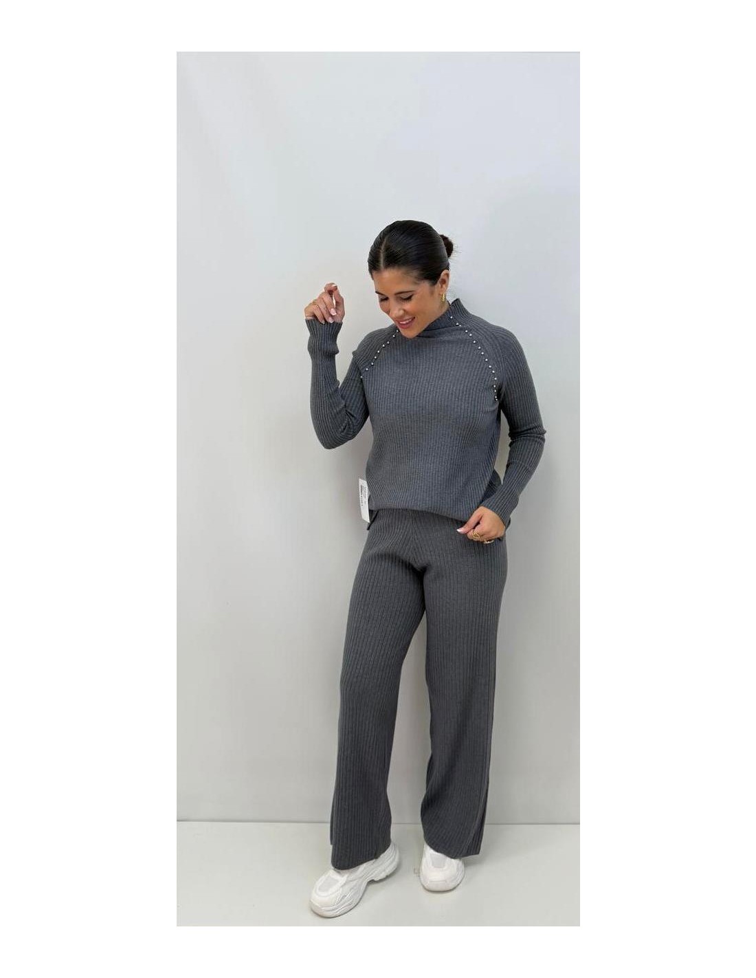 Cuello maho, con tachas, de punto de canale. Su talla va desde una 34 hasta una 42 aproximadamente.