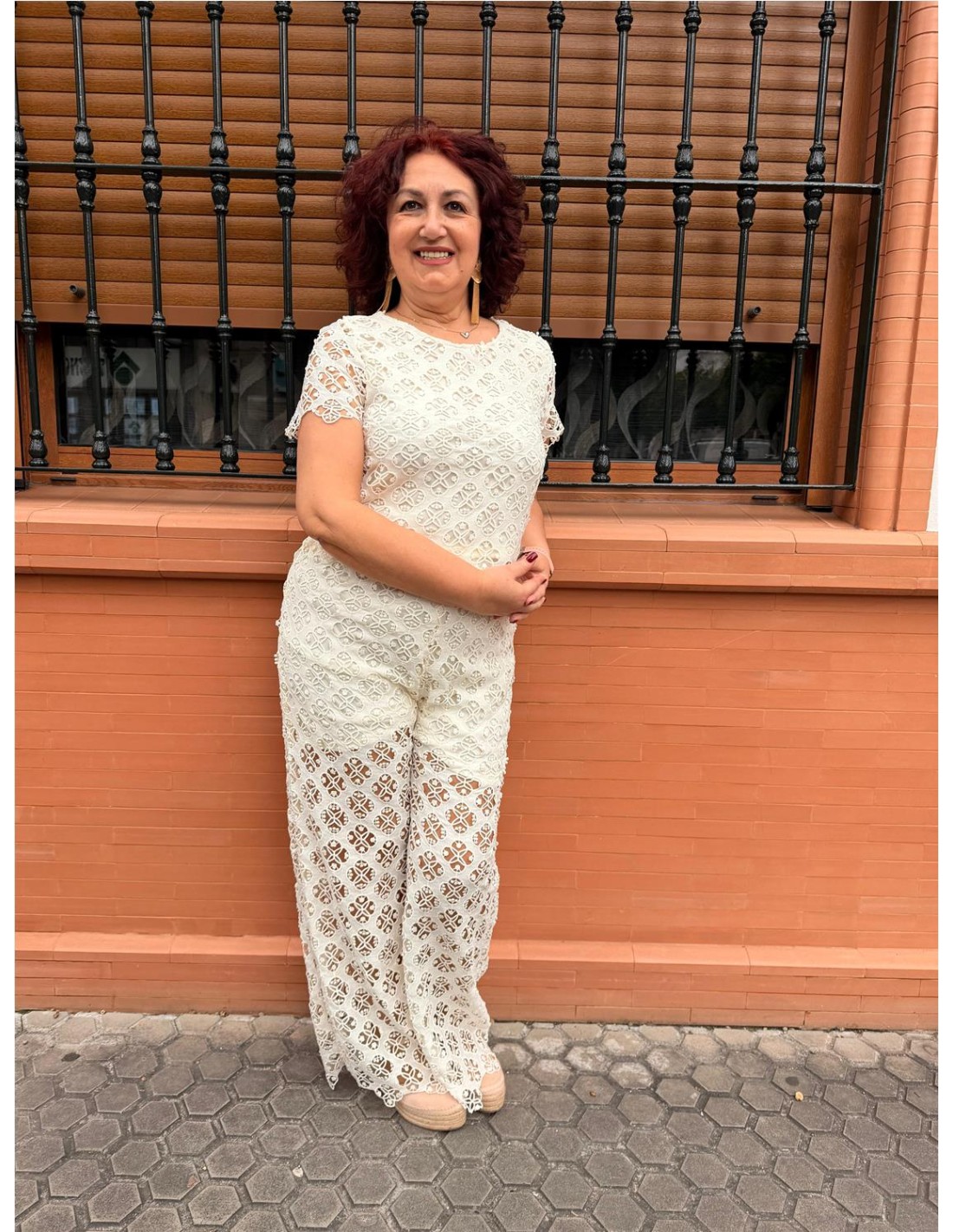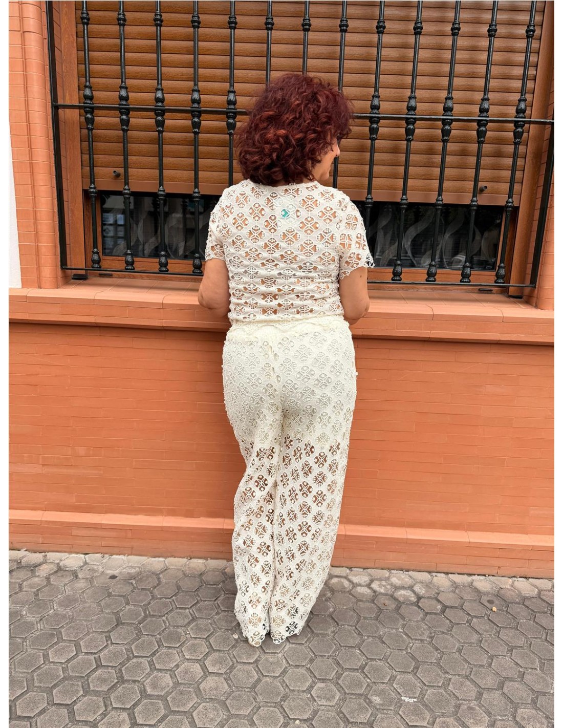 Conjunto de dos piezas, perforado, cinturilla elástica. Su talla puede dar desde una 36 hasta una 40 aproximadamente.