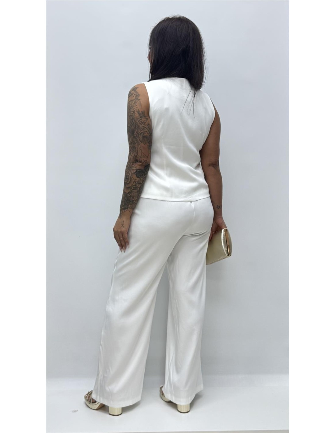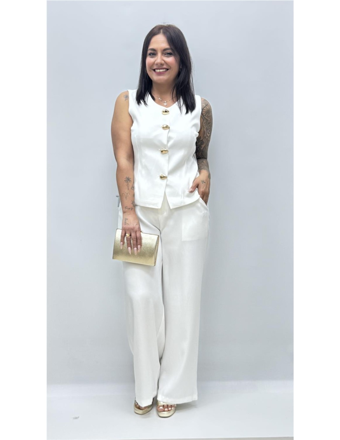 Conjunto de dos piezas formado por pantalon y chalequillo, tiene el tejido un poco satinado y detalles dorados en el chalequillo. Viene por talla dando aprox la M-L (36-40) y la XL-2XL (40-42)