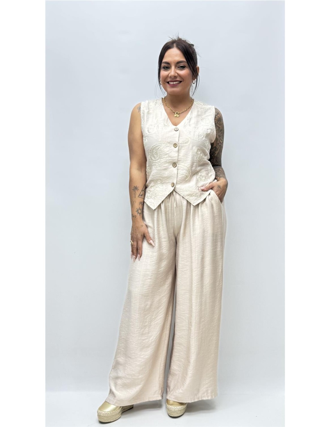 Conjunto de pantalon con bolsillos y chalequillo, con bordado cachimir. Vienen por talla dando aprox S-M (36-40) y la L-XL(40-44)