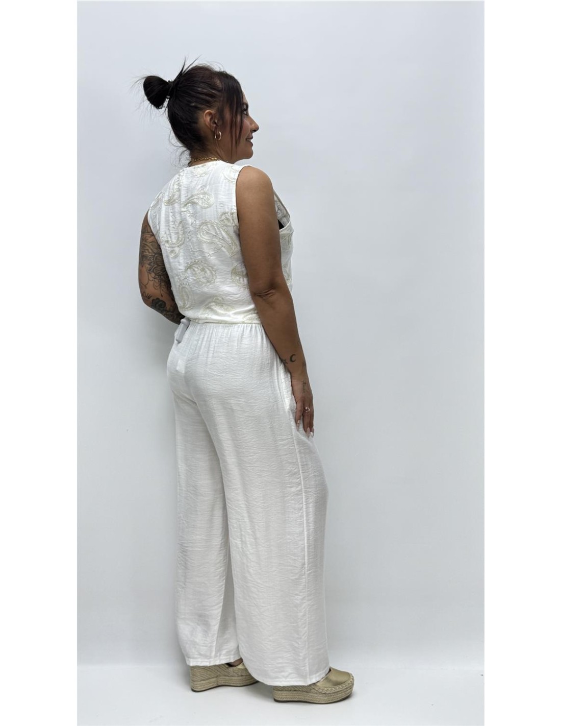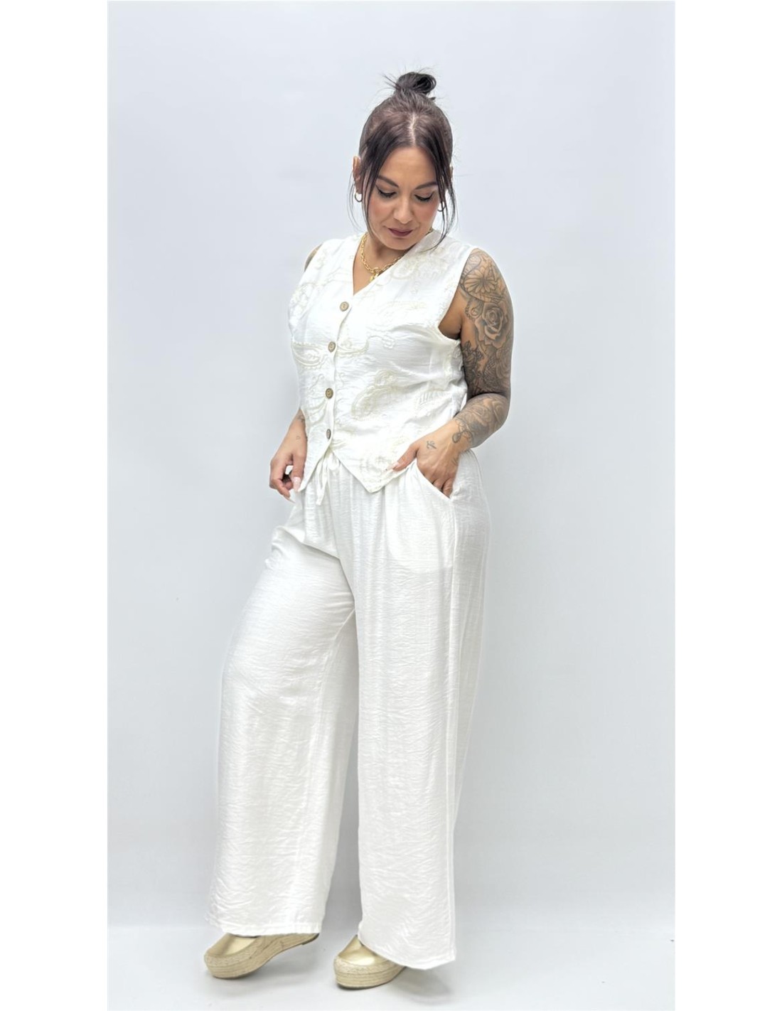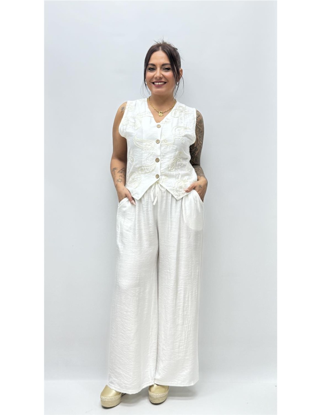 Conjunto de pantalon con bolsillos y chalequillo, con bordado cachimir. Vienen por talla dando aprox S-M (36-40) y la L-XL(40-44)