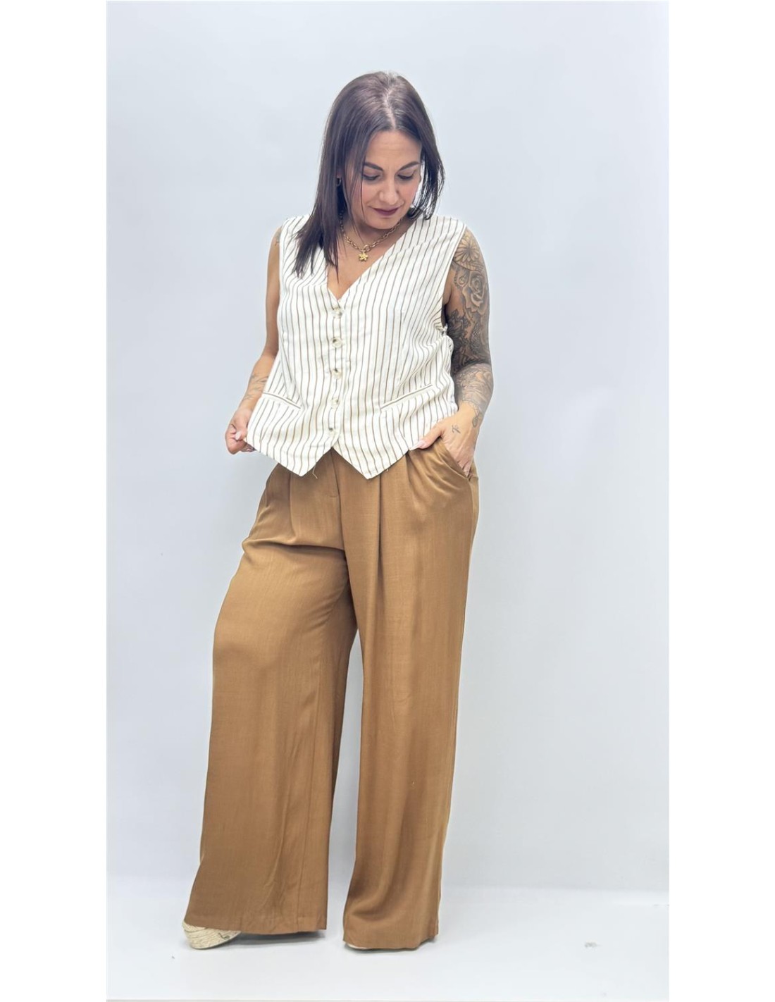Conjunto formado por pantalon con bolsillo y chalequillo de rayas, da un efecto al lino, vienen por tallas dando aprox. S-M 36-40), M-L (38-42) y L-XL (40-44)