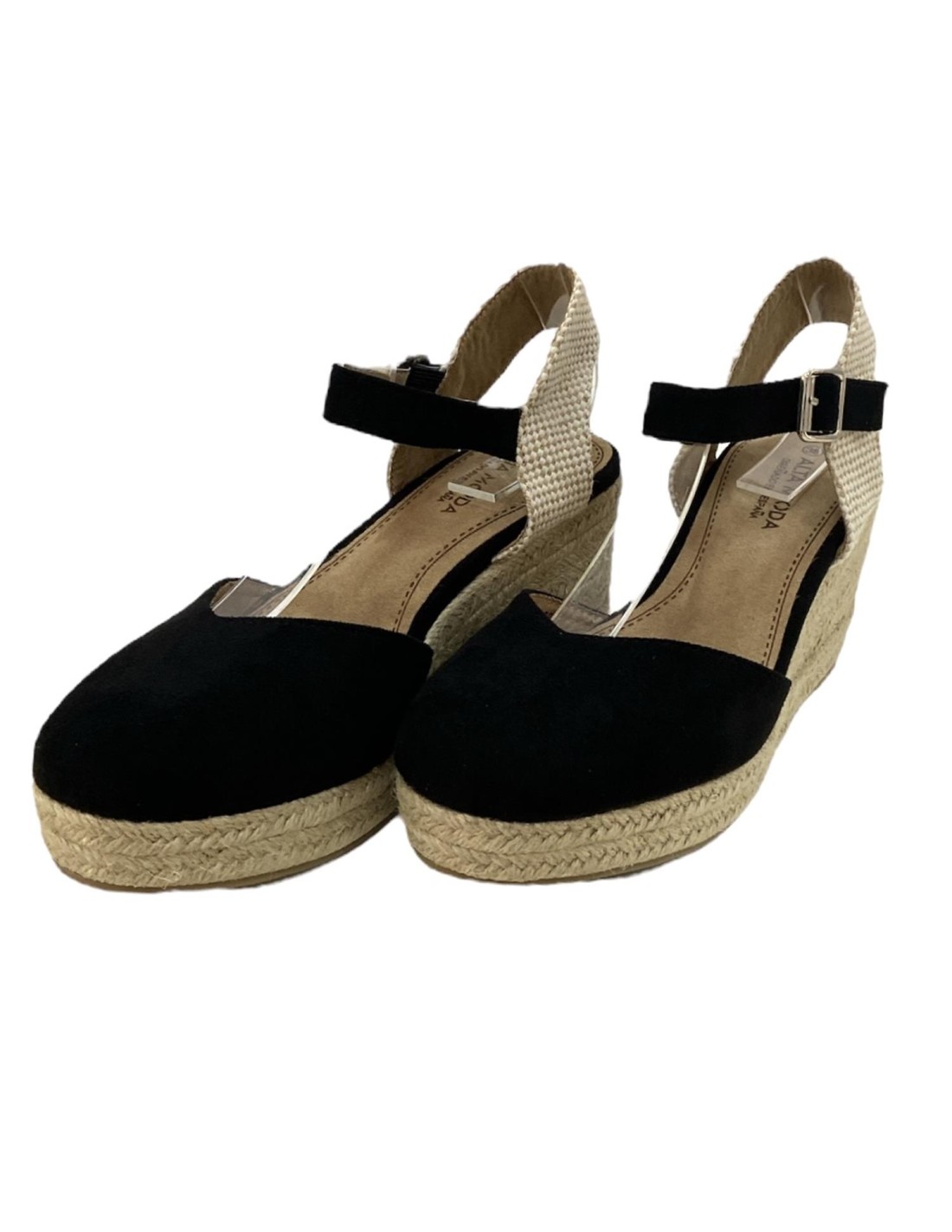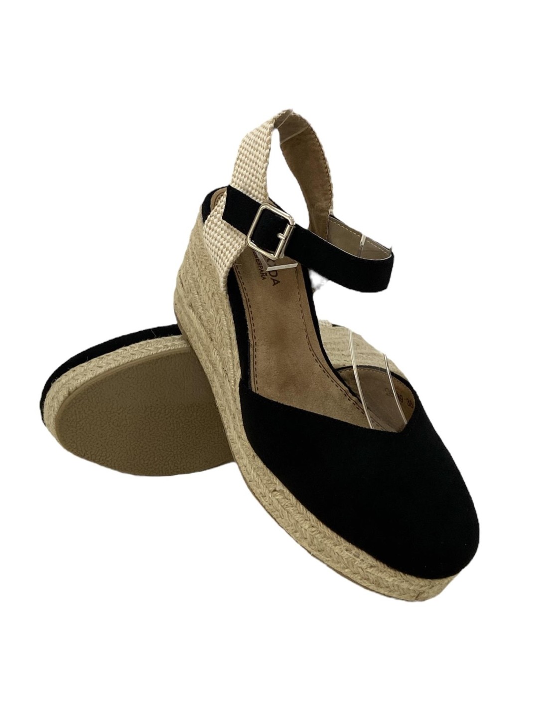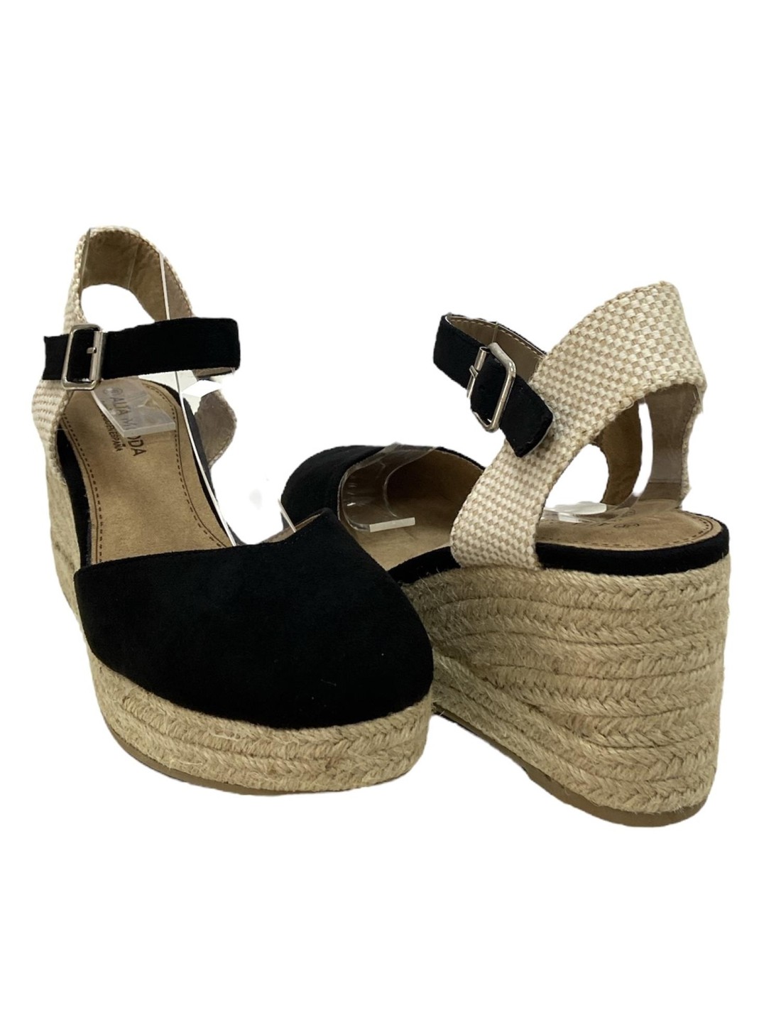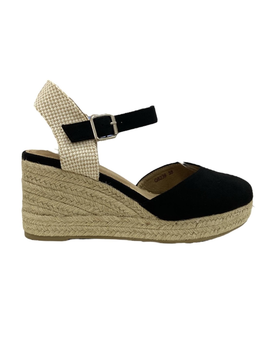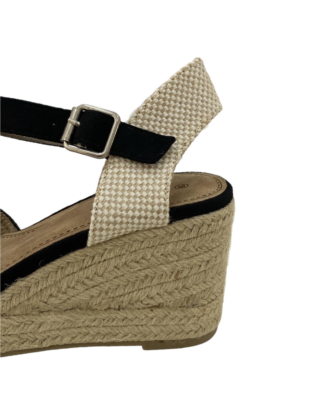 Sandalia de cuña de esparto con tira con hebilla. Cuña de 8,5 cm en la parte trasera y teniendo por la delantera 2,5 cm.