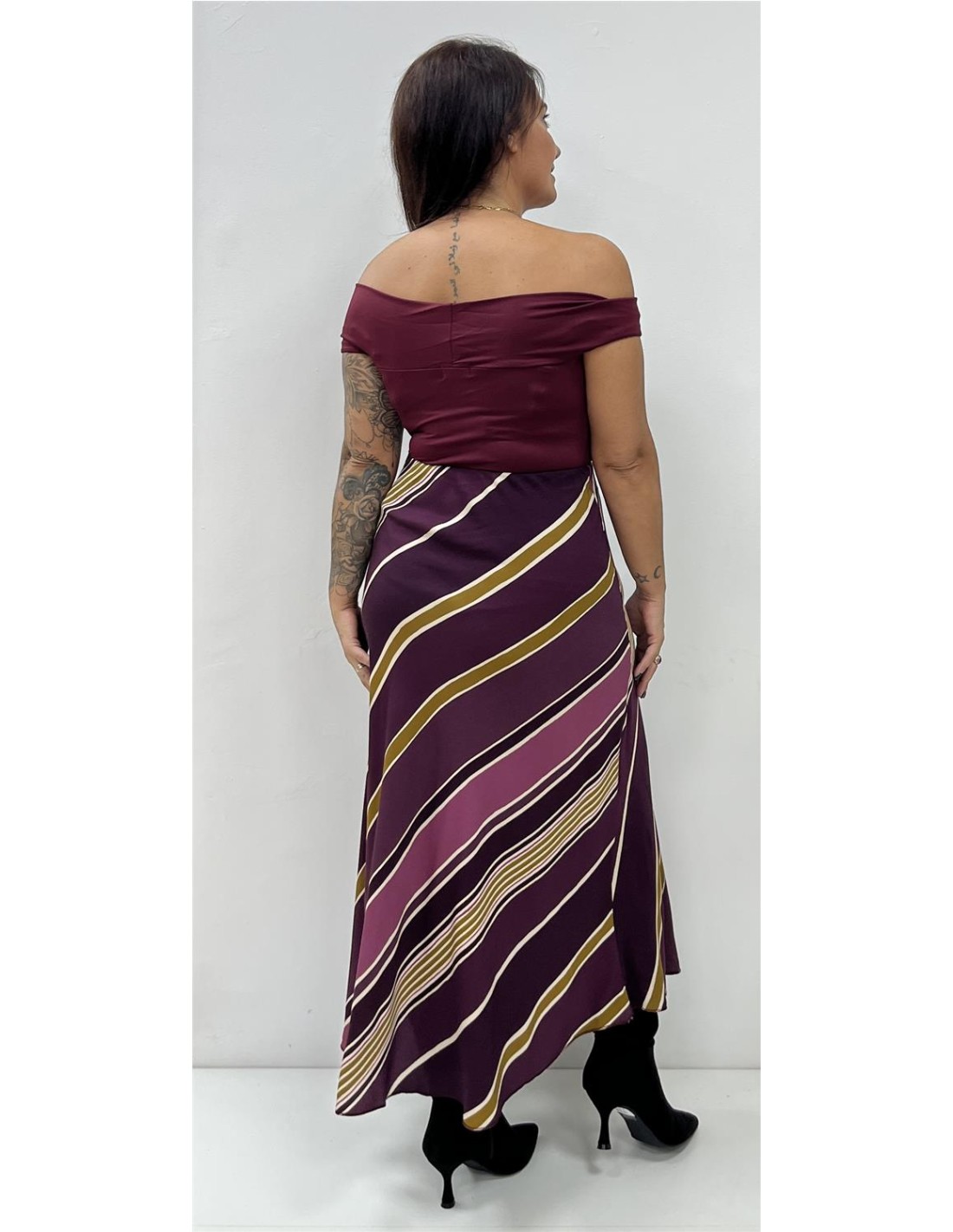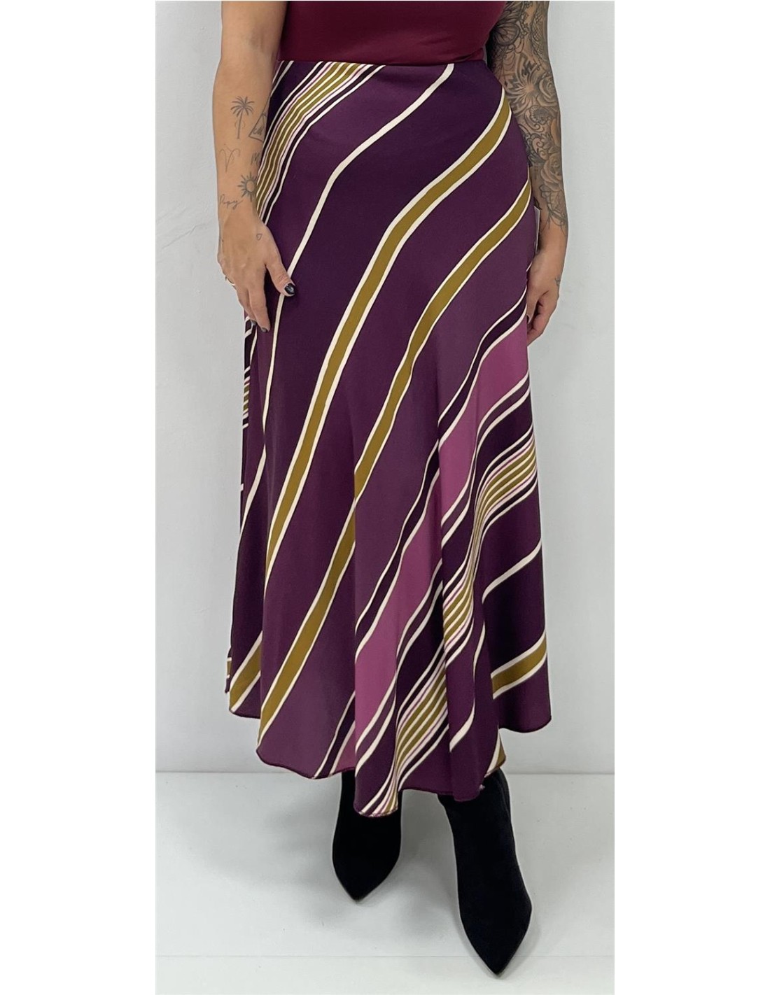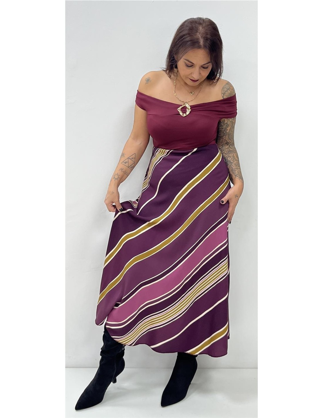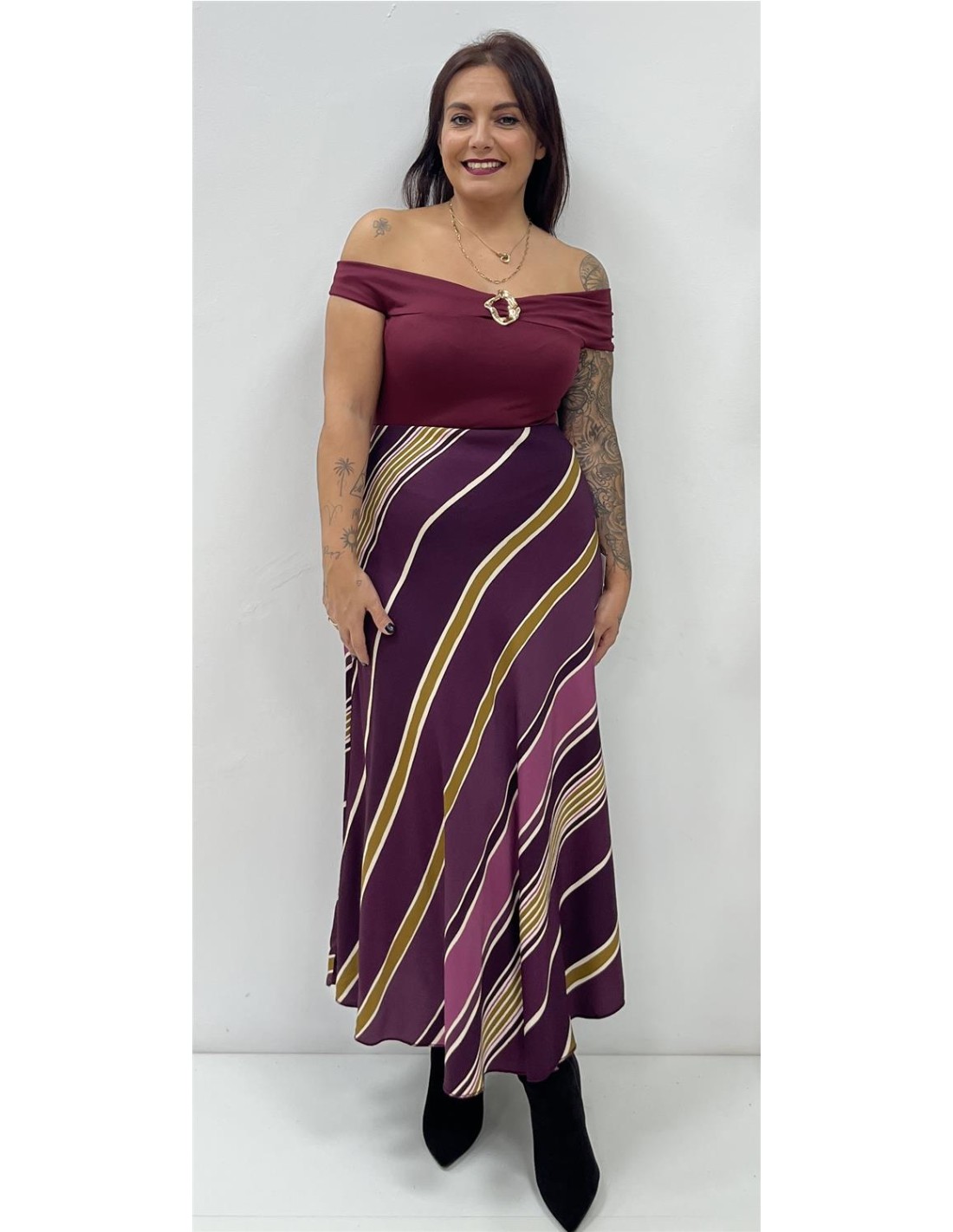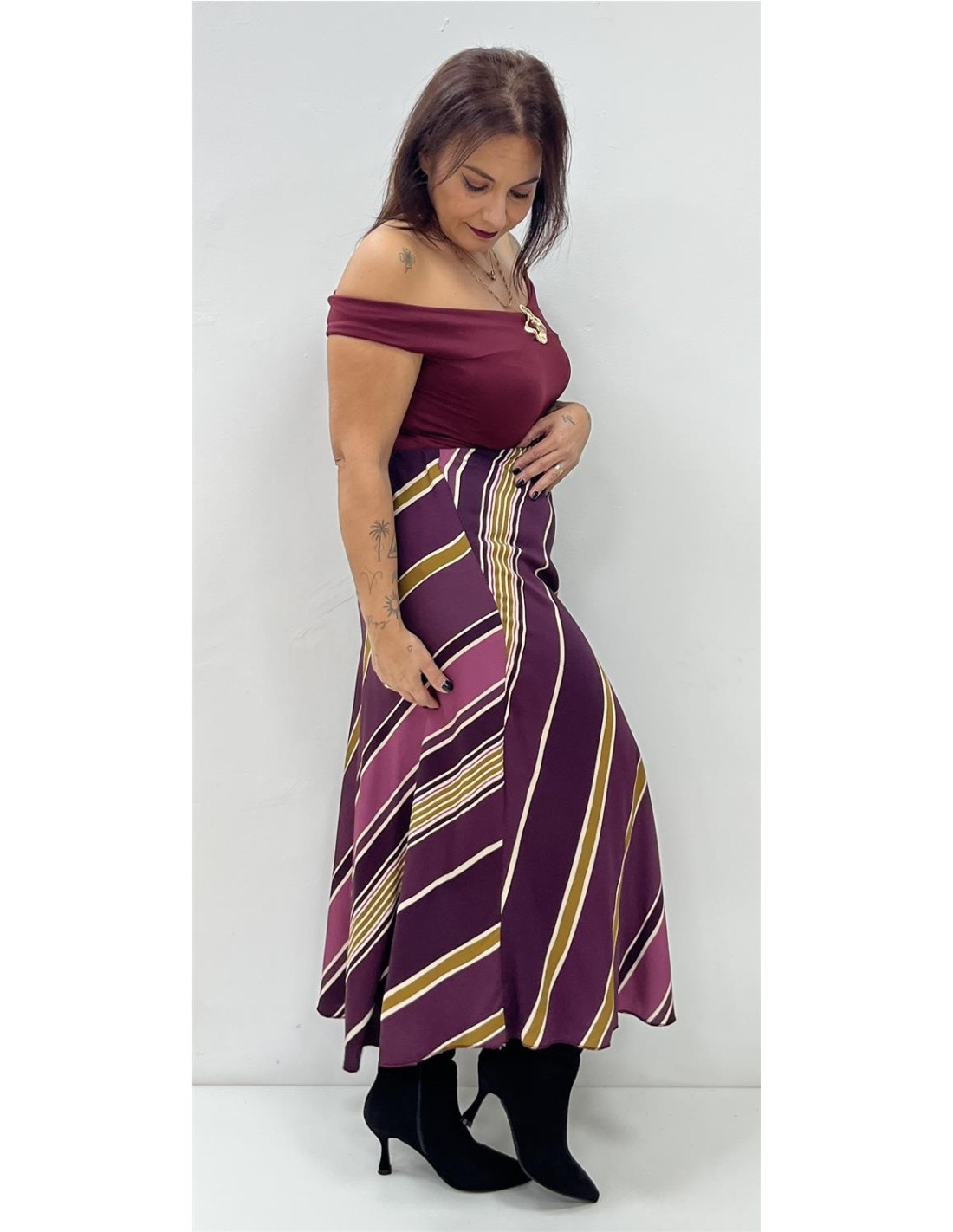 Falda de satén estampada corte midi. Su talla puede dar desde una 36 hasta una 40. Combinada con el top JANIRA y las botas BT201