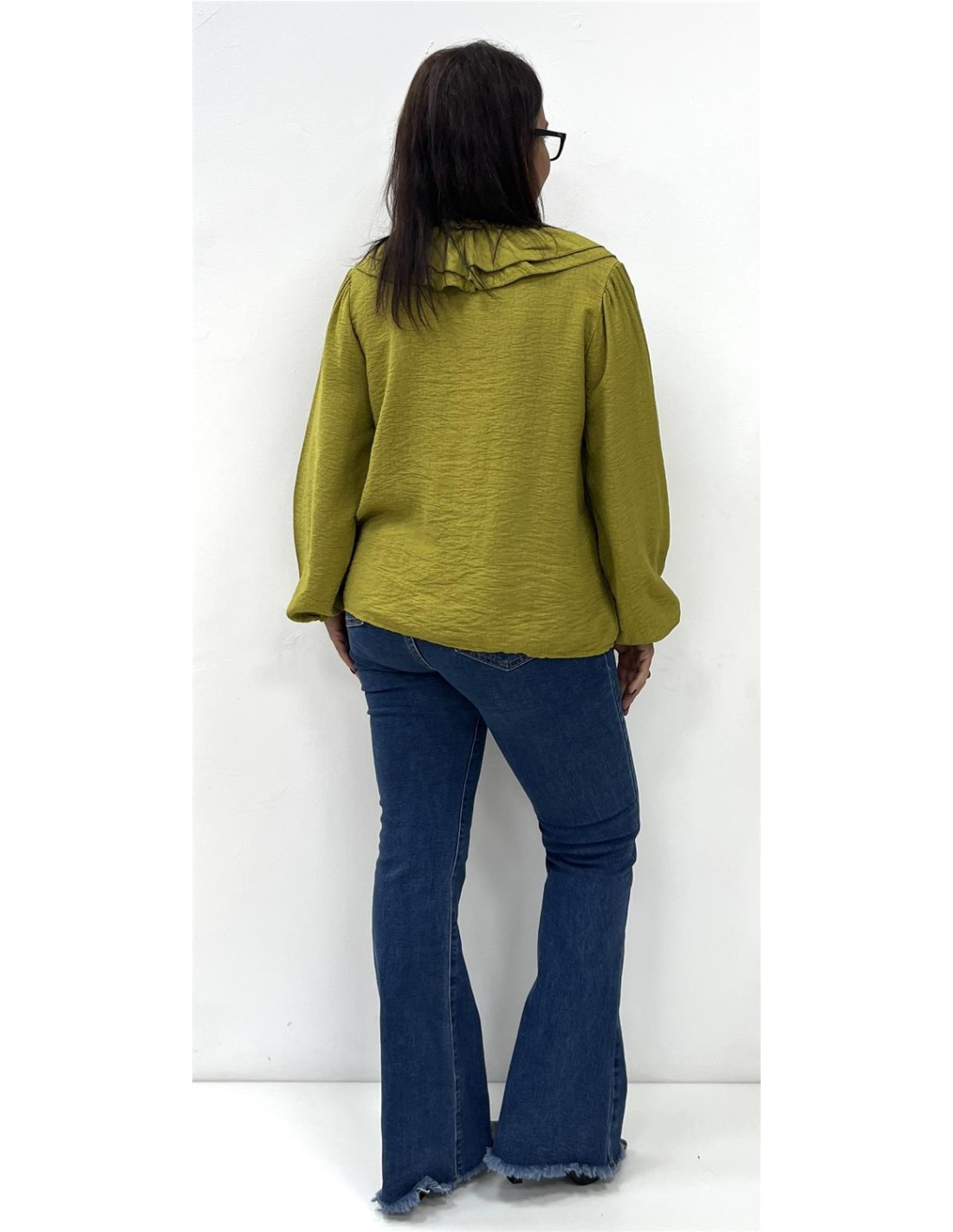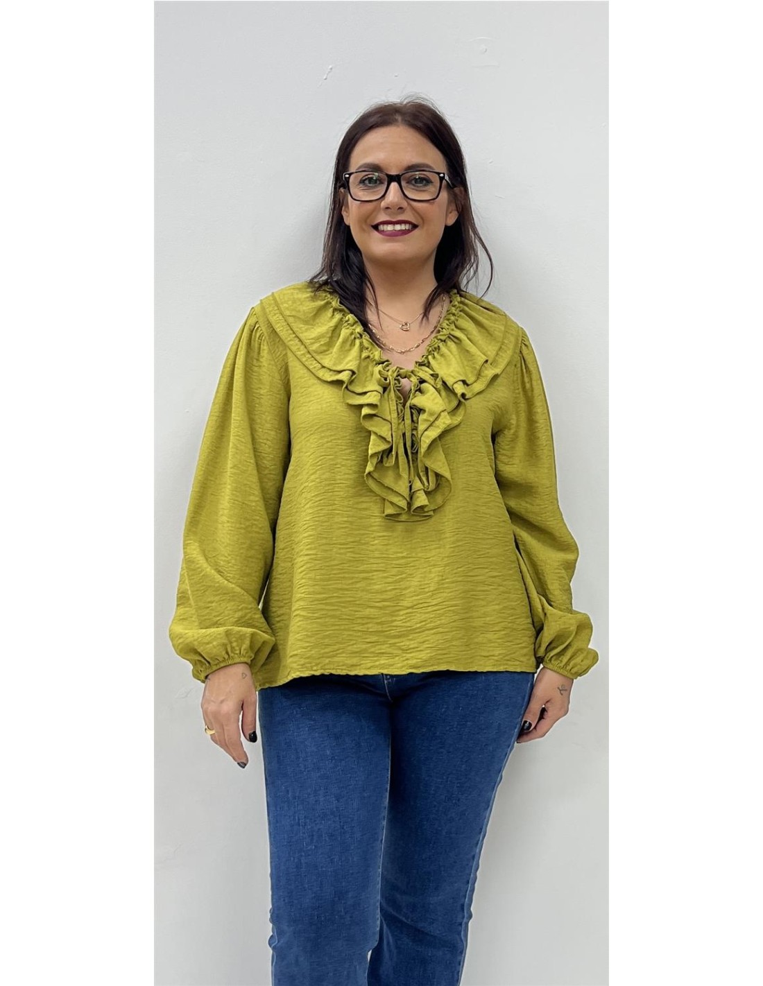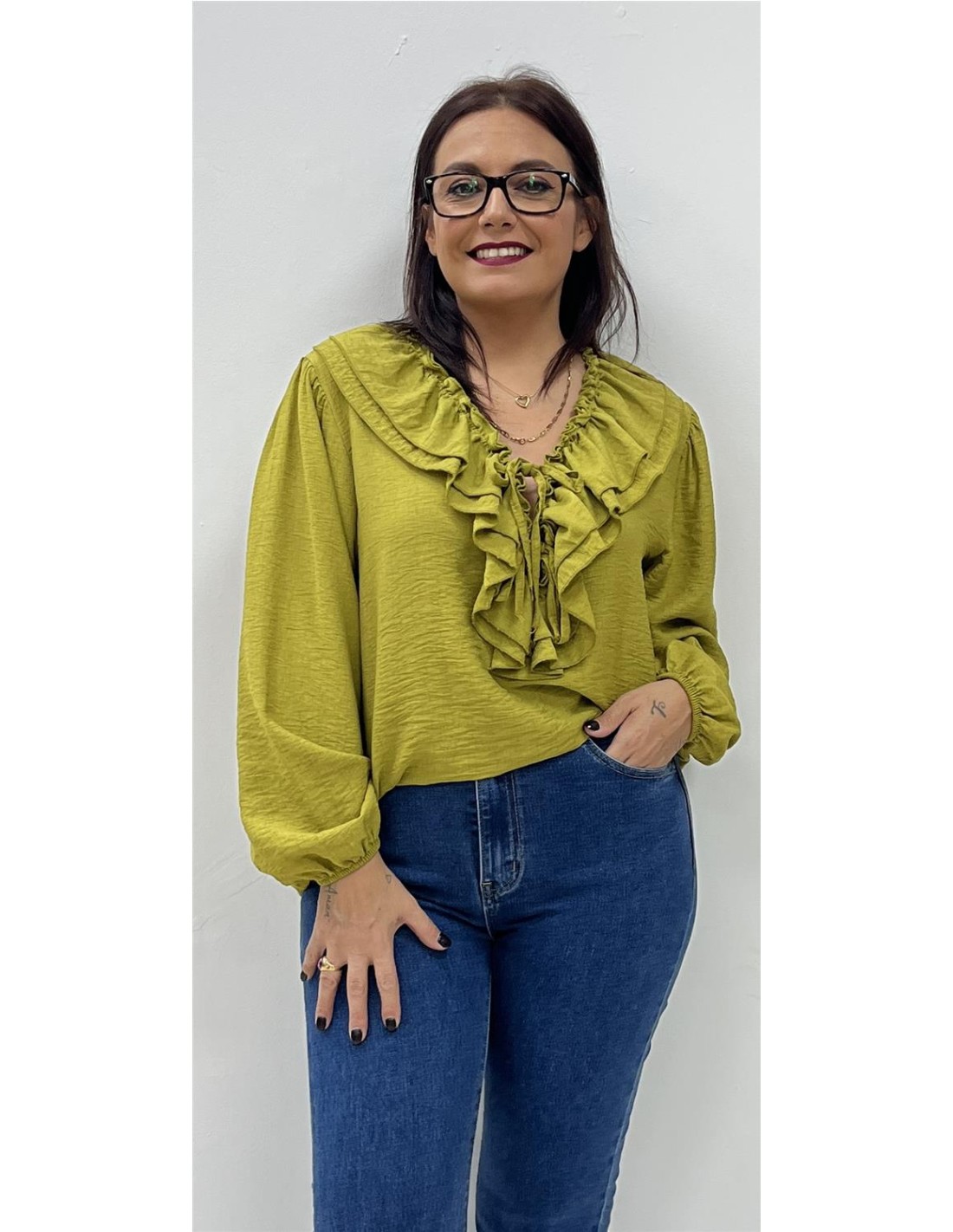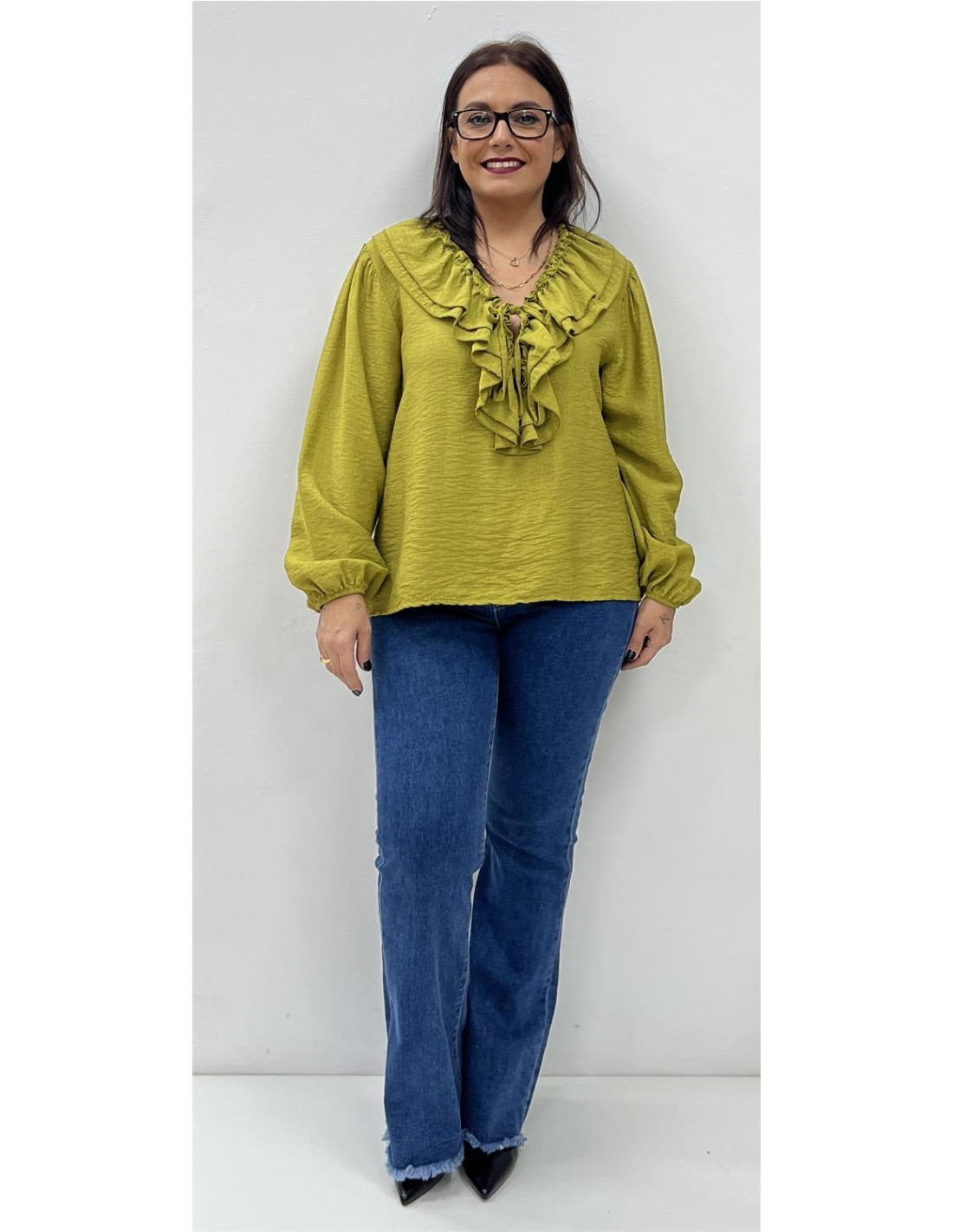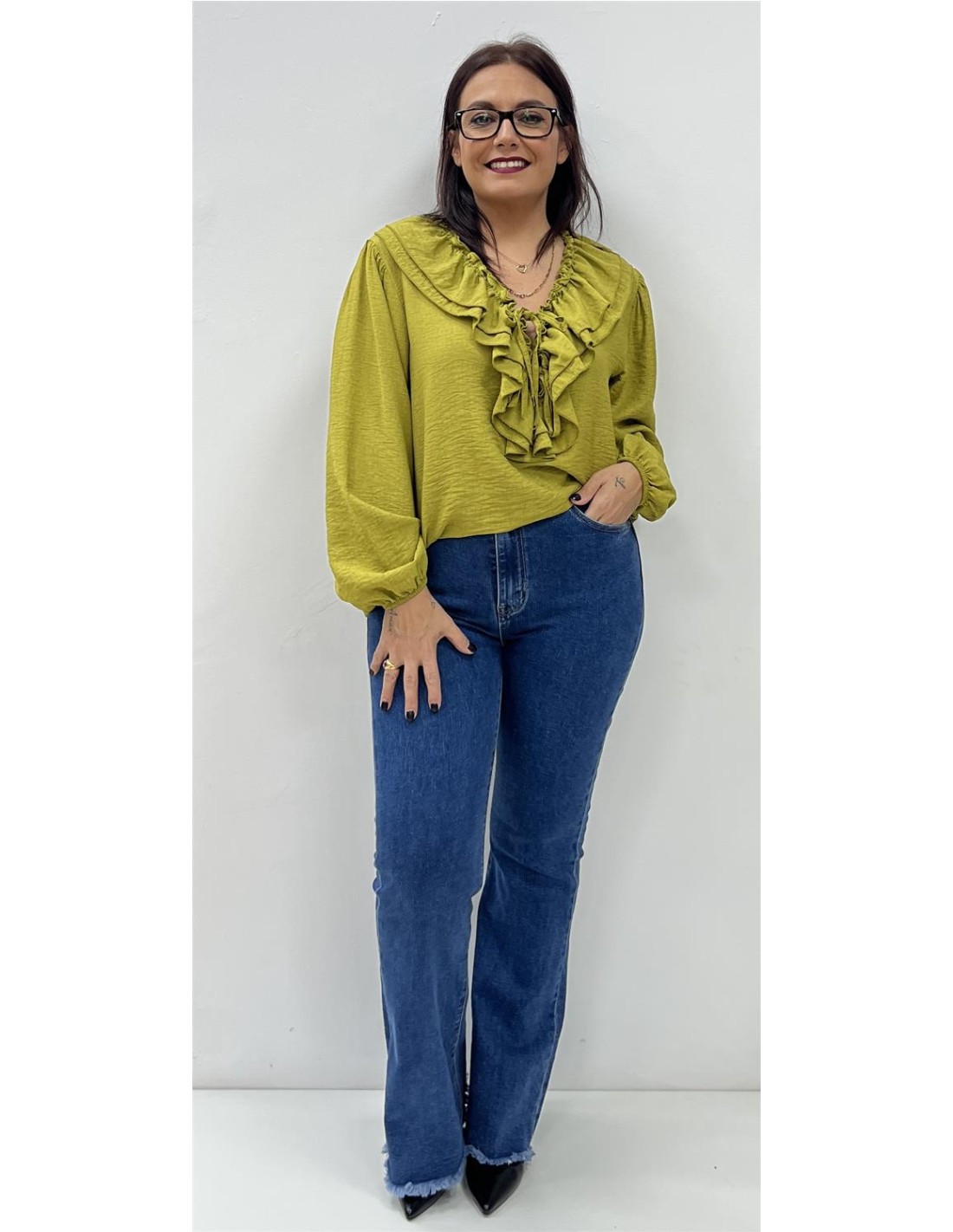 Cuerpo con volantes tipo chorreras en el cuello. Su talla puede dar desde una 36 hasta una 42. Combinado con el pantalón ZALIA y el tacón TC258