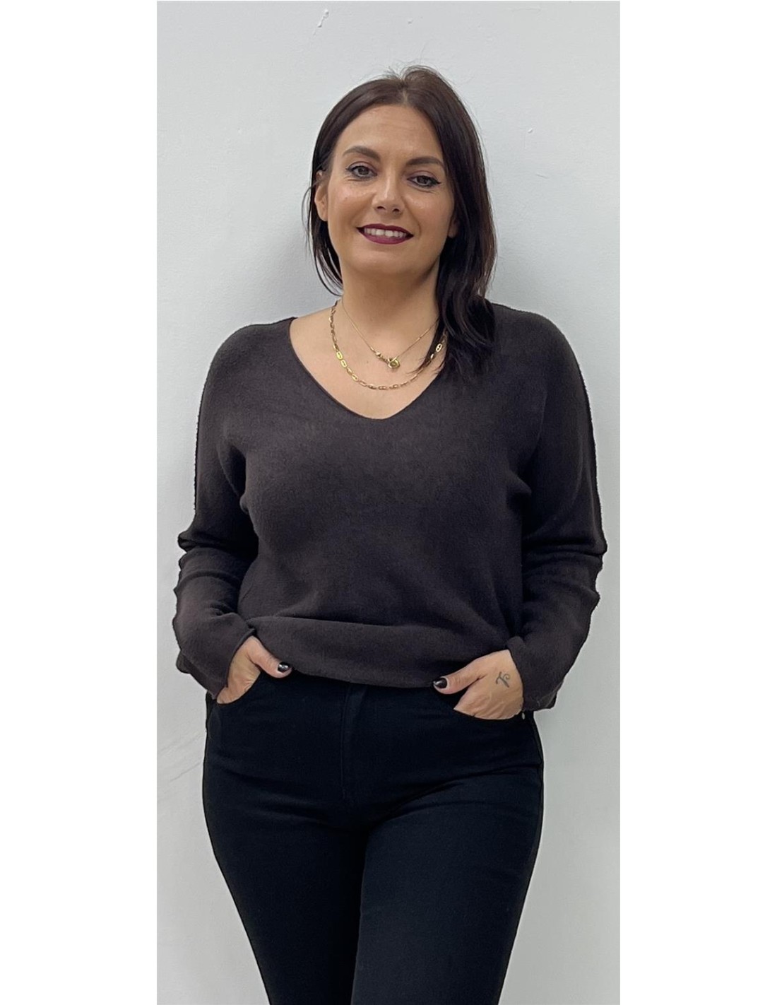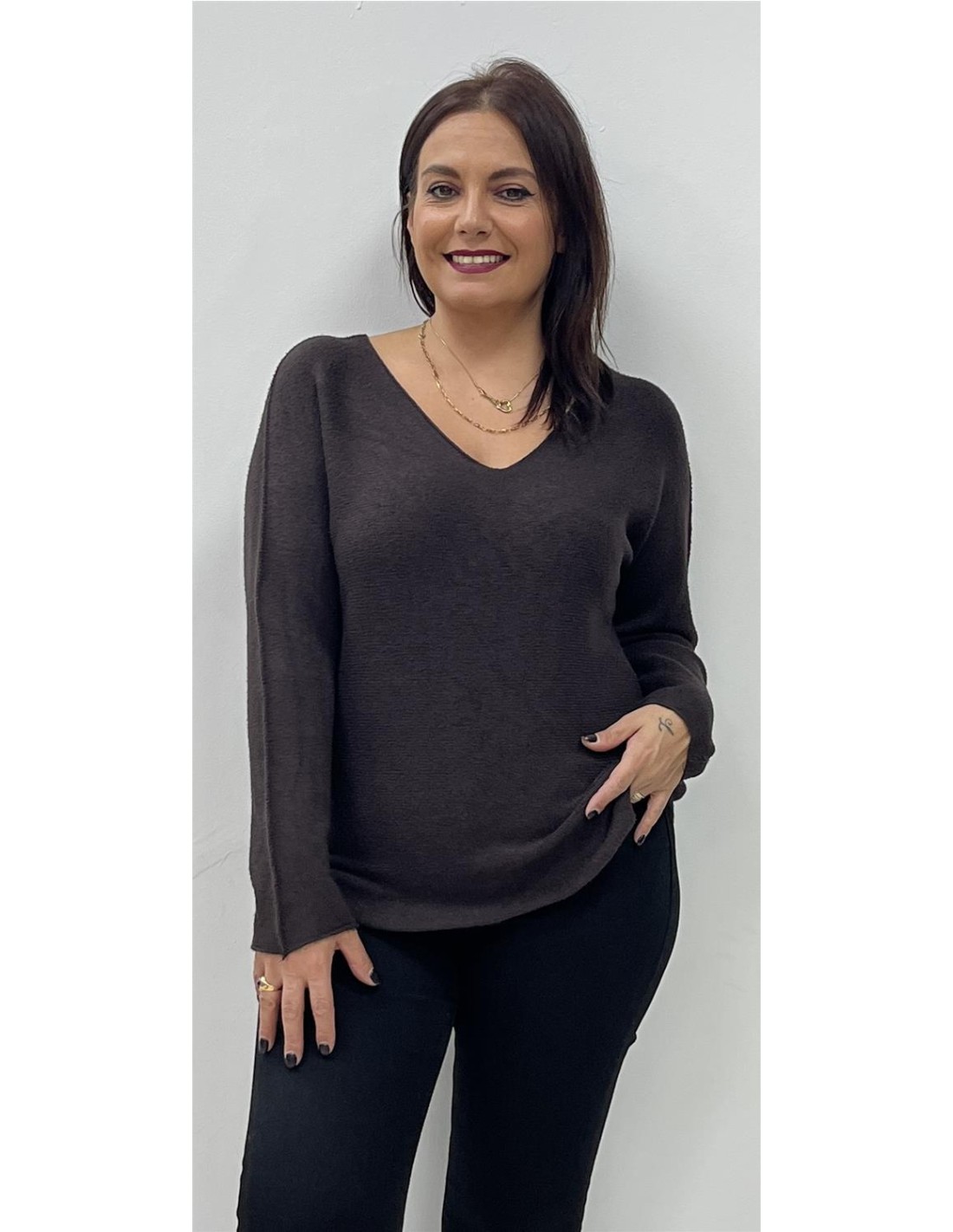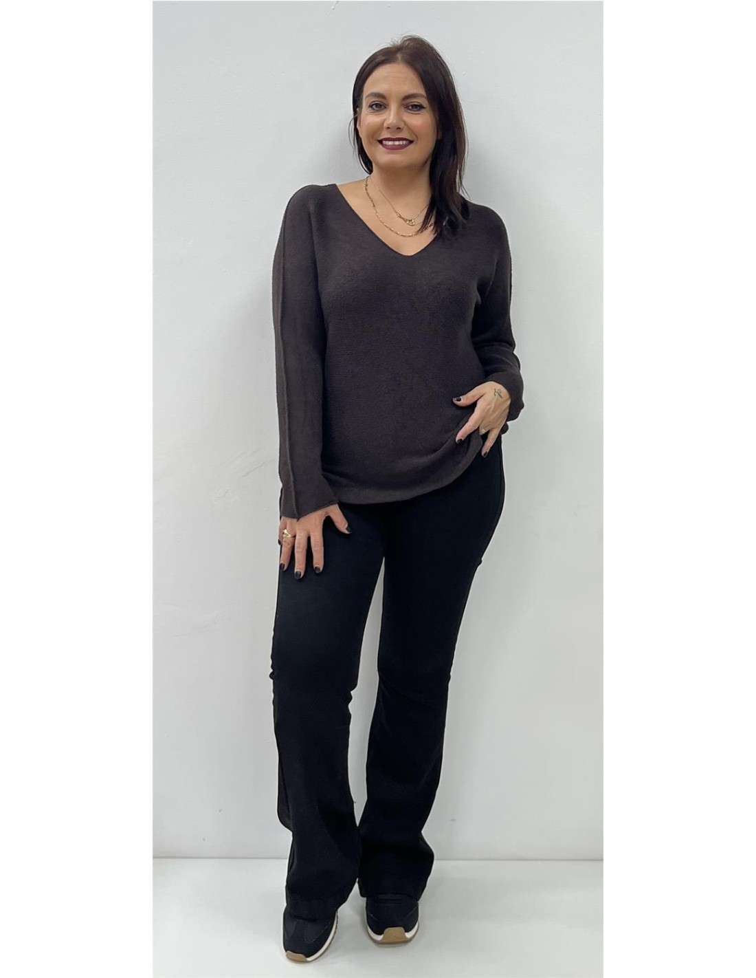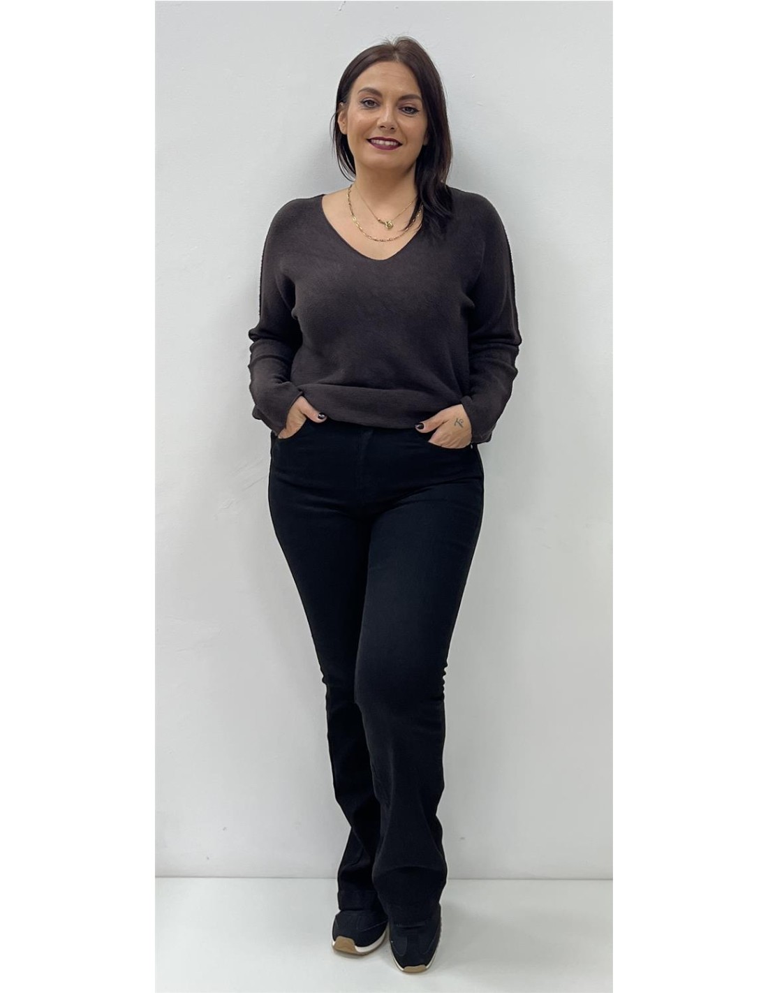 Jersey de punto con cuello de pico. Su talla puede dar desde una 36 hasta una 44. Combinado con el pantalón ZAFIRA
