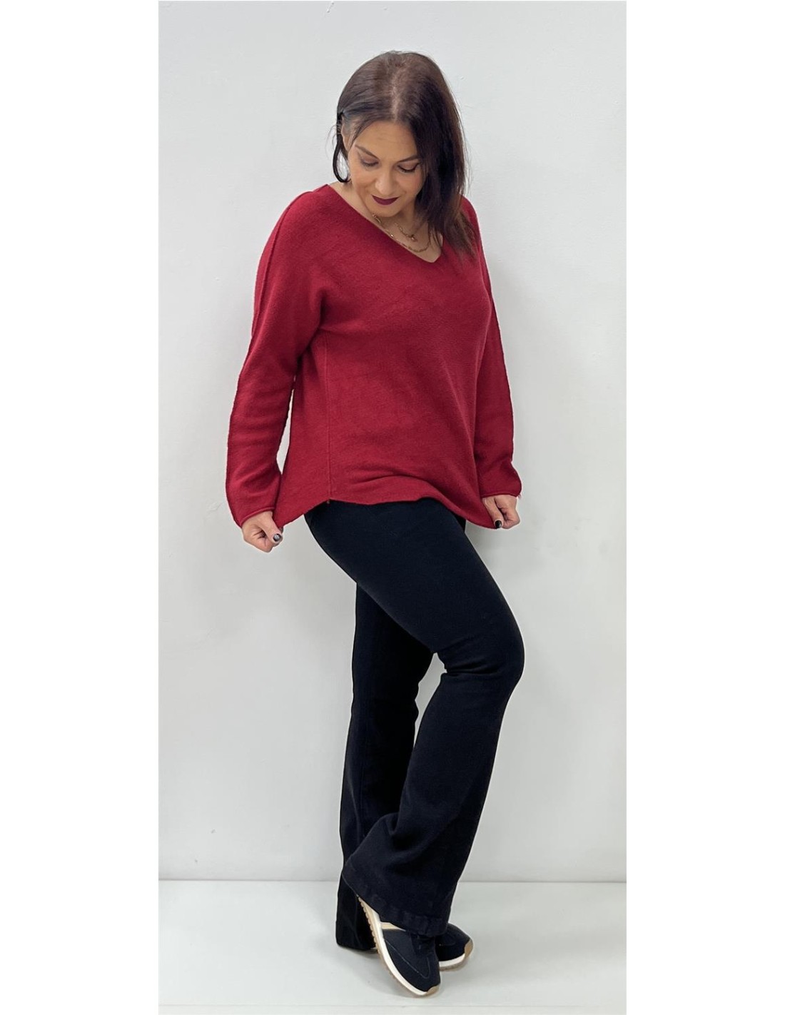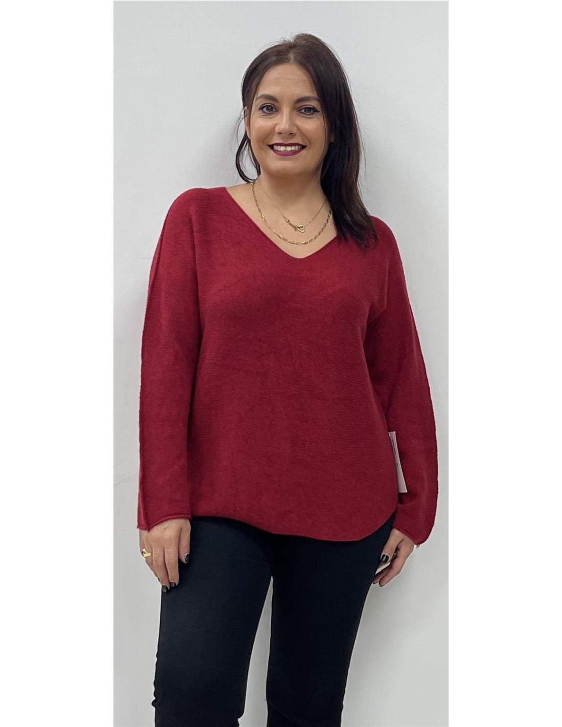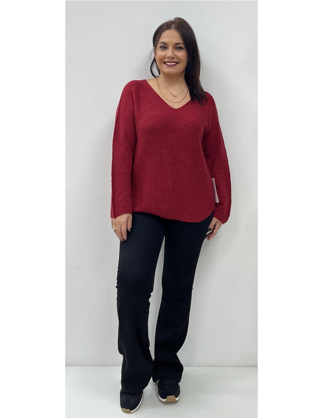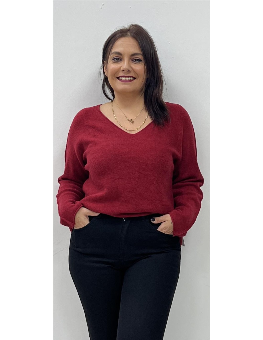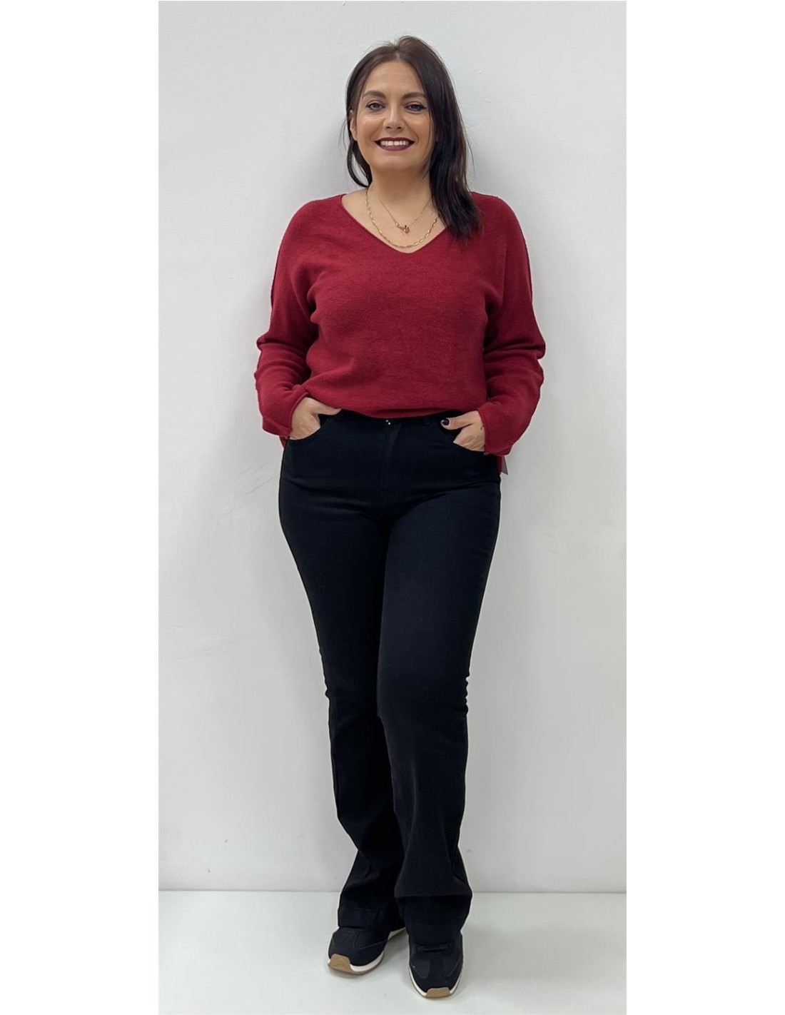 Jersey de punto con cuello de pico. Su talla puede dar desde una 36 hasta una 44. Combinado con el pantalón ZAFIRA