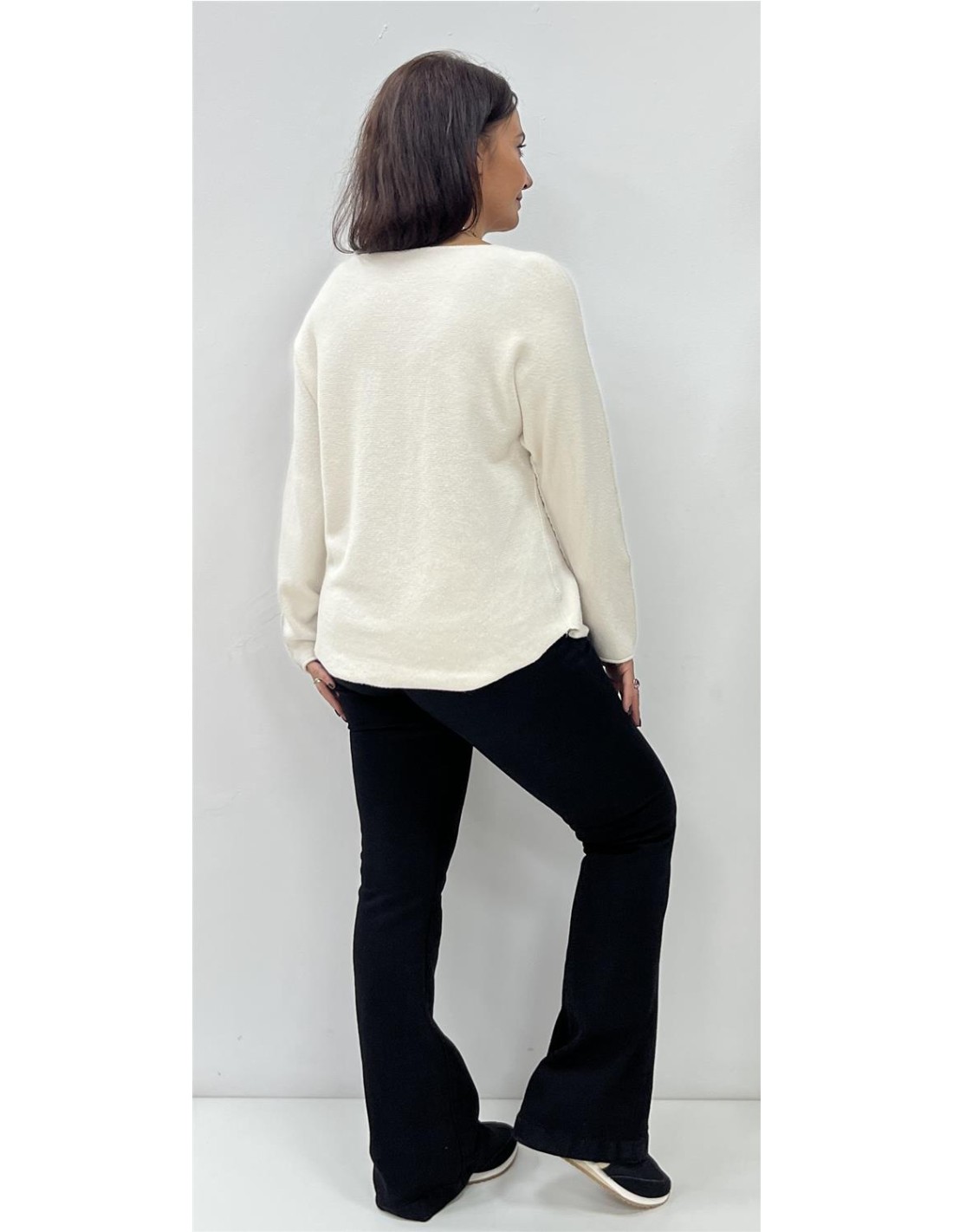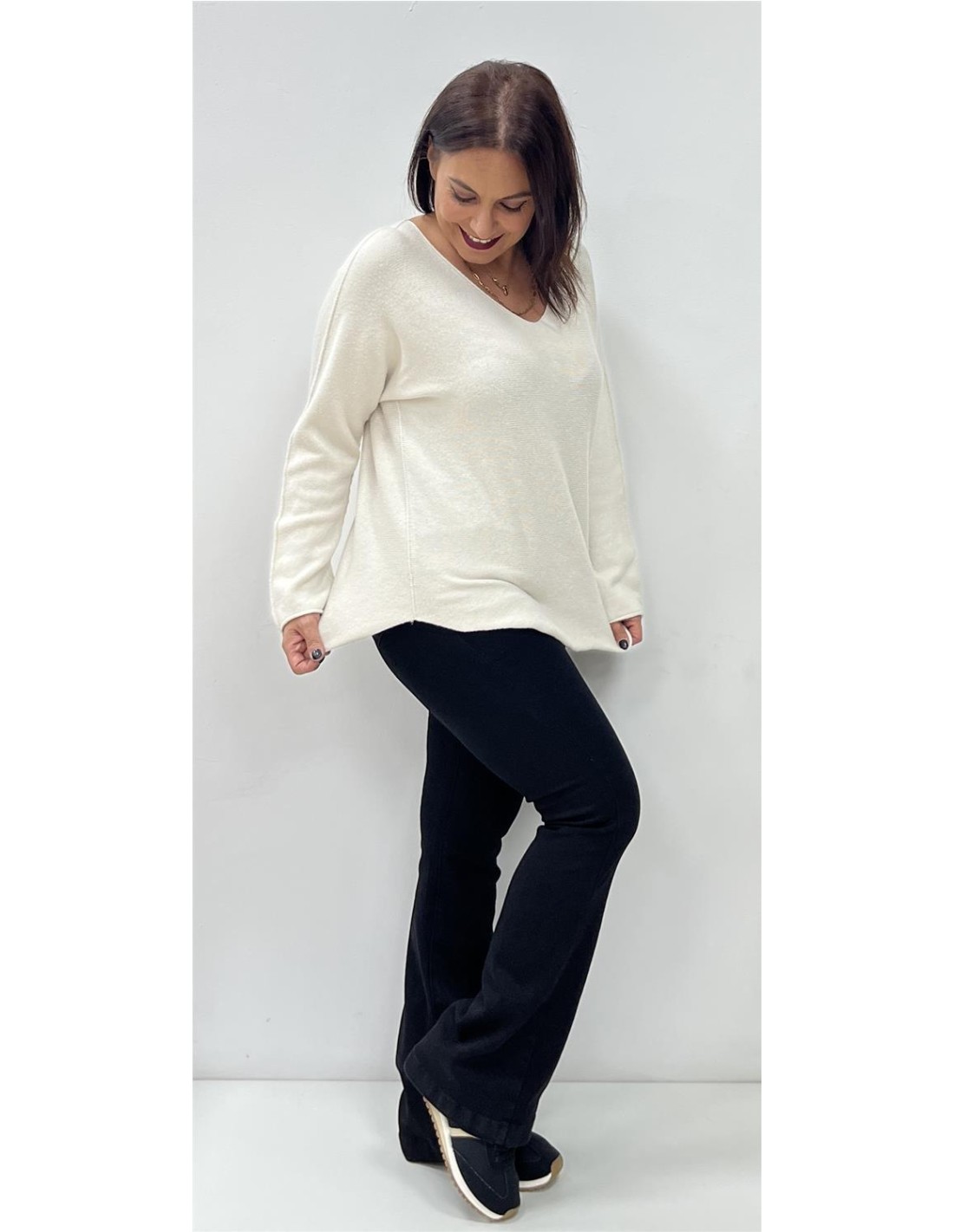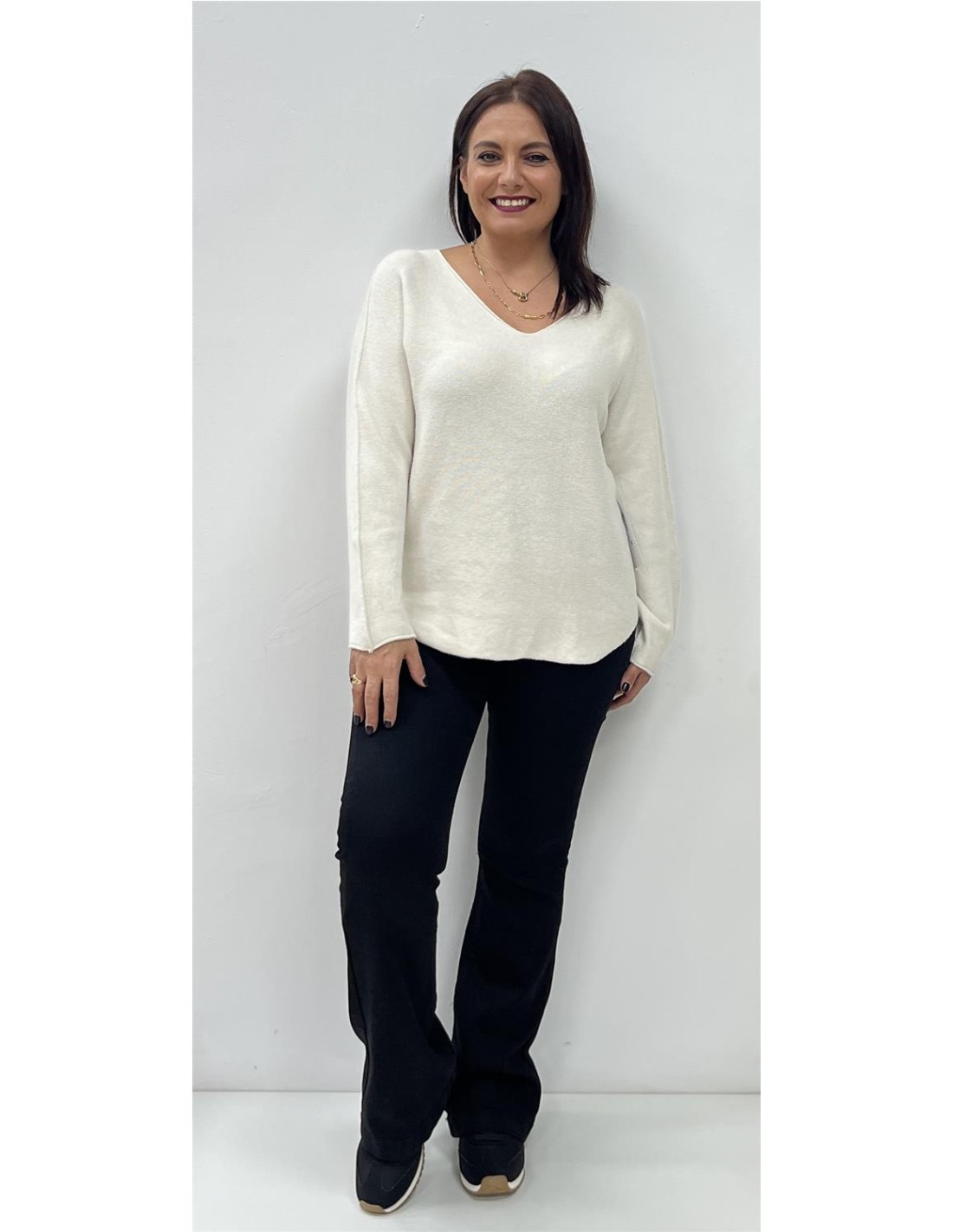 Jersey de punto con cuello de pico. Su talla puede dar desde una 36 hasta una 44. Combinado con el pantalón ZAFIRA