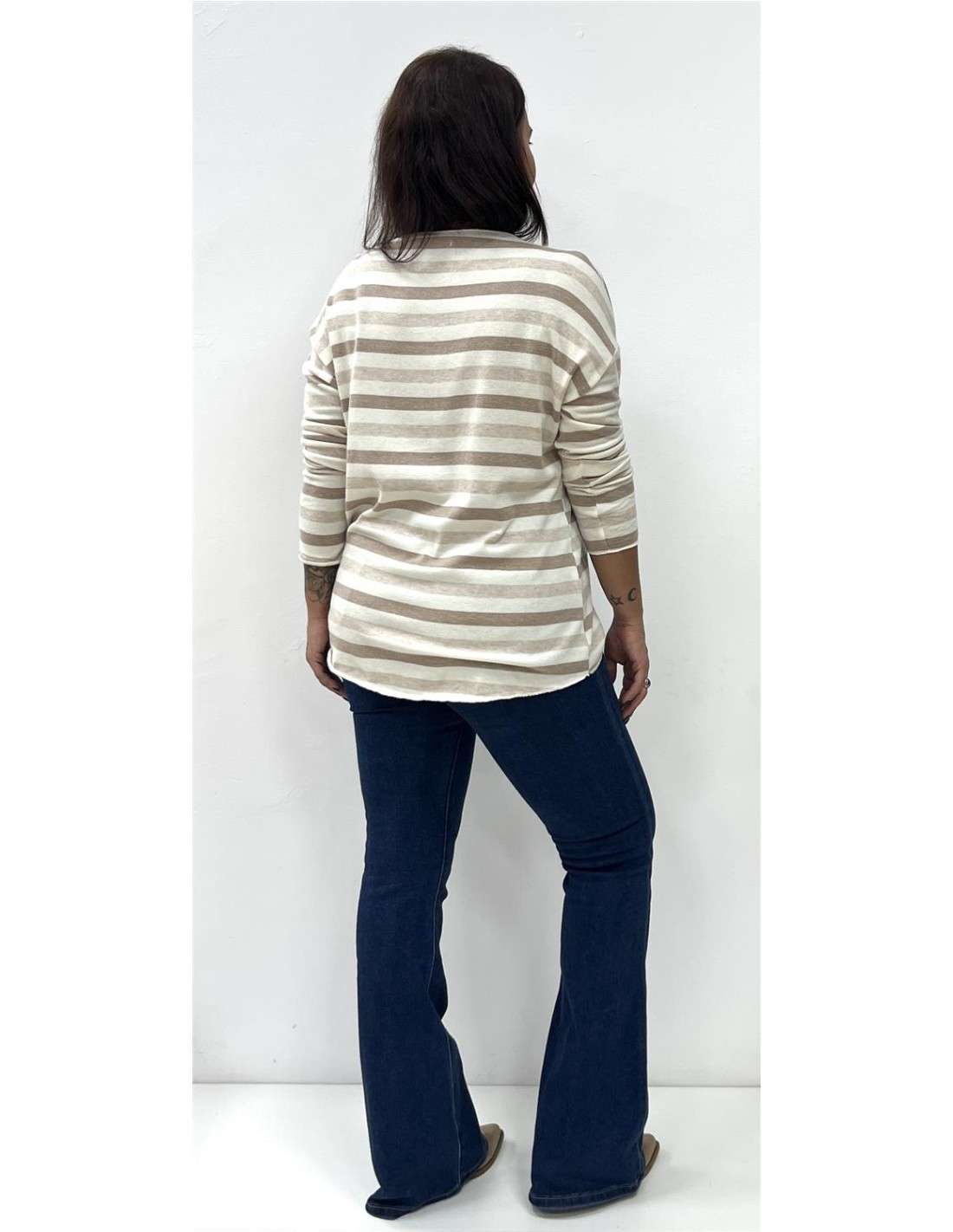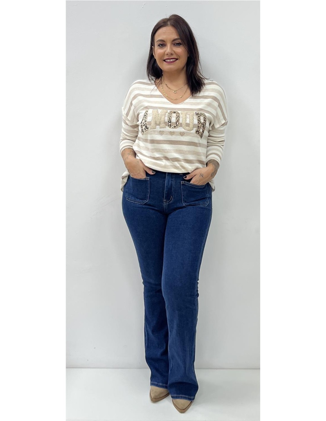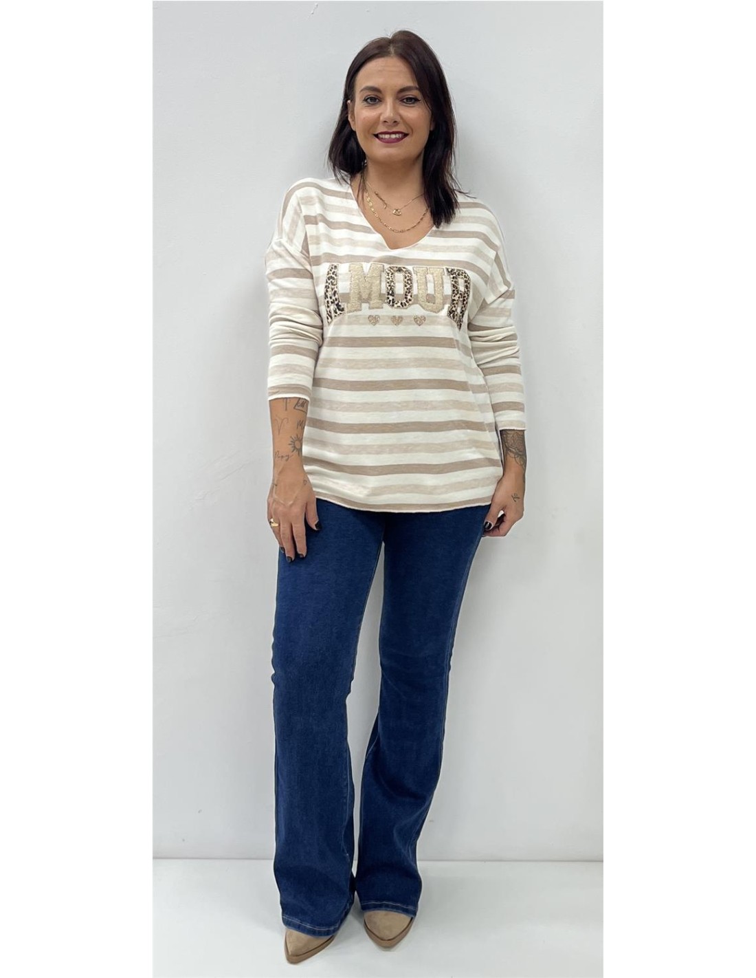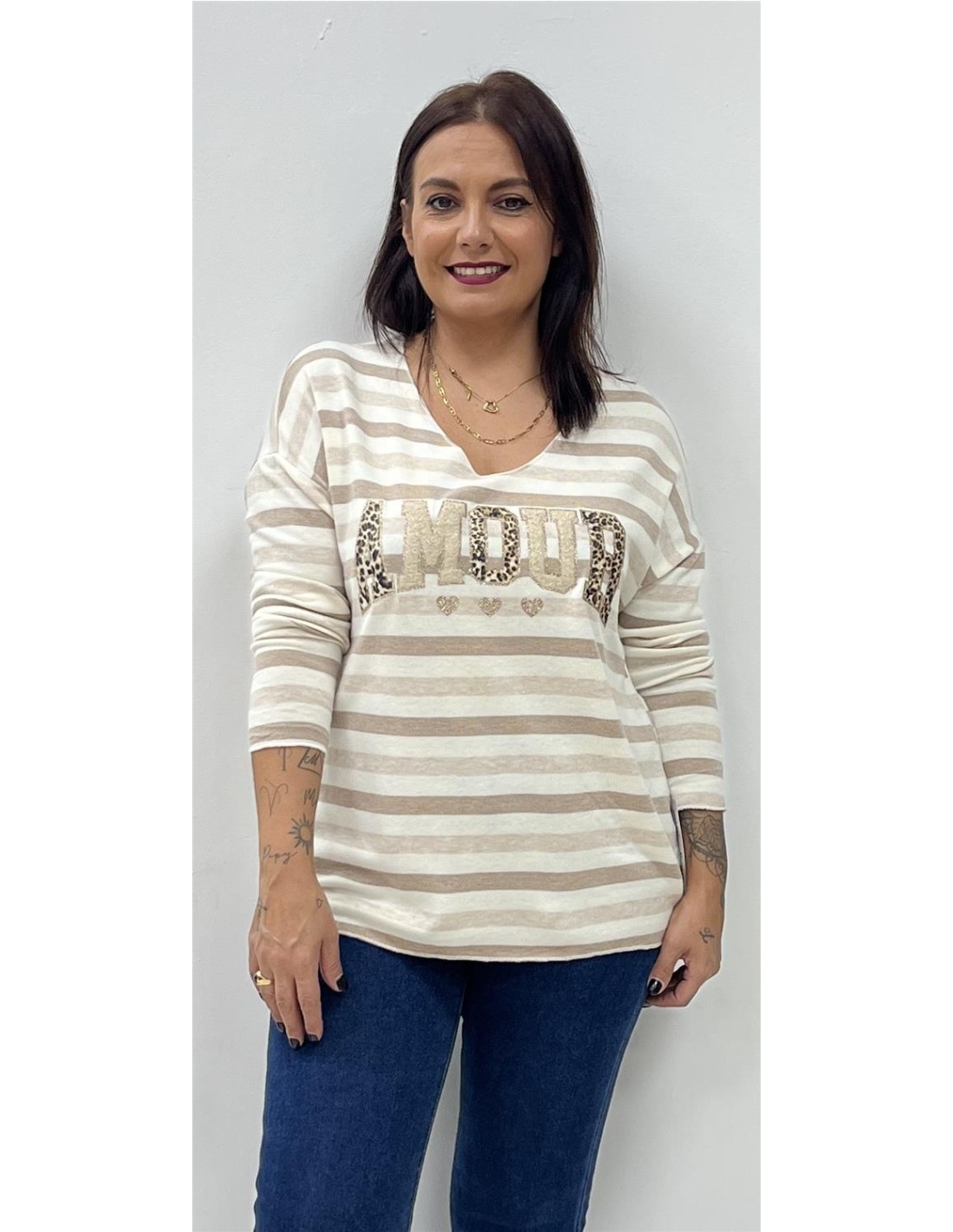 Jersey de rayas AMOUR con cuello de pico. Su talla puede dar desde una 36 hasta una 44. Combinado con el bolso BL45-533