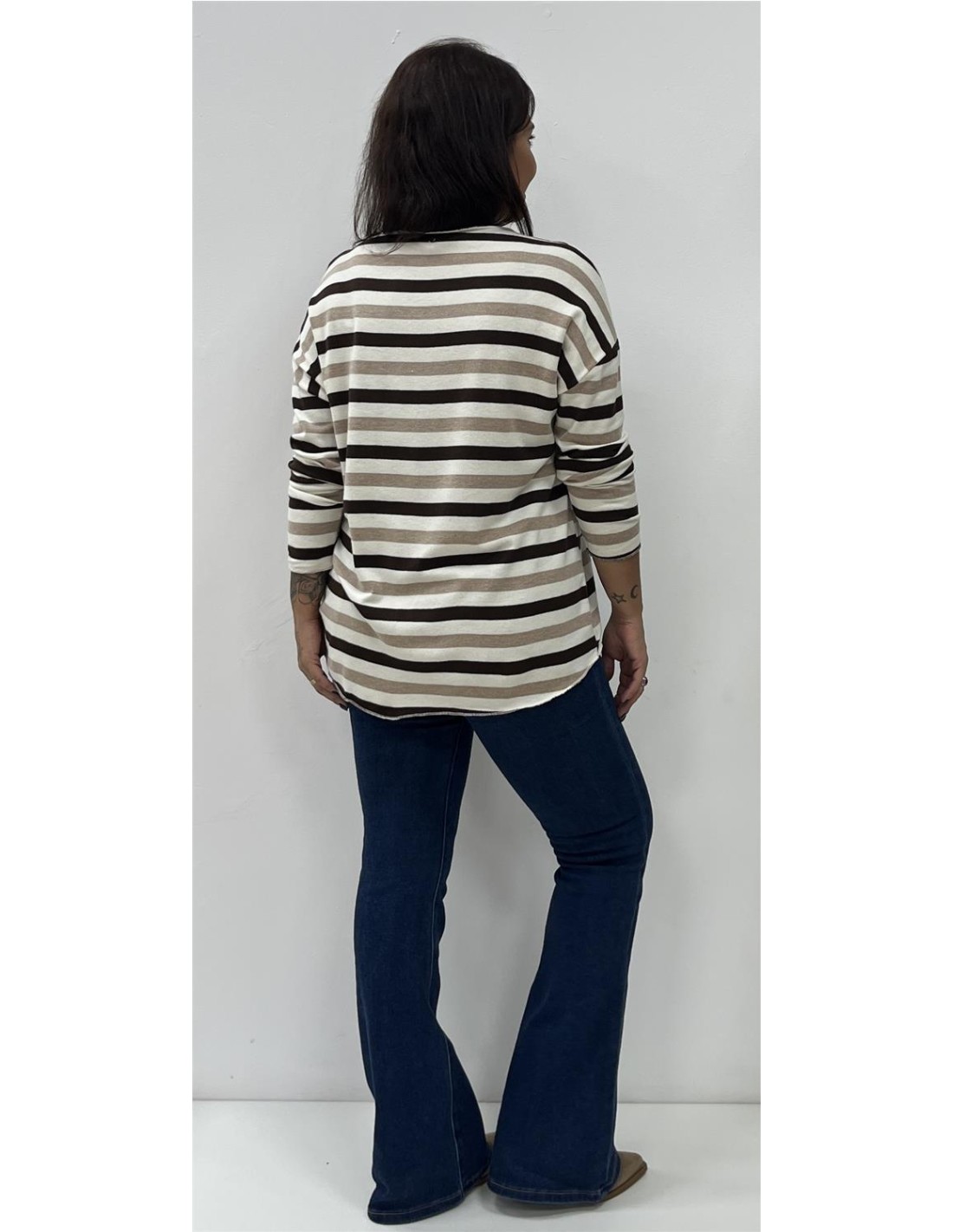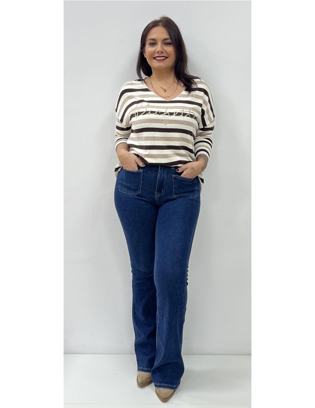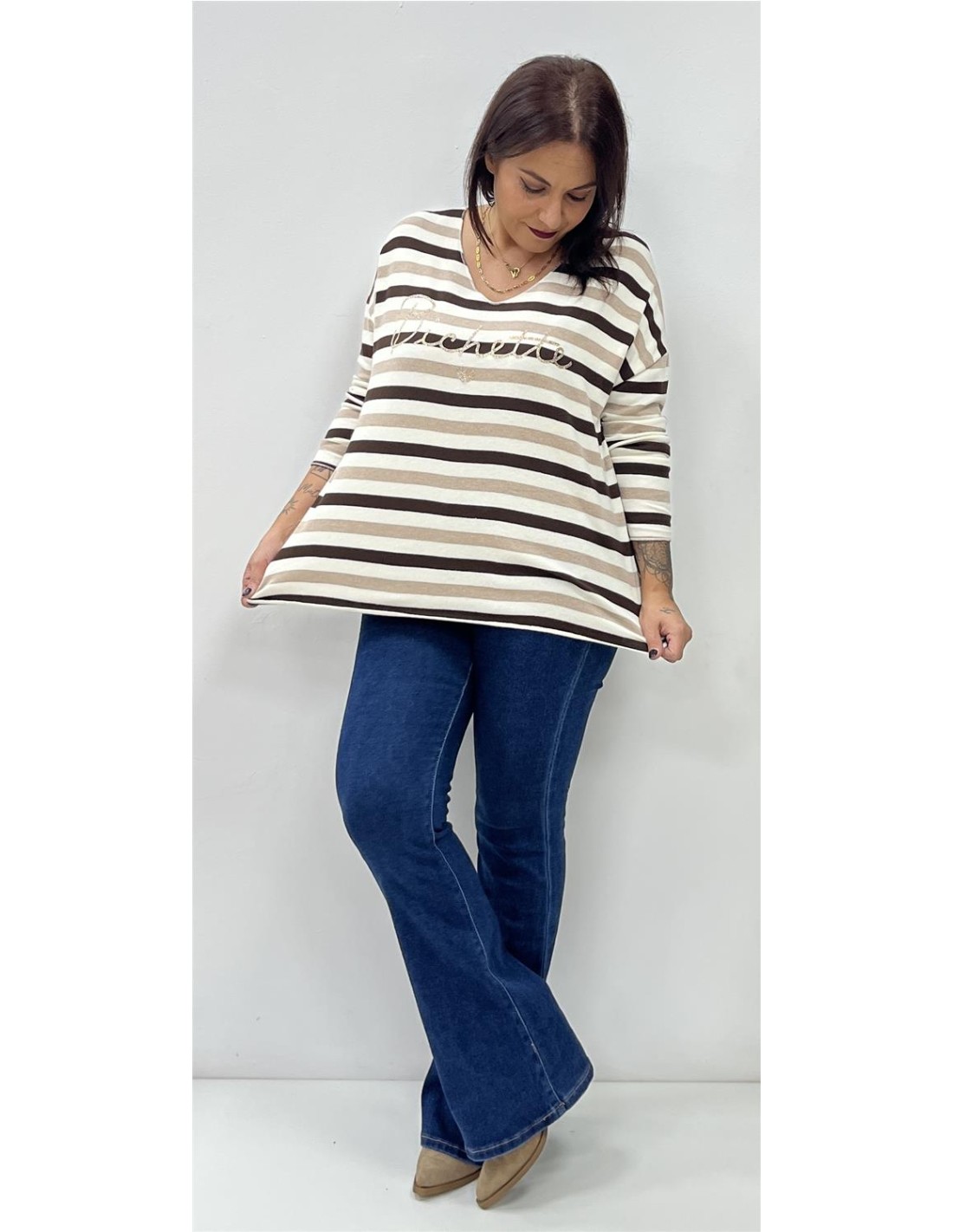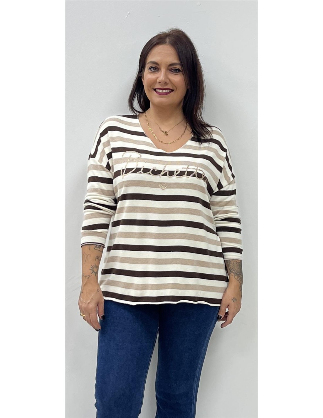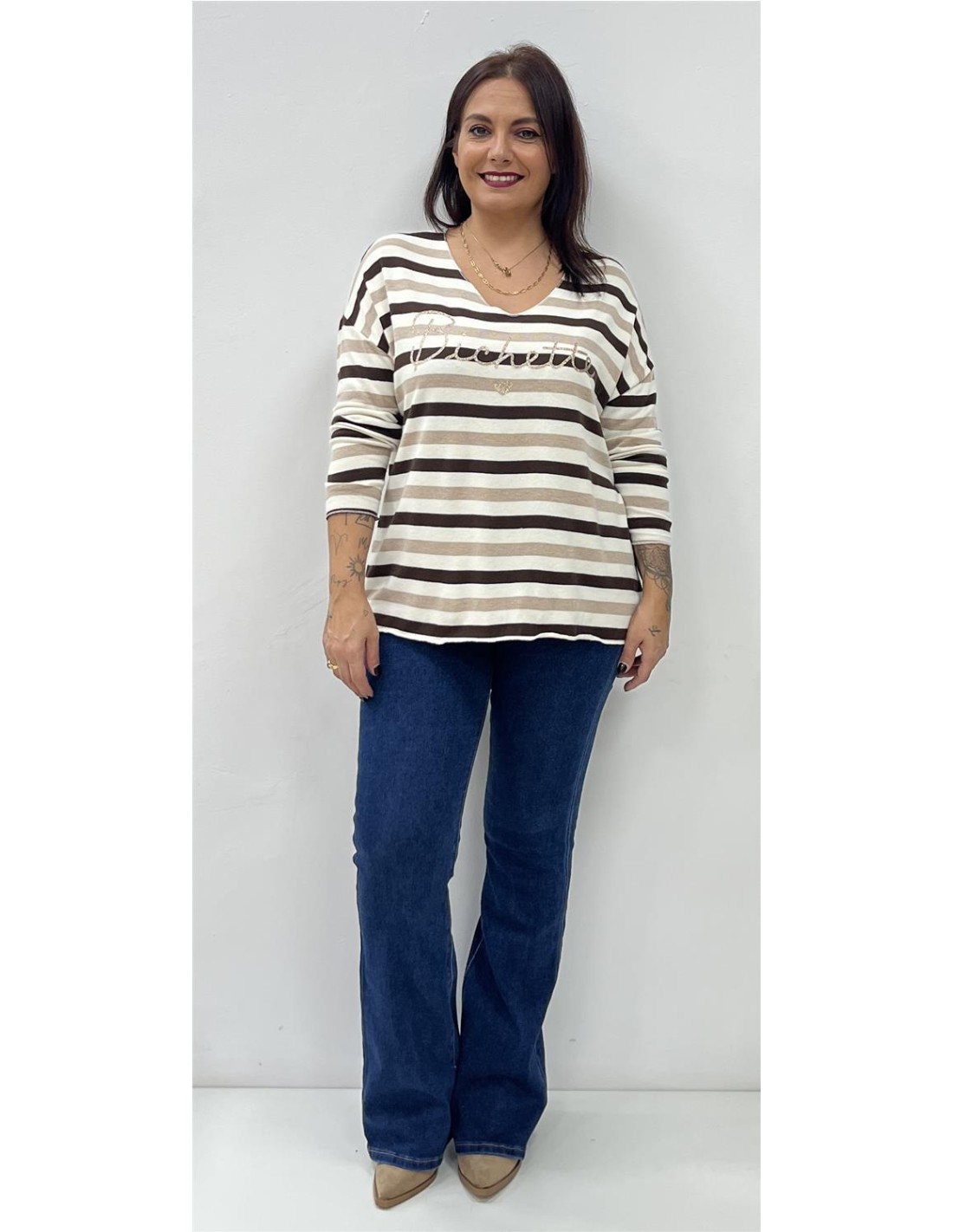 Jersey de punto de rayas con cuello de pico. Su talla puede dar desde una 36 hasta una 44. Combinado con el pantalón ZOE