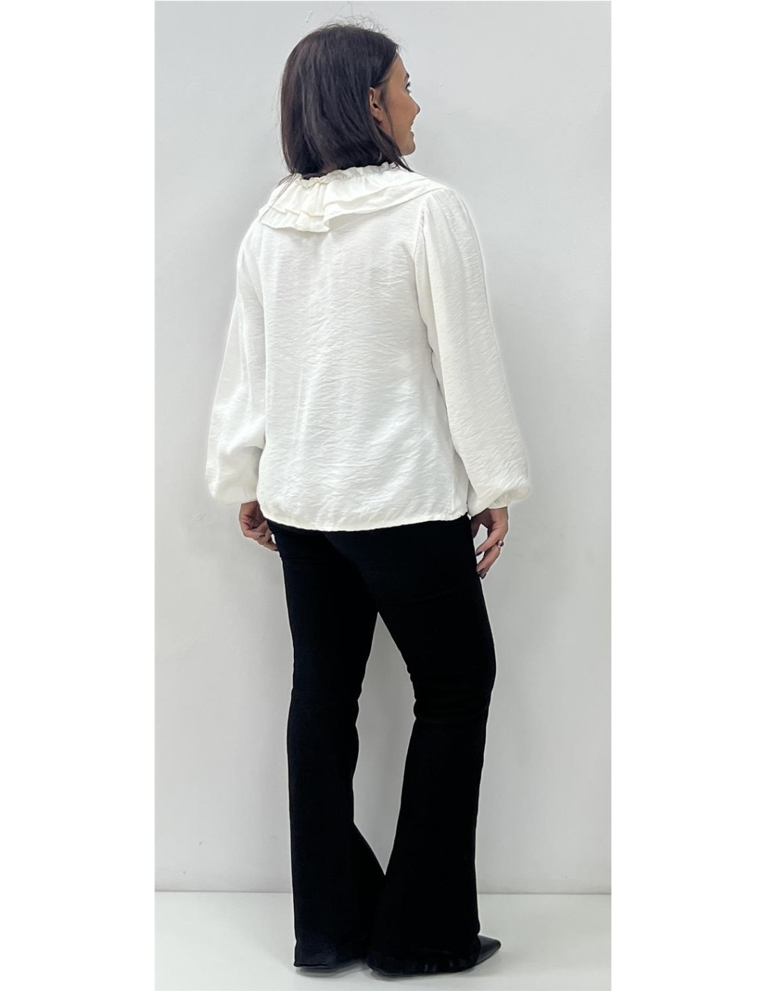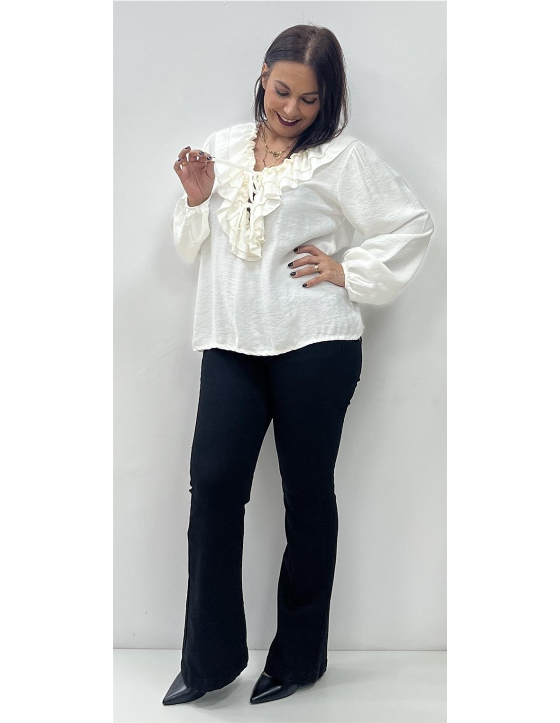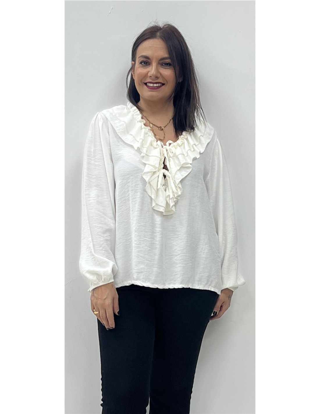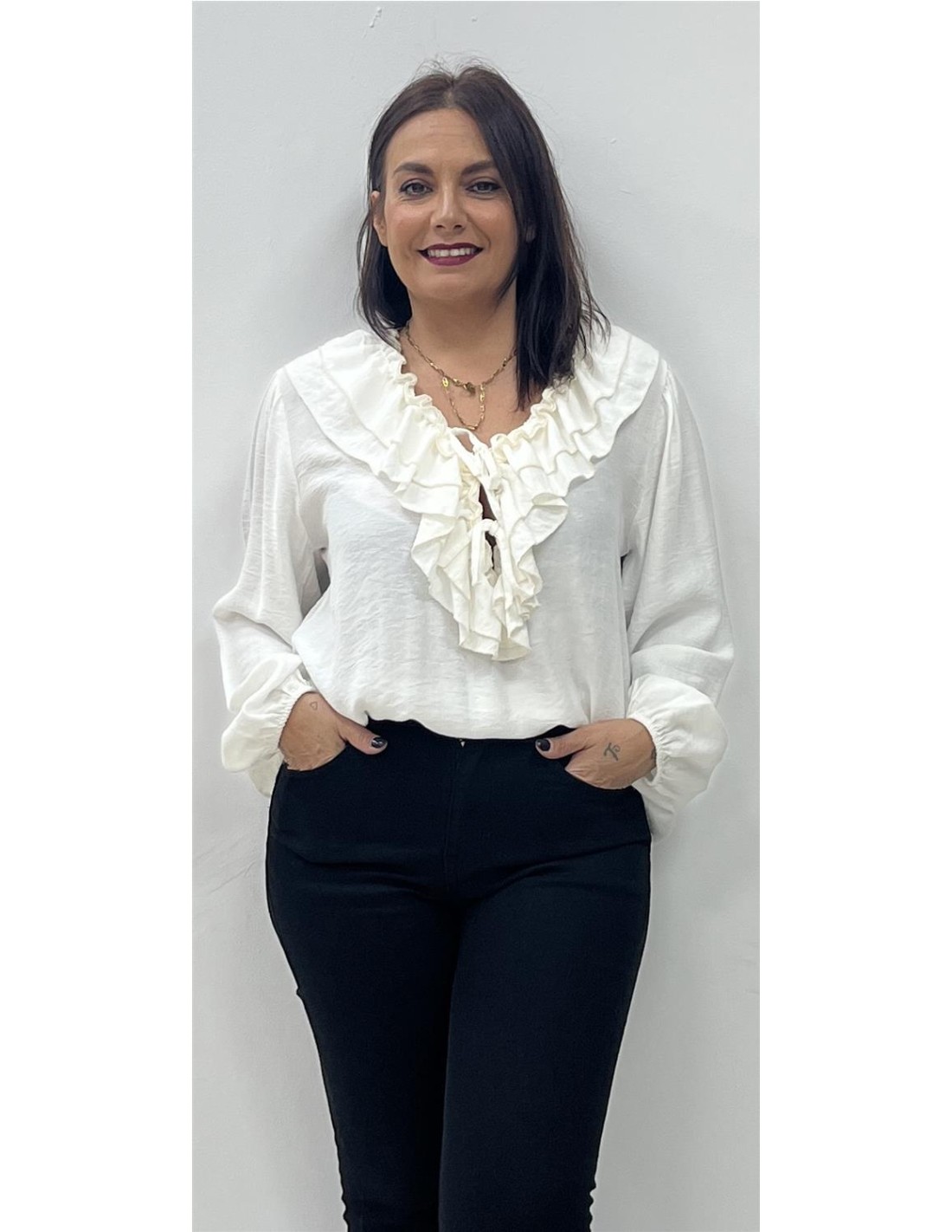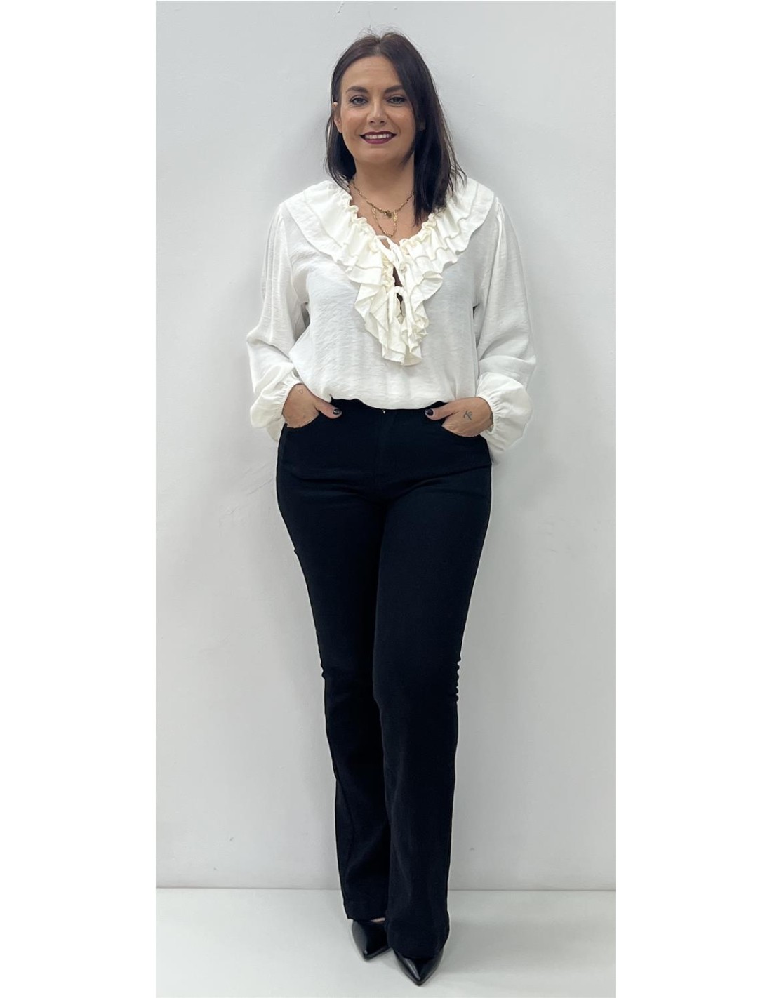 Cuerpo con volantes tipo chorreras en el cuello. Su talla puede dar desde una 36 hasta una 42. Combinado con el pantalón ZALIA y el tacón TC258