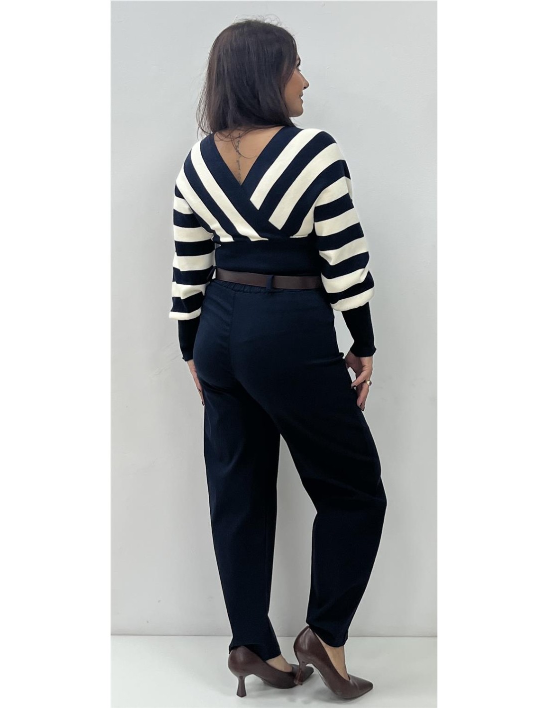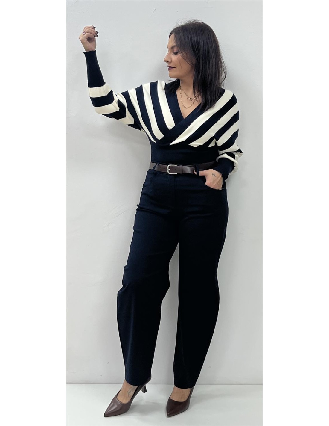 Punto escote cruzado de rayas.Su talla va desde 34 hasta 42. Combinado con el TC258 y el negro con el pantalon marta.