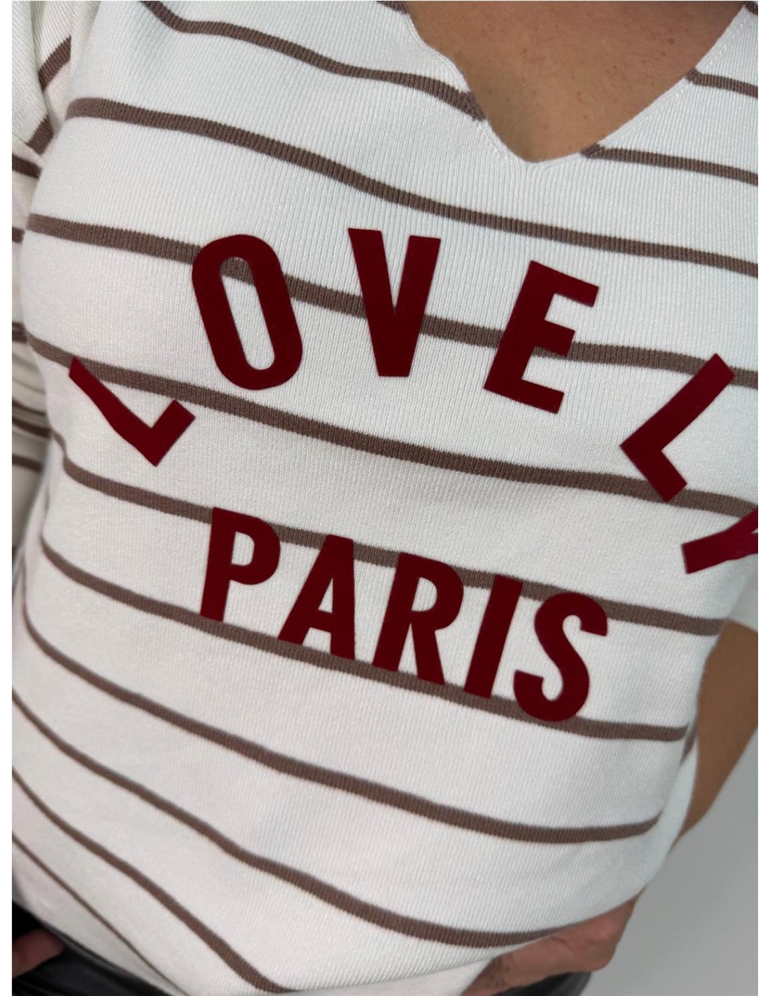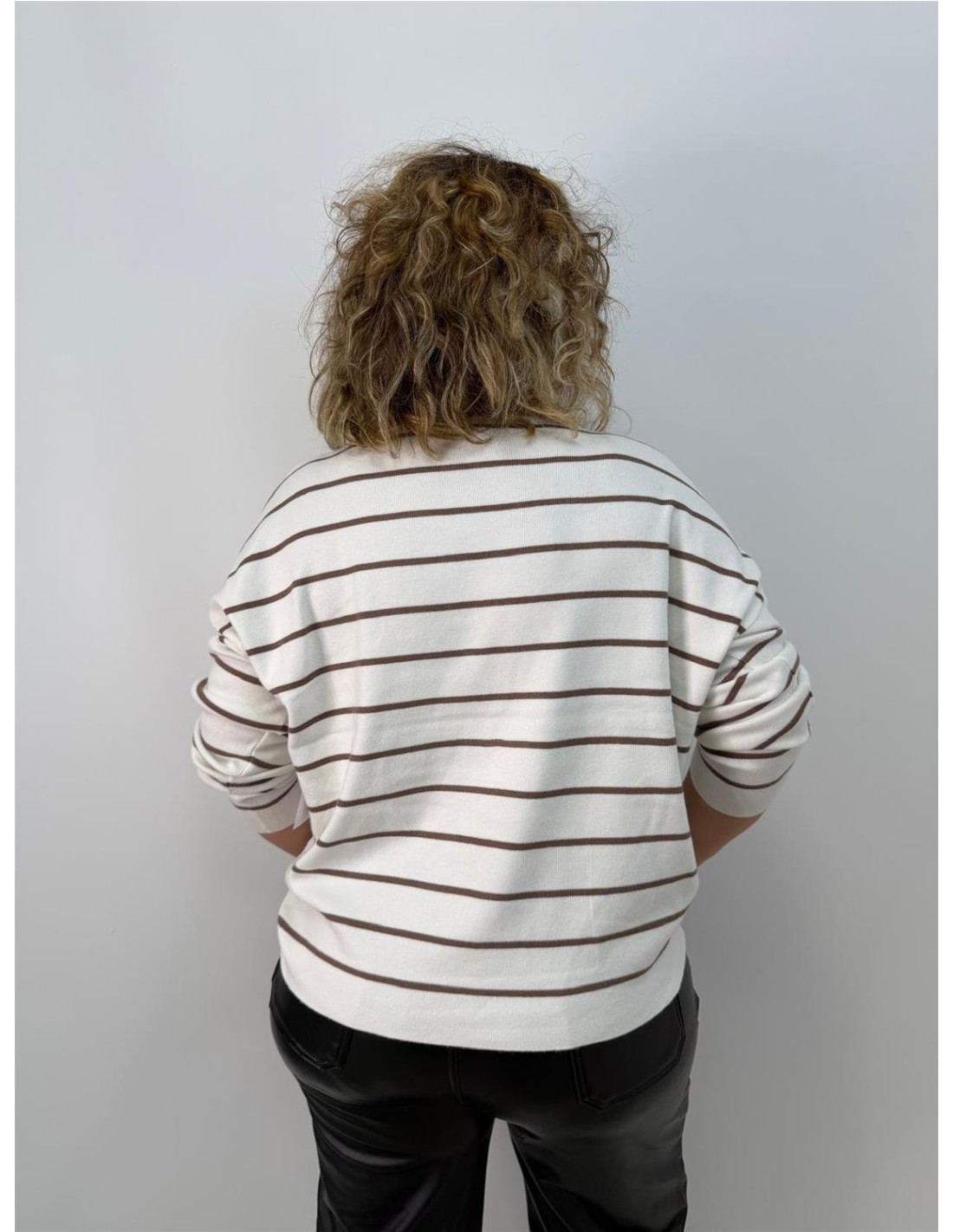 De punto, con rayas, cuello de pico. Su talla va desde una 36 hasta una 46 aproximadamente.