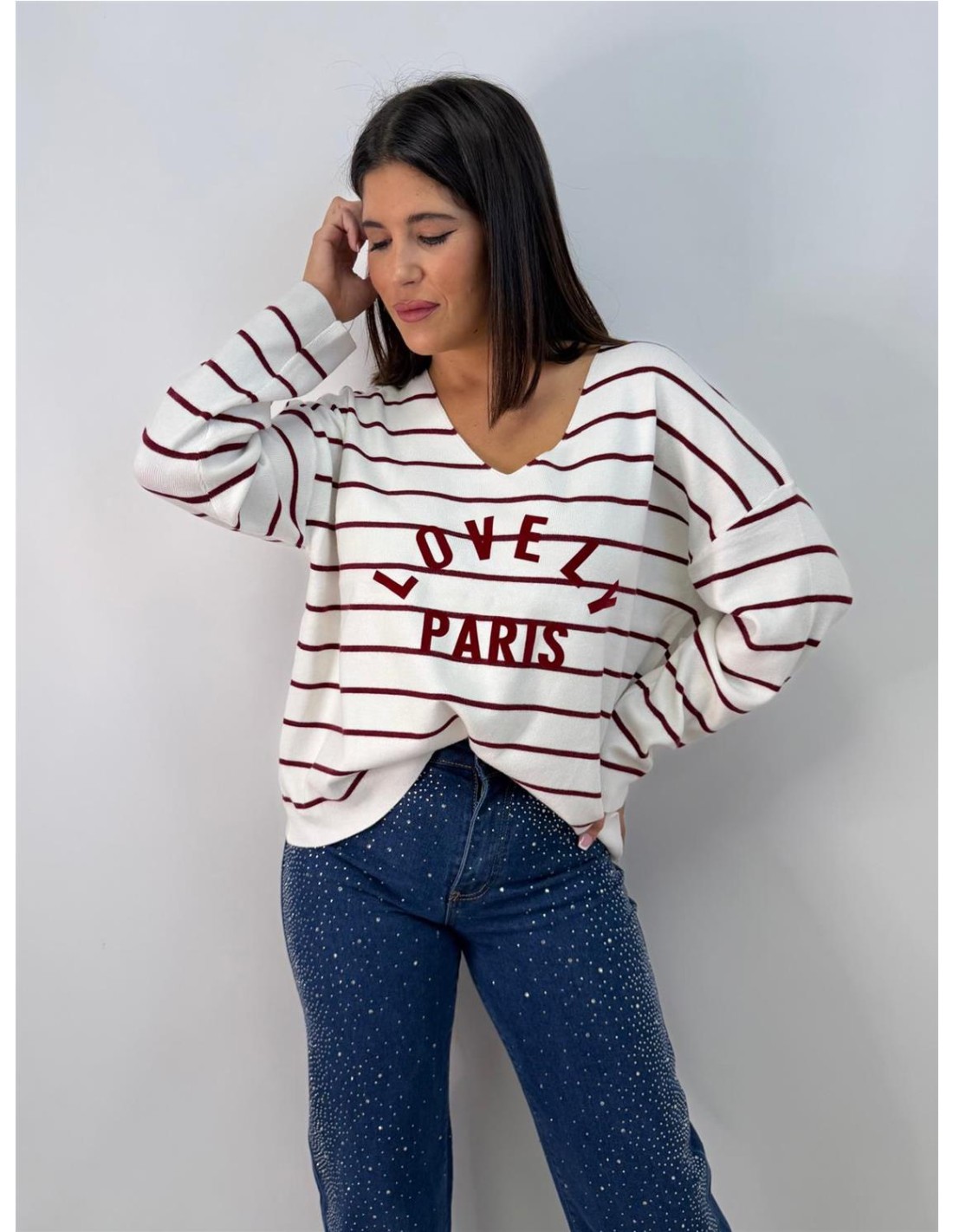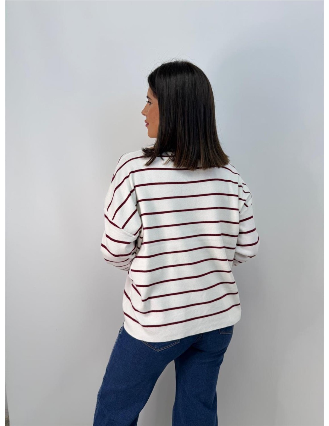De punto, con rayas, cuello de pico. Su talla va desde una 36 hasta una 46 aproximadamente.