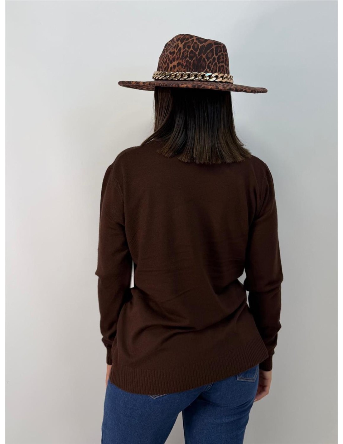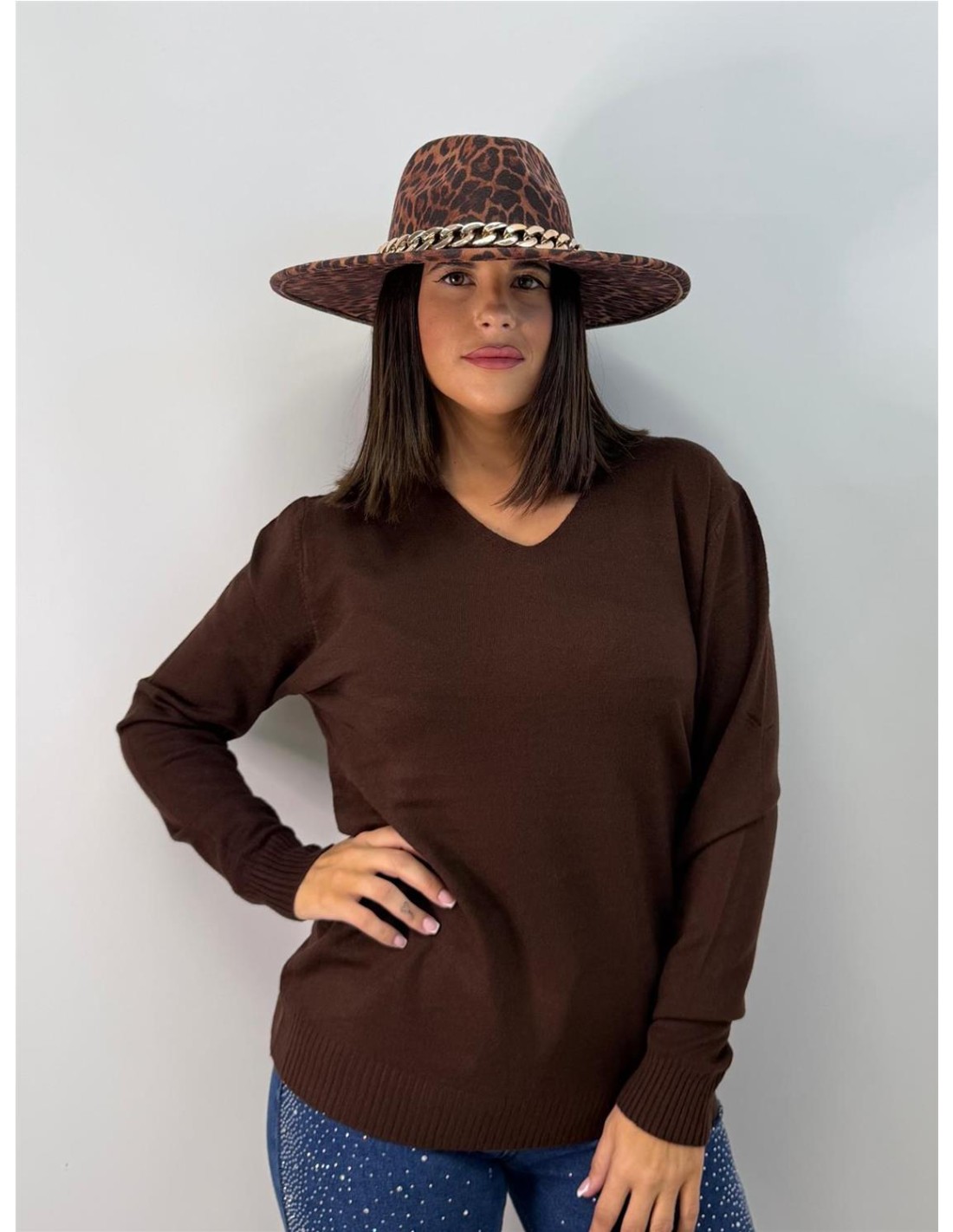 Cuello de pico, de punto, mangas largas. Su talla va desde una 36 hasta una 44 aproximadamente.