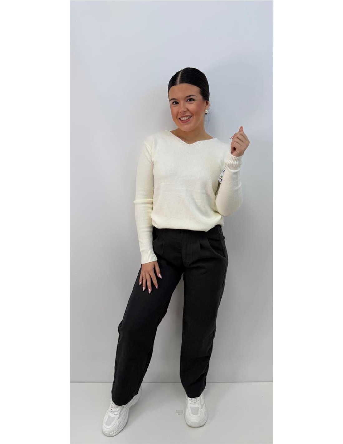 De cuello de pico, de punto, mangas largas. Su talla va desde una 36 hasta una 42-44 aproximadamente.